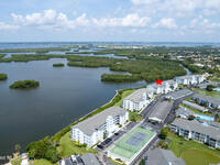 VERY RARE 2 PRIVATE-1 CAR GARAGES CONVEY!! Direct Riverfront with views of the Banana River and the Thousand Islands Preserve! You will enjoy watching marine wildlife from your condo all day, heron, dolphin, manatee, osprey and more! West facing unit with amazing sunsets. This well-maintained unit is ready for you. Primary bathroom has been beautifully updated with large walk-in shower and closet. Decorated in pleasing neutral tones to help you relax and enjoy the view. Plantation shutters throughout. Windows are high impact and storm shutters on the lanai. For the active lifestyle Harbor Isles Community offers 2 heated pools plus 1 heated lap pool, 2 tennis and pickleball courts w/ lights, sauna, exercise room, clubhouse, riverfront dock and free RV & boat storage. Ramp Road Park next door to launch your watercraft. The Atlantic Ocean is just 2 blocks away. Community conveniently located near Cocoa Beach Playhouse and Downtown Cocoa Beach for all your entertainment enjoyment!