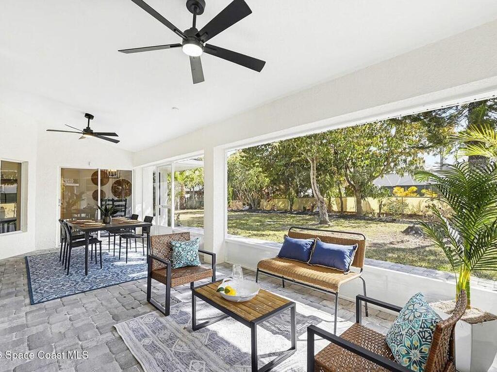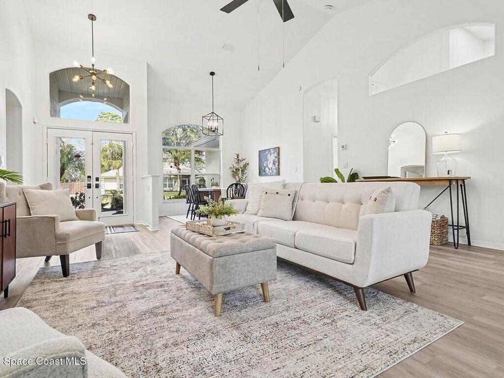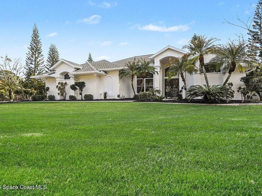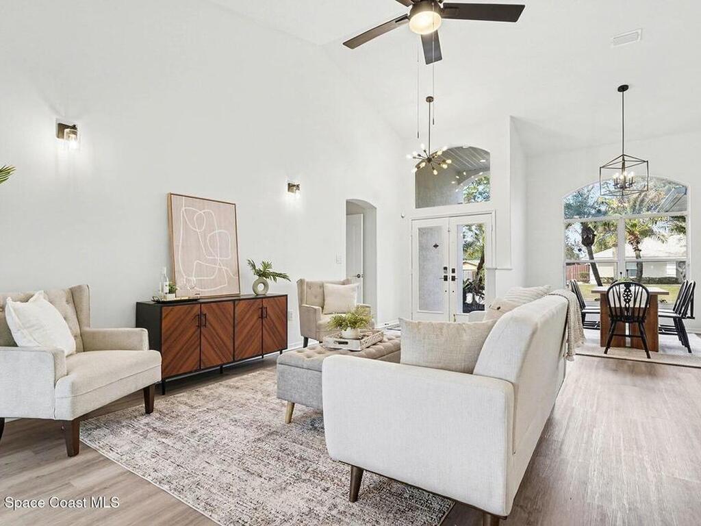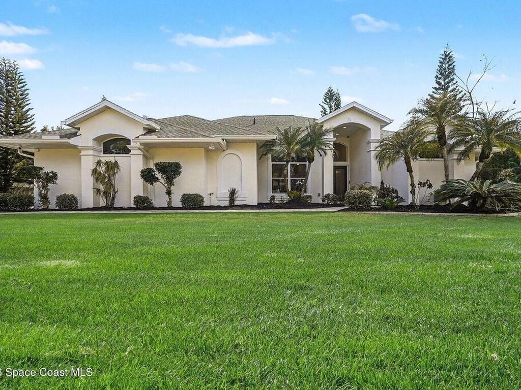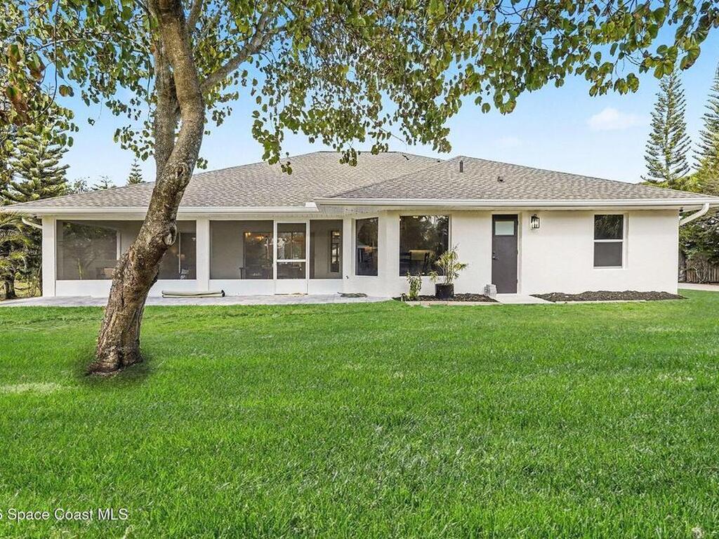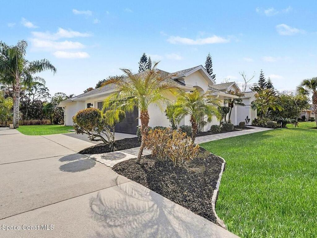 Located in the sought-after Lockmar Estates in Palm Bay along the Florida Space Coast, this beautifullyrenovated, move-in ready home sits on a spacious .34-acre lot. Enjoy elegant curb appeal with lush tropicallandscaping and an expanded 2-car garage. Inside discover an airy, light-filled open floor plan withcathedral ceilings, sliding doors, tall windows featuring 3 bedrooms, 2 bathrooms. The gourmet kitchenboasts quartz counters, stainless steel appliances, and custom cabinetry. The serene primary suite offers2 walk-in closets and a spa-like bath. Relax on the large screened lanai overlooking your private oasis.With a new roof (2023), thoughtful updates and close to top schools, shop