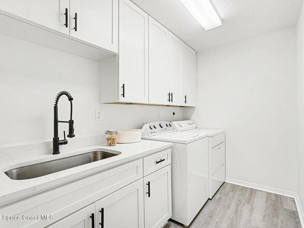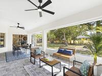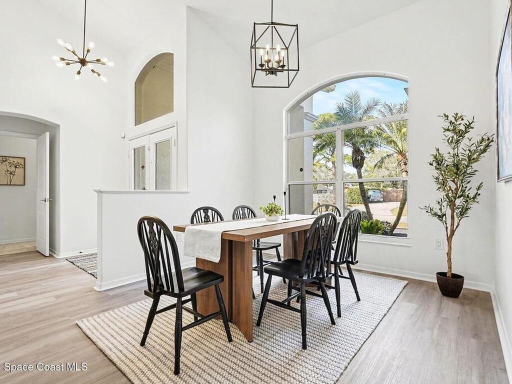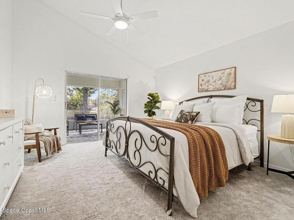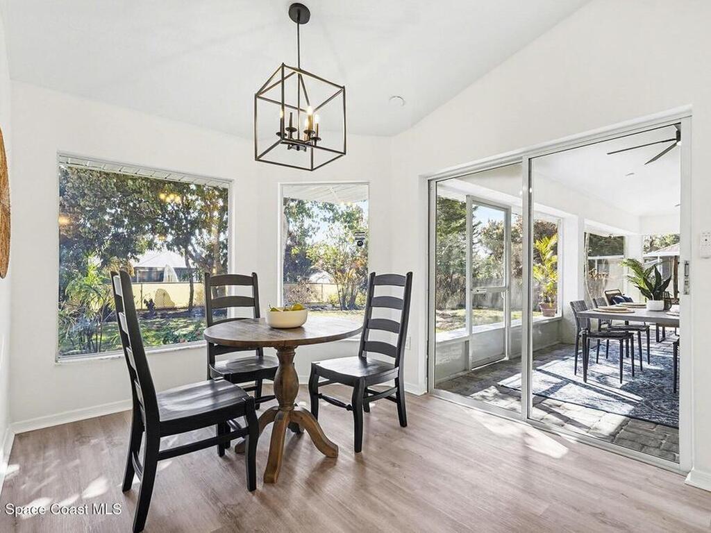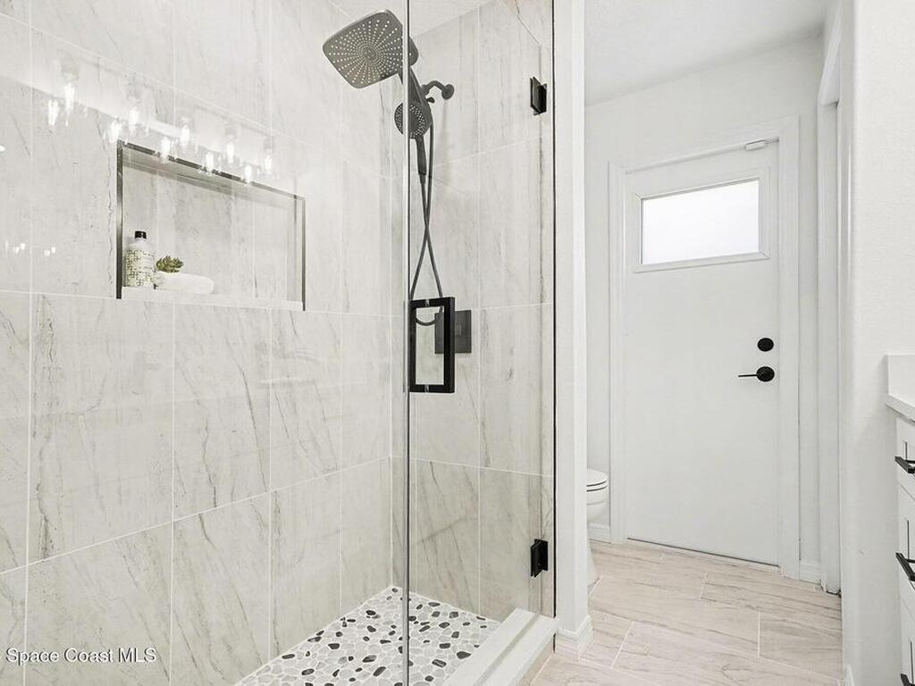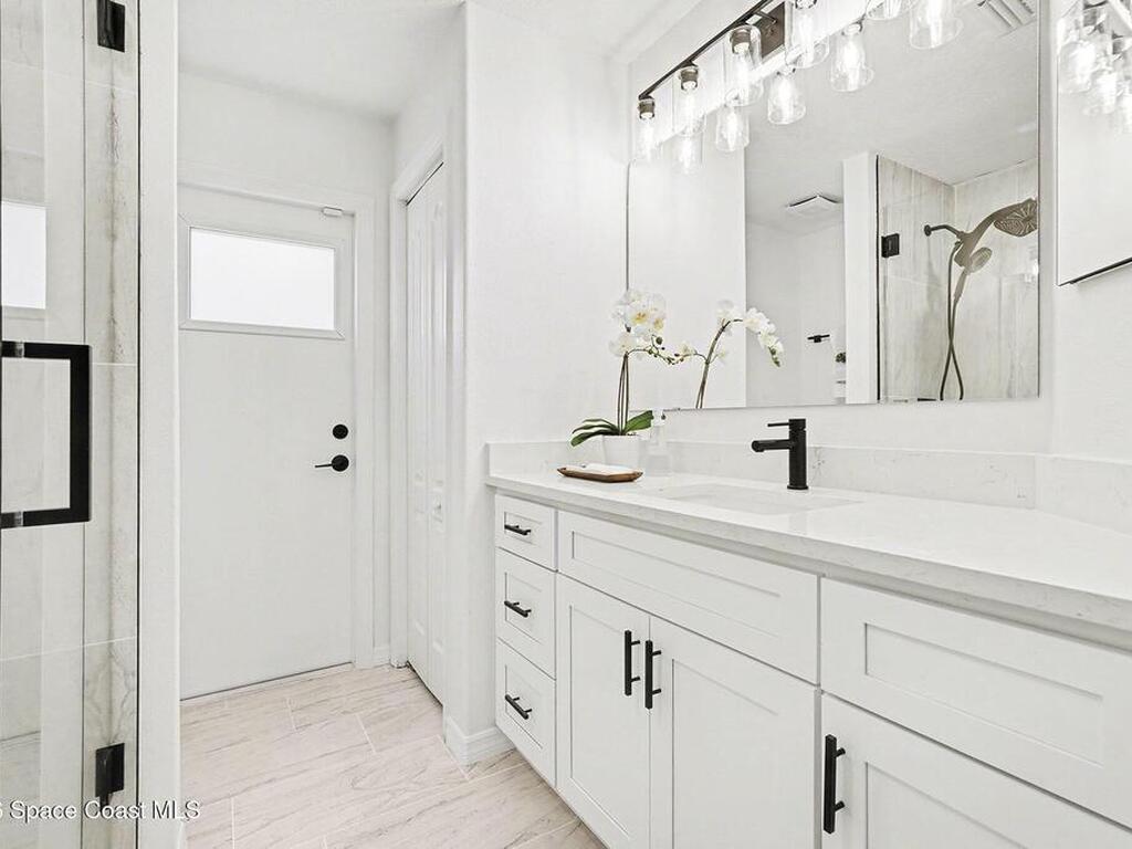 Located in the sought-after Lockmar Estates in Palm Bay along the Florida Space Coast, this beautifullyrenovated, move-in ready home sits on a spacious .34-acre lot. Enjoy elegant curb appeal with lush tropicallandscaping and an expanded 2-car garage. Inside discover an airy, light-filled open floor plan withcathedral ceilings, sliding doors, tall windows featuring 3 bedrooms, 2 bathrooms. The gourmet kitchenboasts quartz counters, stainless steel appliances, and custom cabinetry. The serene primary suite offers2 walk-in closets and a spa-like bath. Relax on the large screened lanai overlooking your private oasis.With a new roof (2023), thoughtful updates and close to top schools, shop