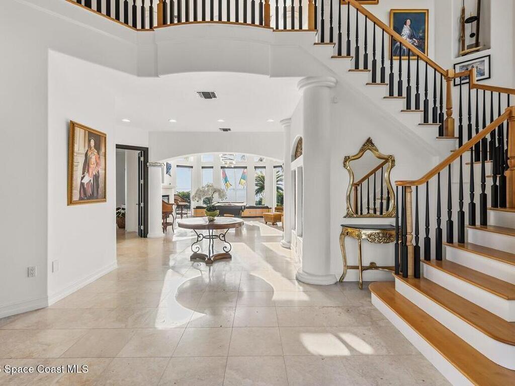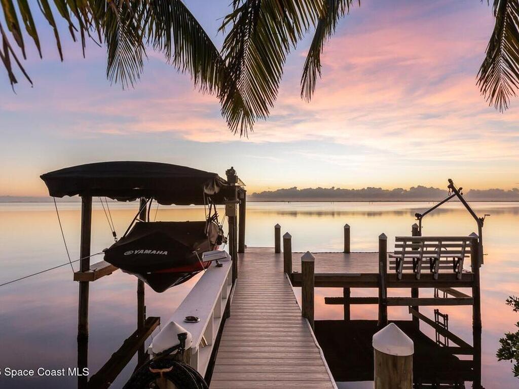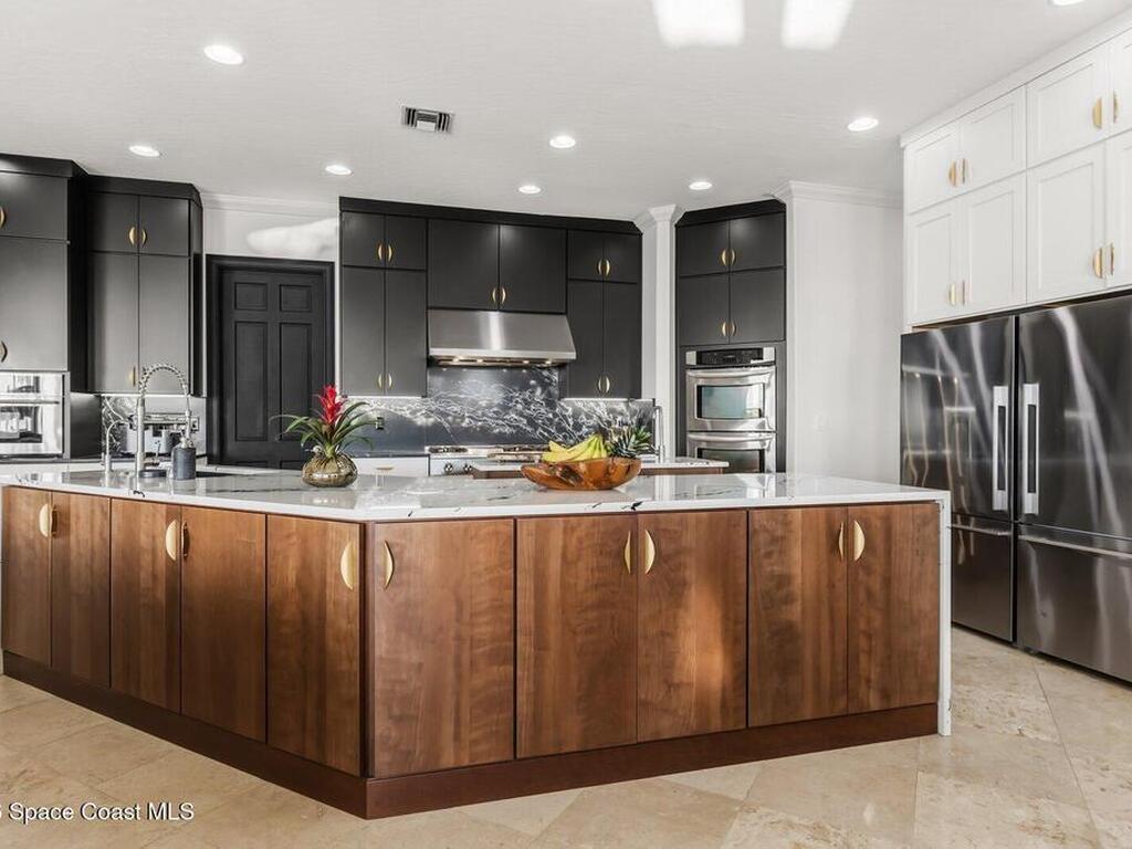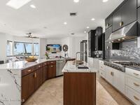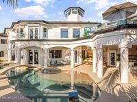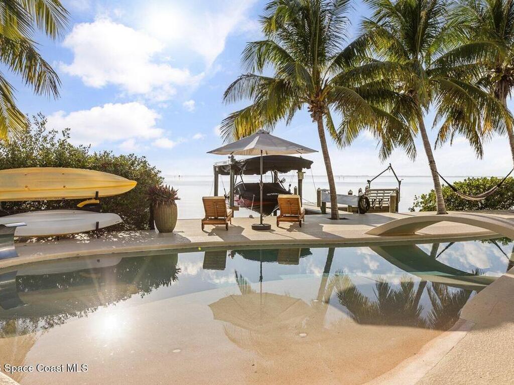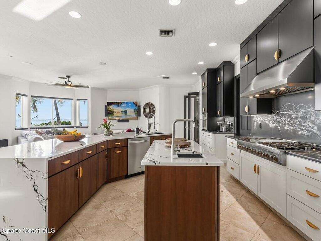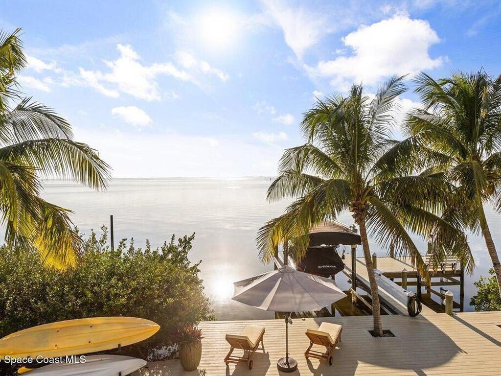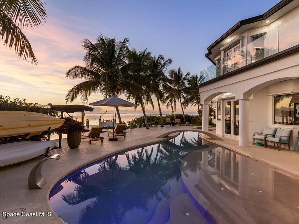 Luxurious waterfront custom estate with 5 bedrooms, 5.5 baths, and over 6, 558 square feet exceptionally updated in 2022. Experience endless coastal paradise with 150 feet of Banana River frontage, breathtaking unobstructed views, dolphins swimming in your backyard, boat access to the Atlantic Ocean, nearby beaches in the Surf Capital of the East Coast and iconic rocket launches from Kennedy Space Center. This exquisite waterfront property offers a blend of luxury and comfort, and is designed to maximize natural light and stunning water views. The chef's kitchen is ideal for entertaining and features two islands, two dishwashers, three chef sinks, custom-designed stone countertops and backsplash, high-end appliances and cabinets, six-burner gas stove, wine cellar and a butler's pantry. Along with the gourmet kitchen, the private home office and gym are on the first floor.