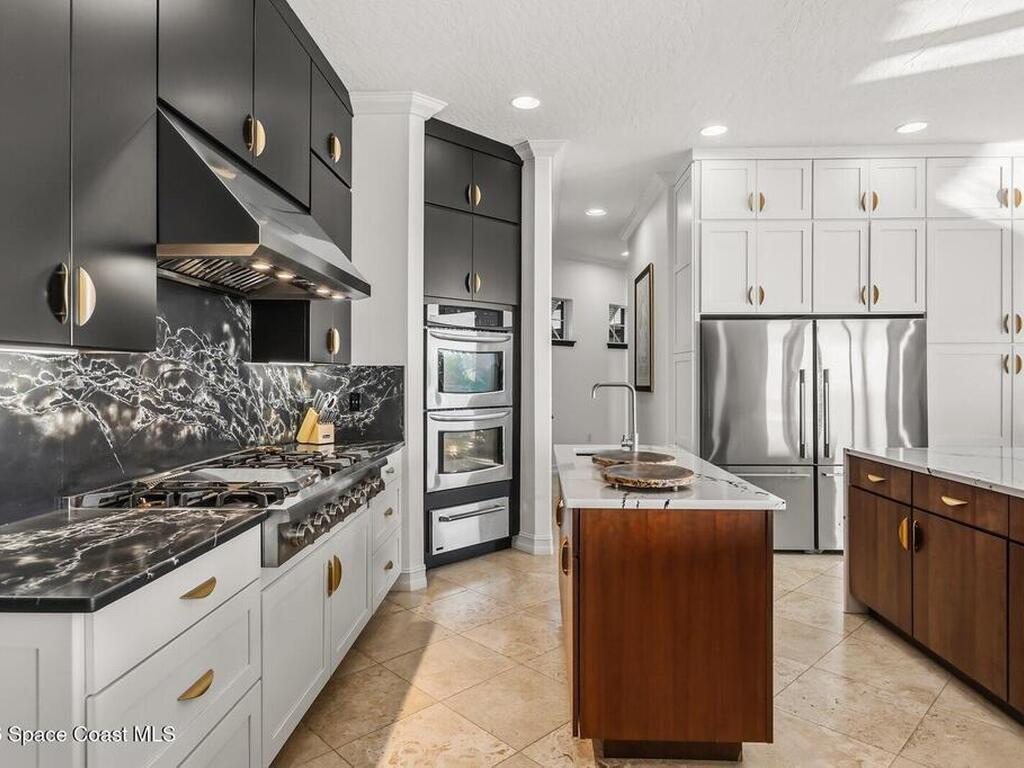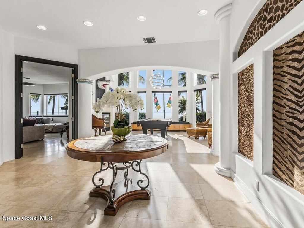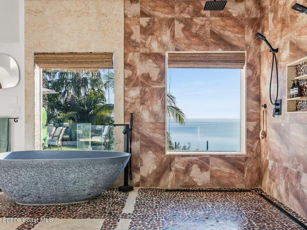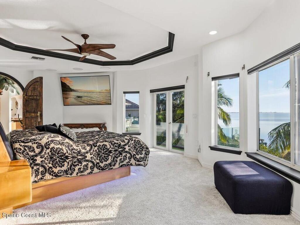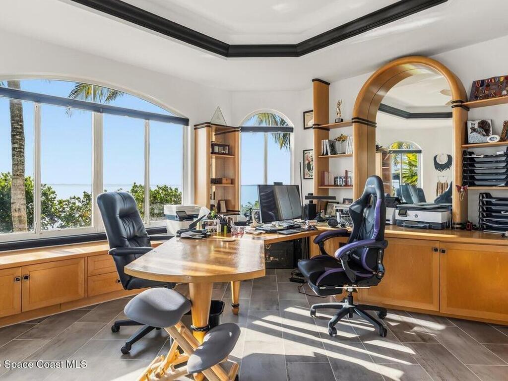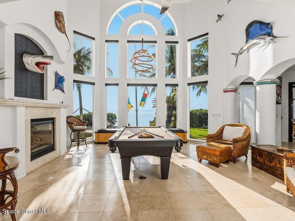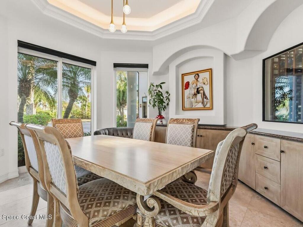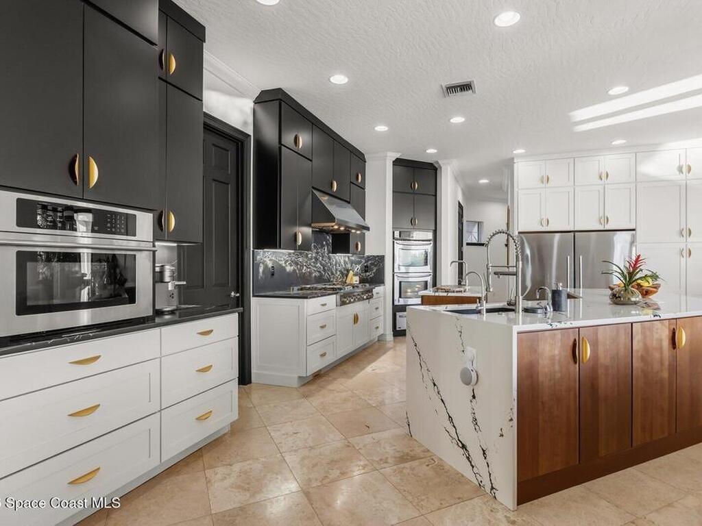 Luxurious waterfront custom estate with 5 bedrooms, 5.5 baths, and over 6, 558 square feet exceptionally updated in 2022. Experience endless coastal paradise with 150 feet of Banana River frontage, breathtaking unobstructed views, dolphins swimming in your backyard, boat access to the Atlantic Ocean, nearby beaches in the Surf Capital of the East Coast and iconic rocket launches from Kennedy Space Center. This exquisite waterfront property offers a blend of luxury and comfort, and is designed to maximize natural light and stunning water views. The chef's kitchen is ideal for entertaining and features two islands, two dishwashers, three chef sinks, custom-designed stone countertops and backsplash, high-end appliances and cabinets, six-burner gas stove, wine cellar and a butler's pantry. Along with the gourmet kitchen, the private home office and gym are on the first floor.
