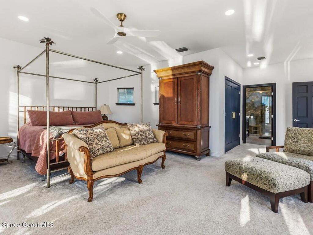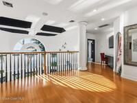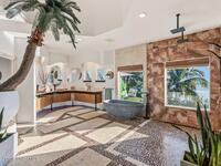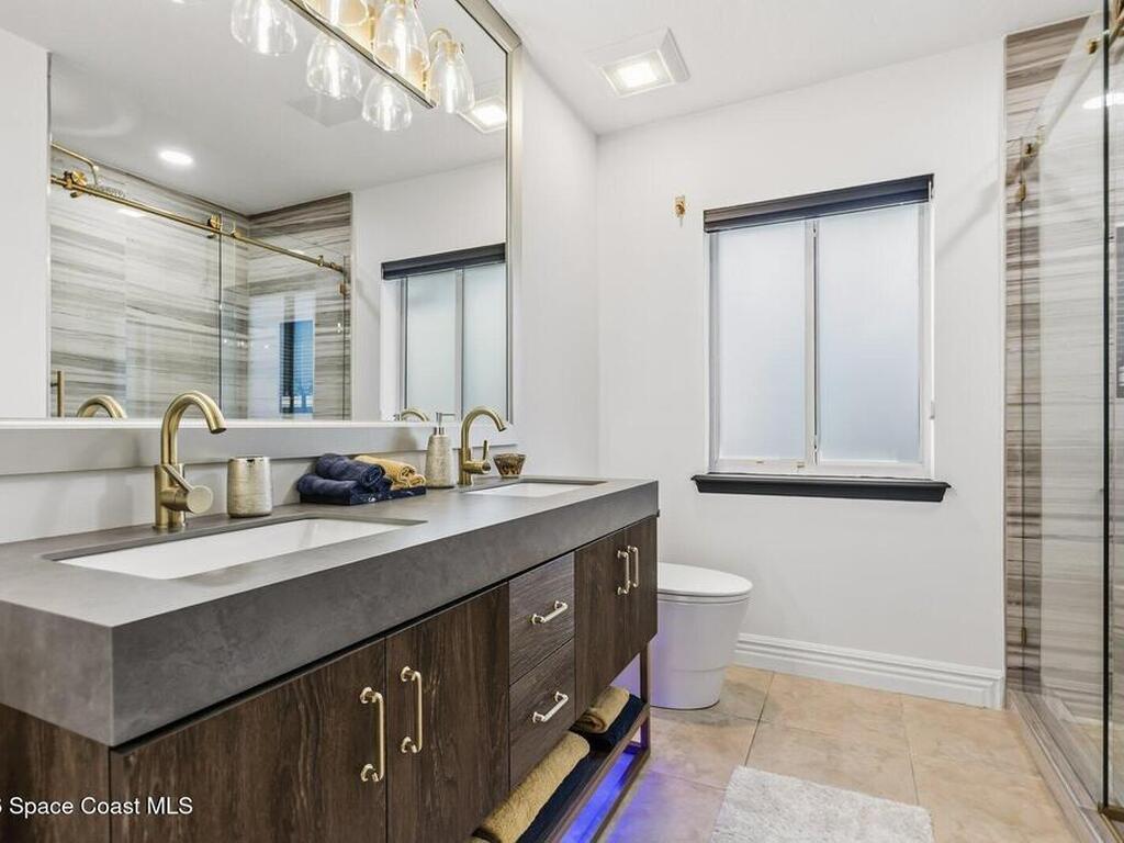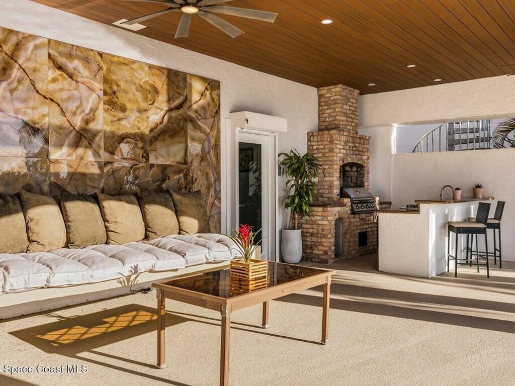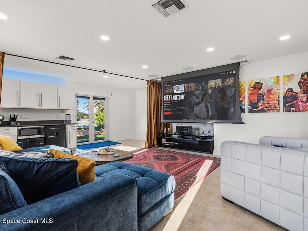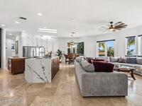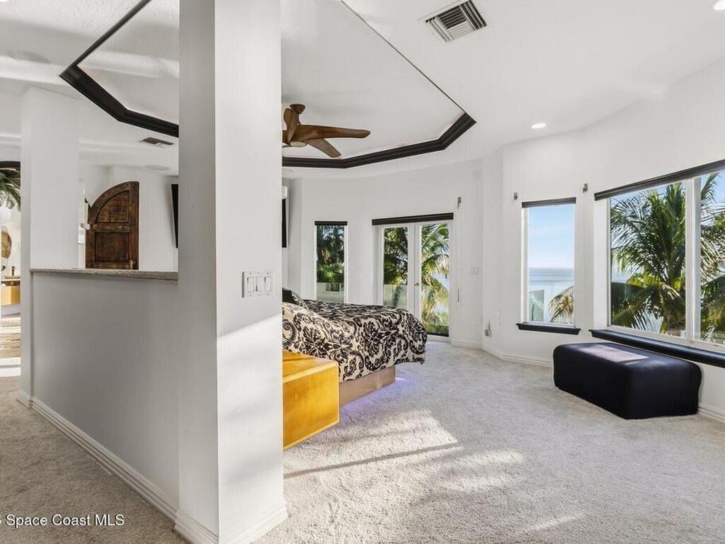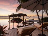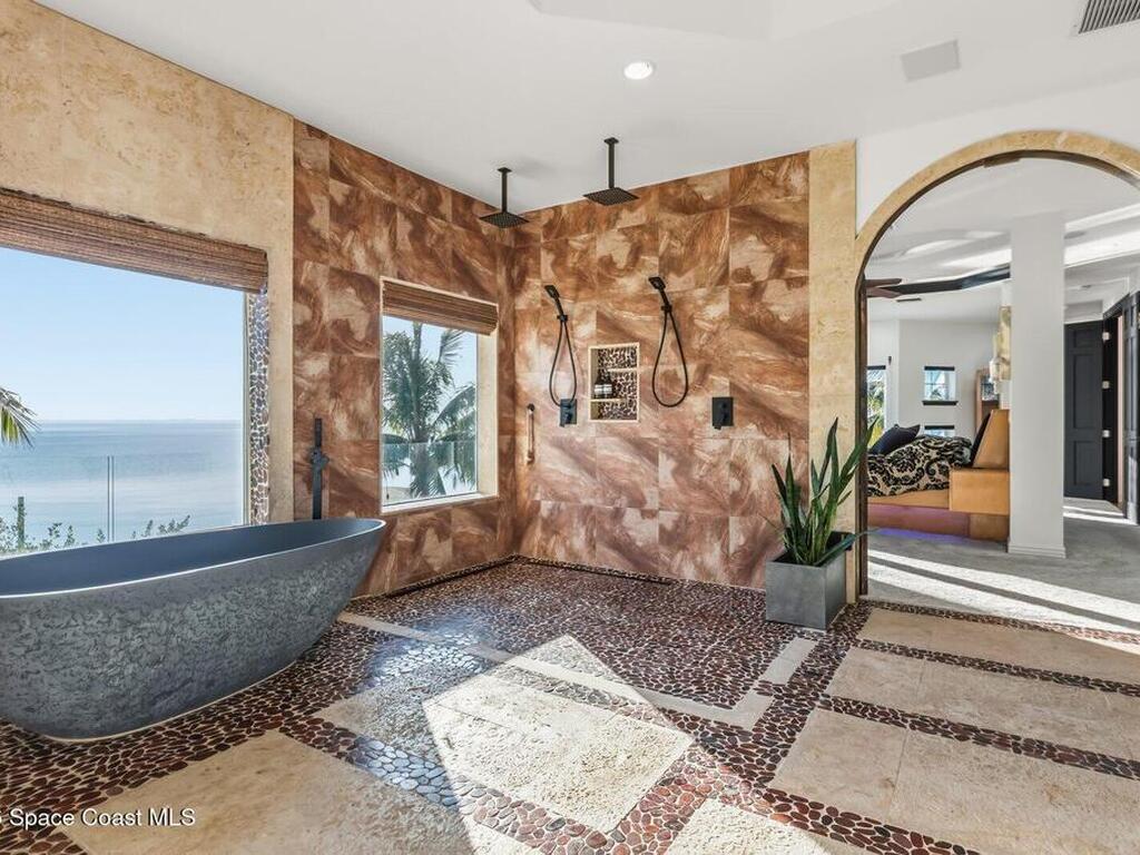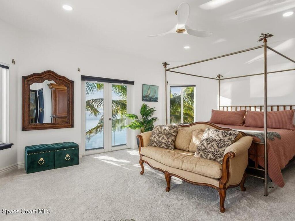 Luxurious waterfront custom estate with 5 bedrooms, 5.5 baths, and over 6, 558 square feet exceptionally updated in 2022. Experience endless coastal paradise with 150 feet of Banana River frontage, breathtaking unobstructed views, dolphins swimming in your backyard, boat access to the Atlantic Ocean, nearby beaches in the Surf Capital of the East Coast and iconic rocket launches from Kennedy Space Center. This exquisite waterfront property offers a blend of luxury and comfort, and is designed to maximize natural light and stunning water views. The chef's kitchen is ideal for entertaining and features two islands, two dishwashers, three chef sinks, custom-designed stone countertops and backsplash, high-end appliances and cabinets, six-burner gas stove, wine cellar and a butler's pantry. Along with the gourmet kitchen, the private home office and gym are on the first floor.
