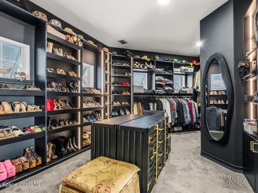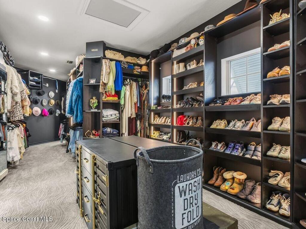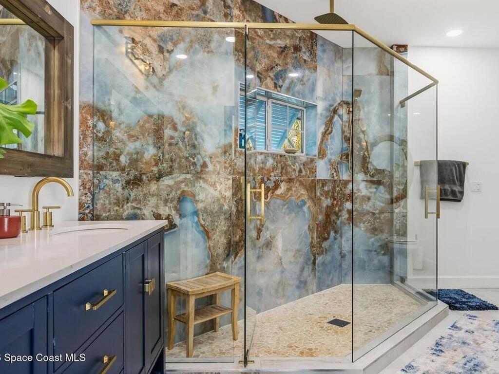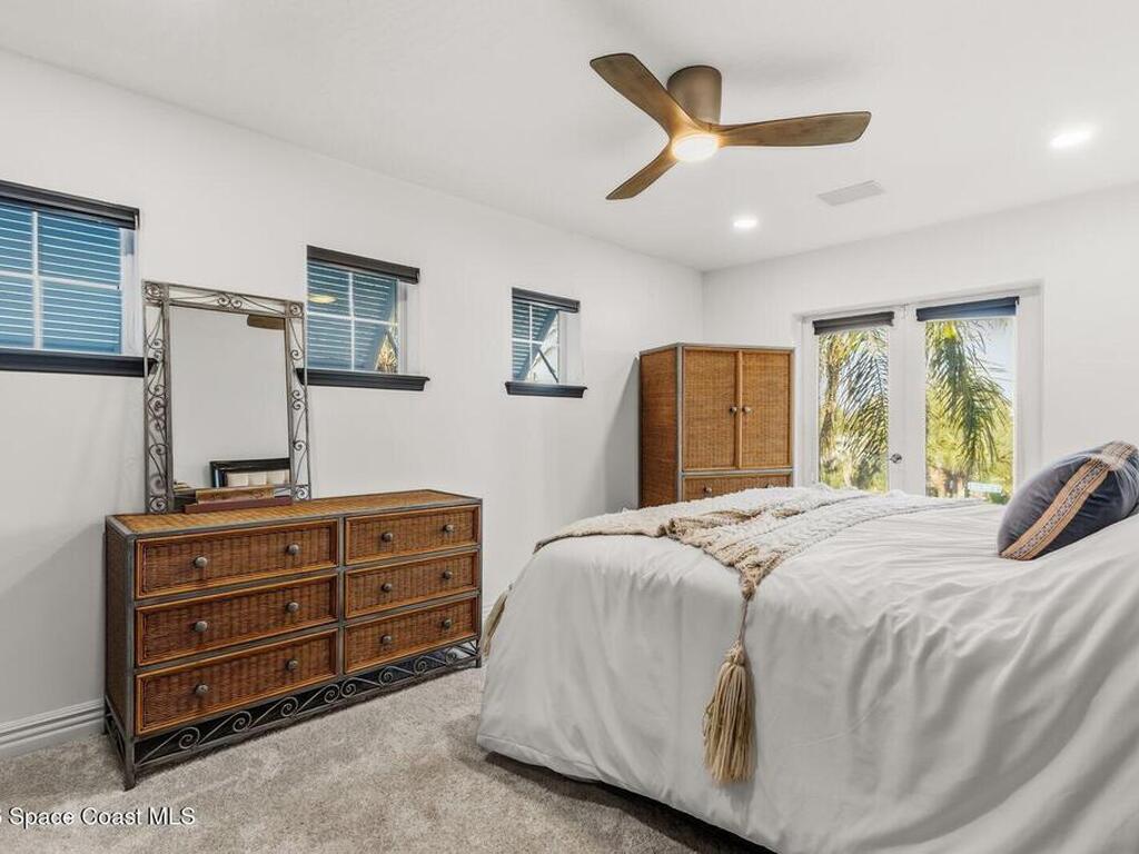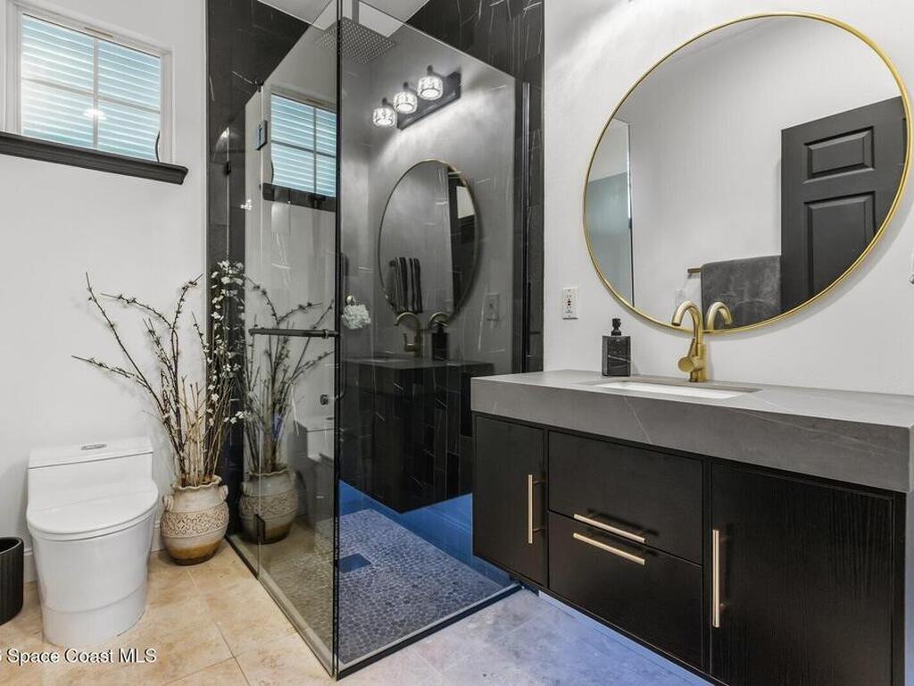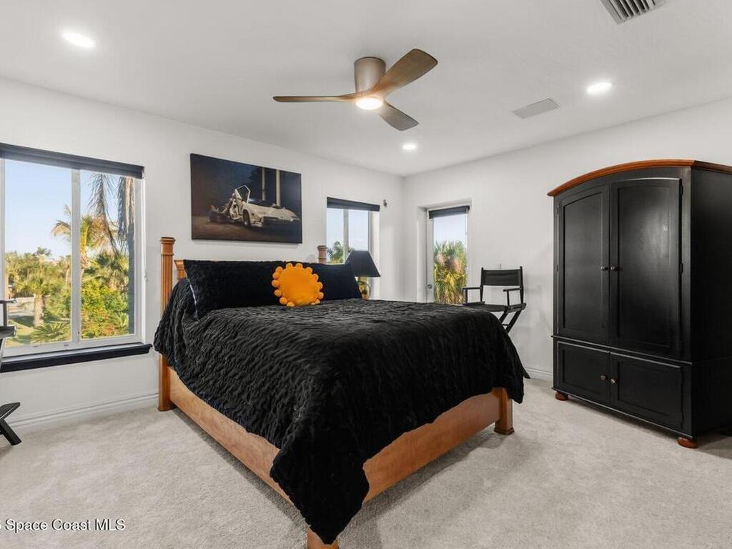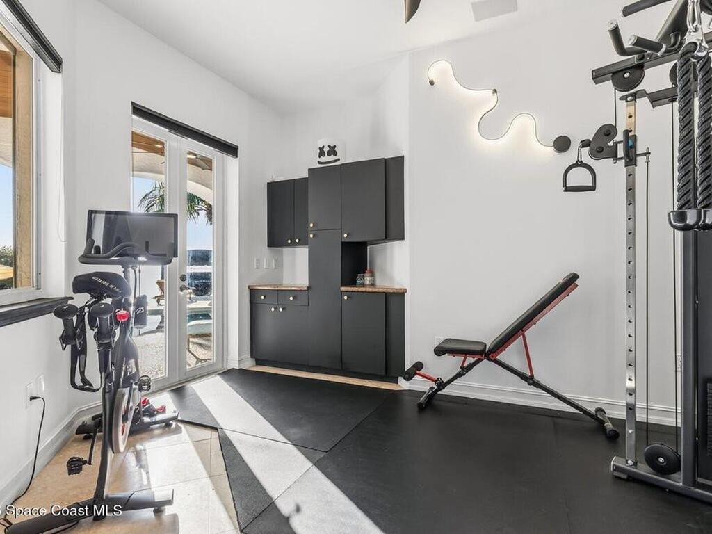 Luxurious waterfront custom estate with 5 bedrooms, 5.5 baths, and over 6, 558 square feet exceptionally updated in 2022. Experience endless coastal paradise with 150 feet of Banana River frontage, breathtaking unobstructed views, dolphins swimming in your backyard, boat access to the Atlantic Ocean, nearby beaches in the Surf Capital of the East Coast and iconic rocket launches from Kennedy Space Center. This exquisite waterfront property offers a blend of luxury and comfort, and is designed to maximize natural light and stunning water views. The chef's kitchen is ideal for entertaining and features two islands, two dishwashers, three chef sinks, custom-designed stone countertops and backsplash, high-end appliances and cabinets, six-burner gas stove, wine cellar and a butler's pantry. Along with the gourmet kitchen, the private home office and gym are on the first floor.