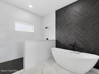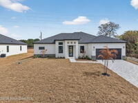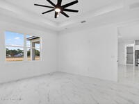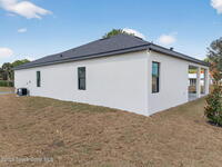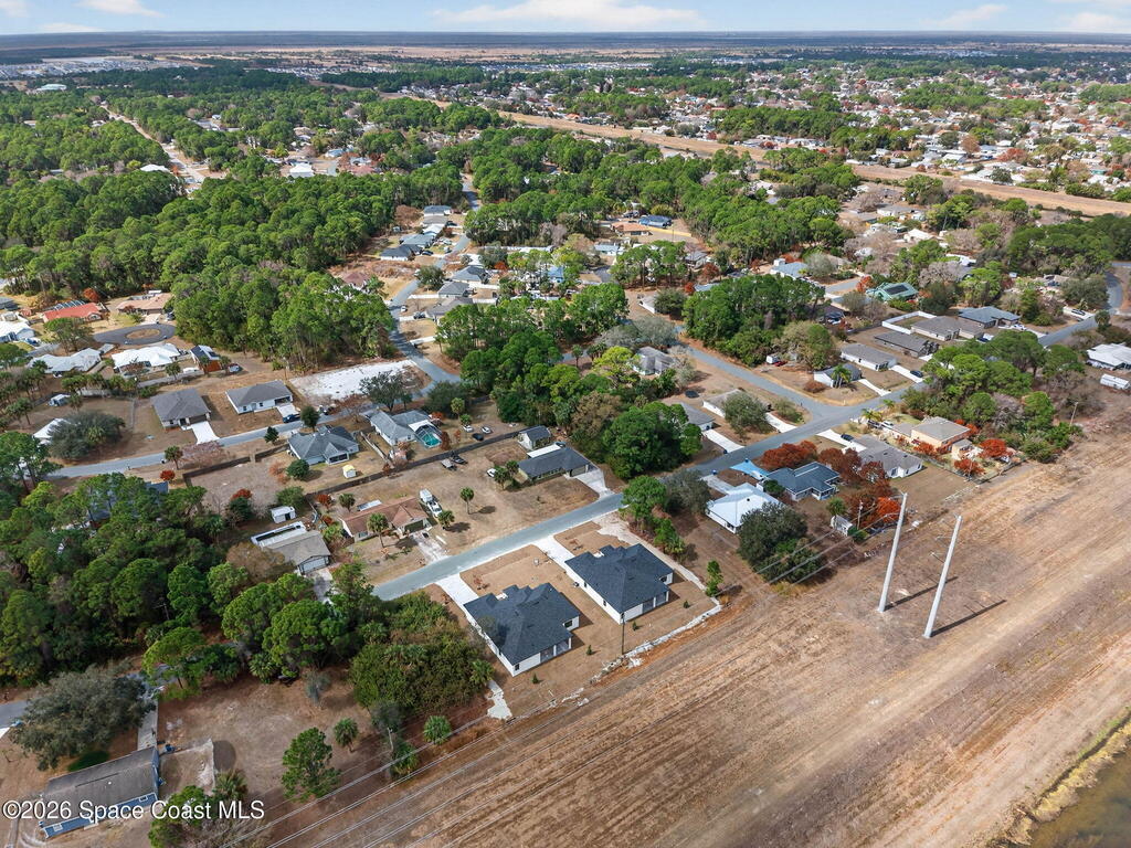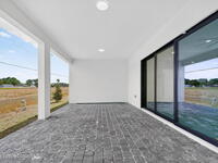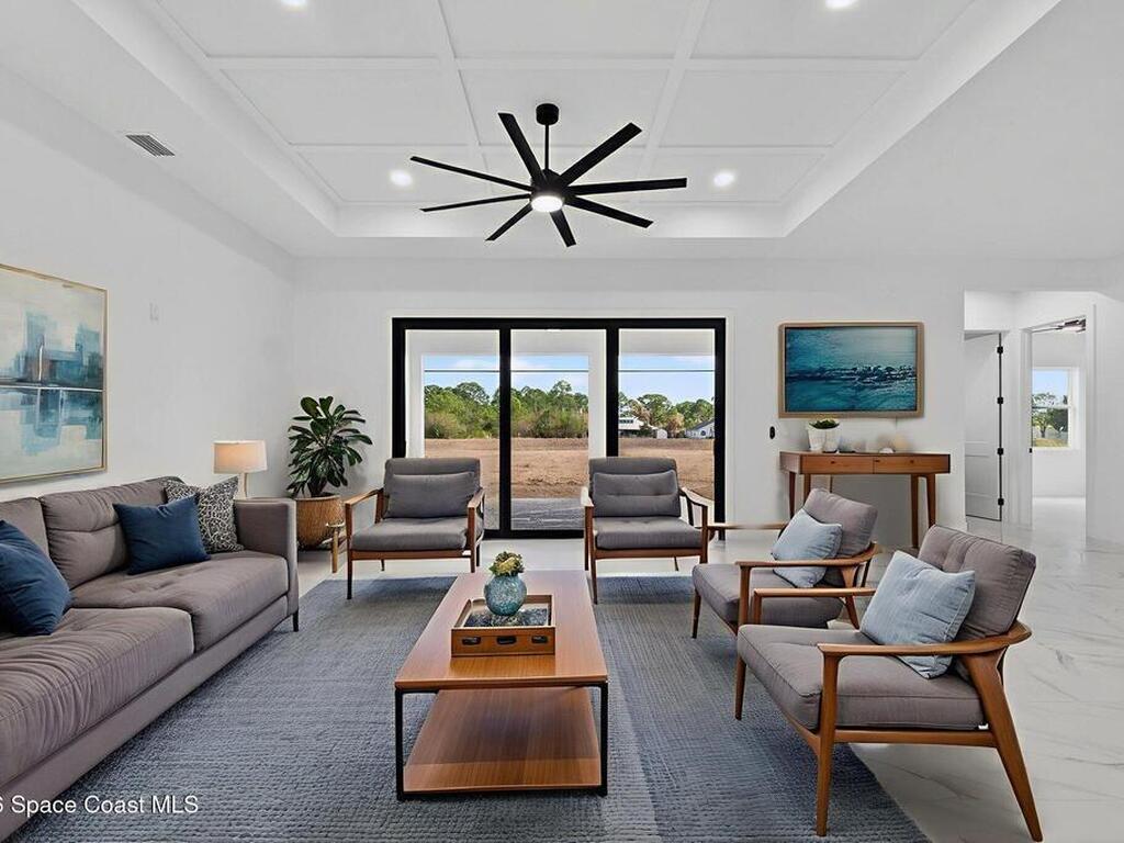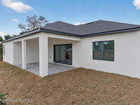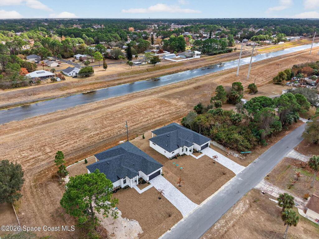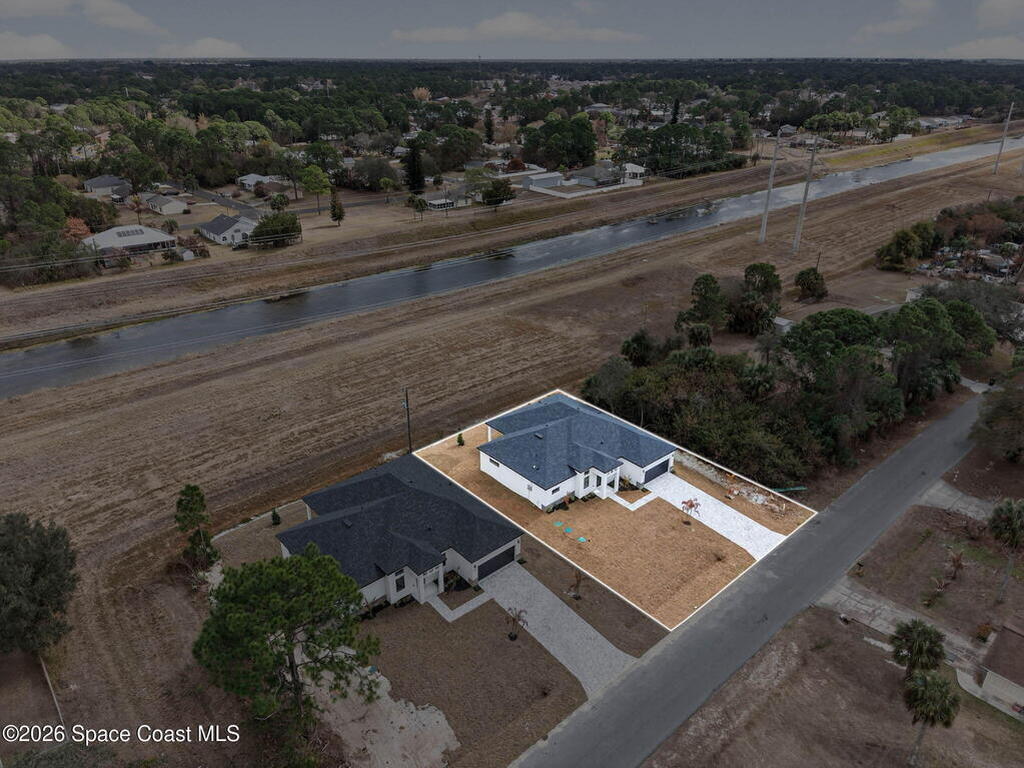 A rare canal-front new construction offering elevated modern living in Northwest Palm Bay. This 2, 350 sq ft residence features true 10-foot ceilings with dramatic double tray details, creating a grand architectural presence. Designer 24'' x 24'' tile flooring flows seamlessly throughout, complementing the home's refined contemporary aesthetic.The gourmet kitchen features a wall oven and high end appliance package, ideal for entertaining and everyday living. The spa-inspired primary suite offers a freestanding soaking tub and spacious walk-in shower.Enjoy a covered patio overlooking the tranquil canal, providing privacy and a peaceful outdoor setting. Additional highlights include a luxury paver driveway, paver patio, smart lock system, Impact windows, and modern energy-efficient construction. A rare opportunity to own a thoughtfully designed canal-front residence built for comfort, prestige, and lasting value.