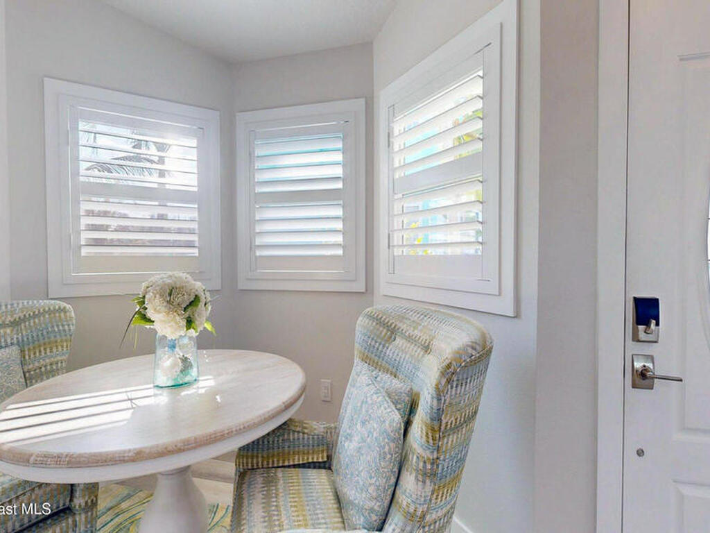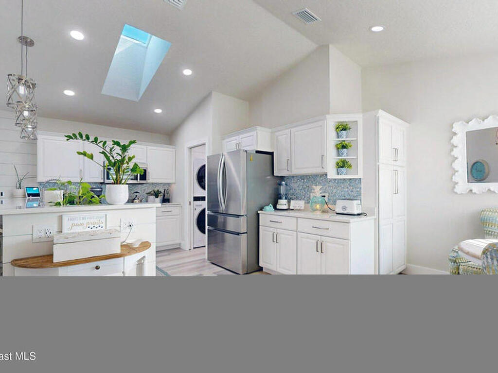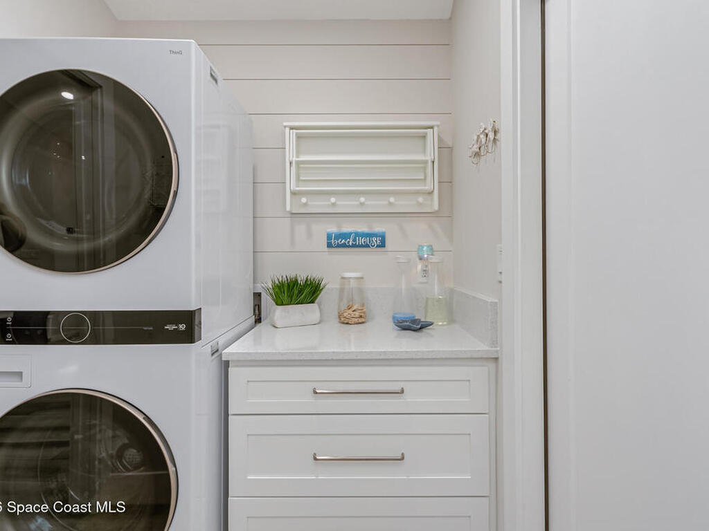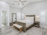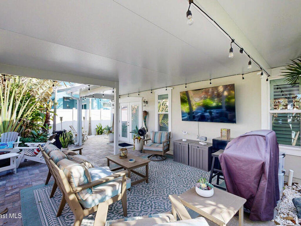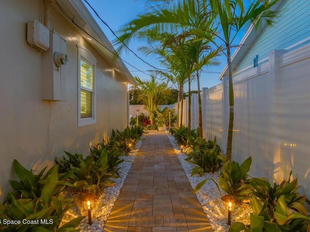 Beach Retreat!Experience this completely transformed coastal sanctuary showcasing luxury upgrades throughout and designed for effortless seaside living on Florida's renowned Space Coast.This move-in-ready residence has been extensively remodeled with high-end finishes, modern systems, and elevated designer details inside and out.Fully remodeled interior (2024) featuring wall-to-wall and ceiling paint, new double pane windows, new exterior finish with sheathing, stucco, and trim, LVP flooring throughout, custom shiplap feature walls, and a stunning custom entertainment wall with recessed TV cutout and flush-mounted electric fireplace, plus new interior doors, hardware, trim, barn doors, and designer lighting.The chef-inspired kitchen shines with refinished solid wood cabinetry with new pulls, sparkle white counters, stylish backsplash tile, remodeled island, new sink and faucet, full appliance package, and elegant pendant lighting.Bathrooms have been fully remodeled with new vanities, showers, tub, tile, mirro