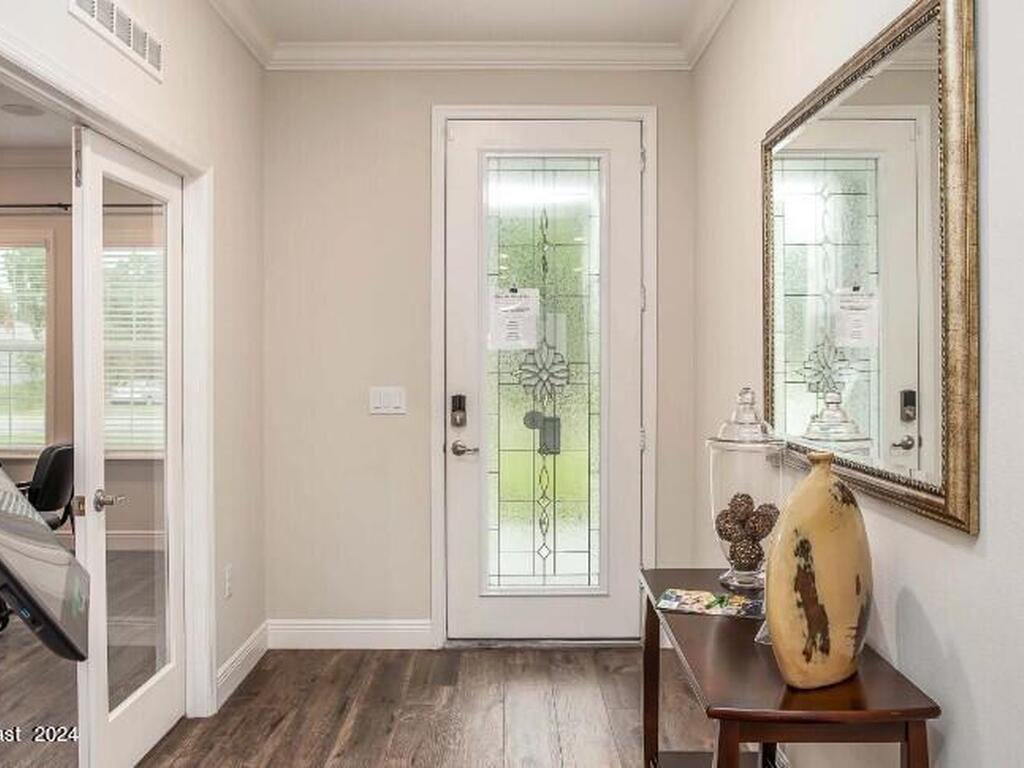 Pre-Construction. To Be Built. Located in the peaceful and growing community of Vero Lake Estates, the Wilmington reflects a true country-suburban lifestyle with spacious homesites and quiet grid-lined streets. The setting provides privacy and space while remaining close to everyday conveniences. With no HOA or CDD fees, the neighborhood maintains a custom, individual feel that stands apart from traditional subdivisions.A covered front porch welcomes you into the Wilmington, leading to an elegant entry highlighted by 9'4'' ceilings and crown molding throughout, creating a bright and refined first impression. Ceramic tile flooring extends throughout the entire home, complemented by upgraded door hardware for a cohesive finish. Just off the foyer, a private den with double French glass doors provides a flexible space for a home office, study, or additional living area.