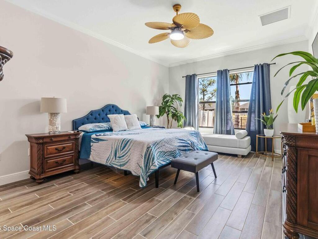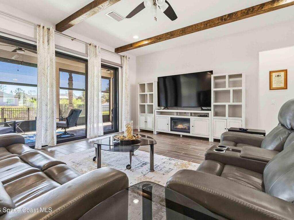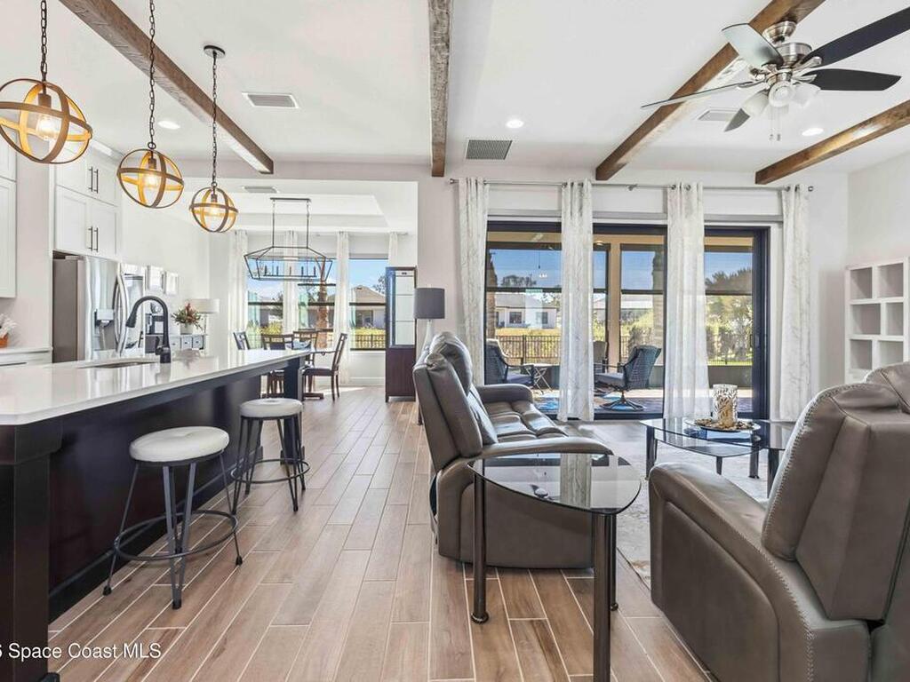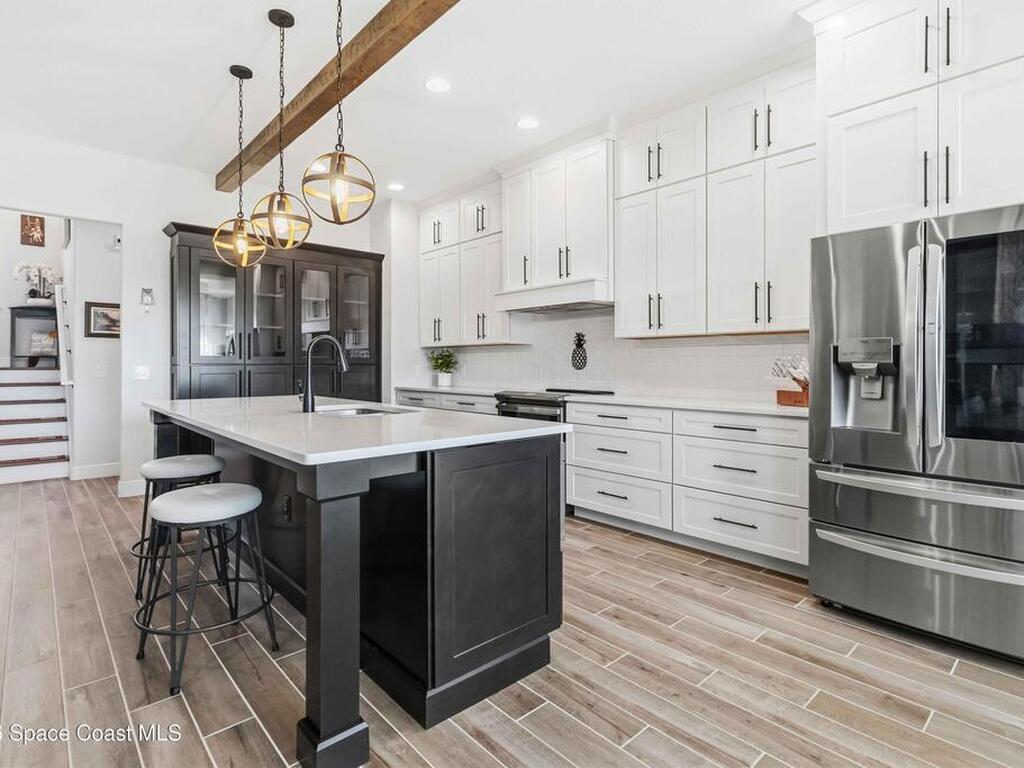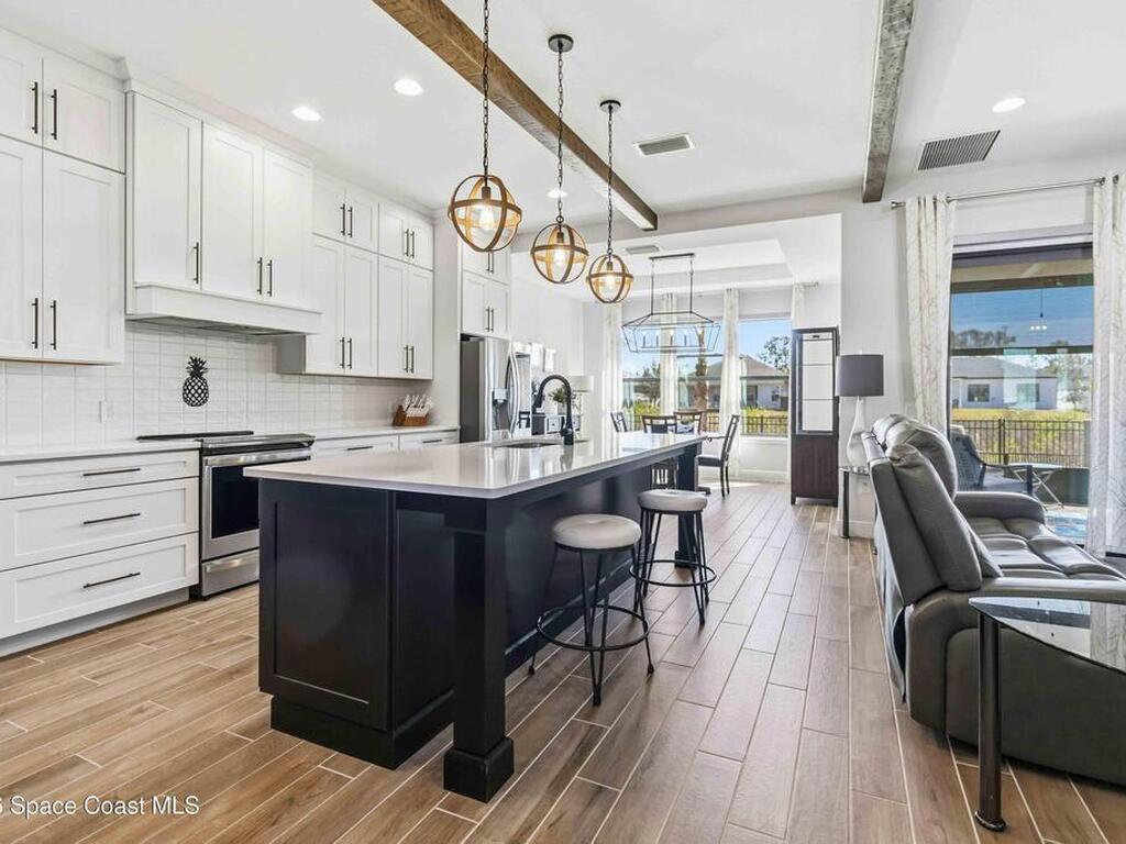 Why wait to build? Like-new 4 bed/3.5 bath home built in 2022 w/3-car garage & thoughtful, flexible layout. The quartz kitchen is the heart of the home & boasts stainless appliances, tiled backsplash, large island, spacious walk-in pantry & opens to a gorgeous great room w/tall ceilings & wood beams. Enjoy relaxing or entertaining from your screened paver patio overlooking the fully fenced backyard. Downstairs, you'll find the owner's suite, which offers a large walk-in closet & spa-style private bath w/tiled walk-in shower w/dual shower heads & double sinks. Bedrooms 2 & 3 share a Jack-and-Jill bath. Also downstairs, is a half bath for guests. Upstairs, features a large loft offering the perfect flex space, plus a 4th bedroom, full bath & large storage closet. Indoor laundry room w/ample storage. Irrigation on well. 2nd bay garage is air conditioned. Just 20 min to Kennedy Space Center, Blue Origin & SpaceX, 30 min to beach & 40 min to Orlando airport & area attractions!