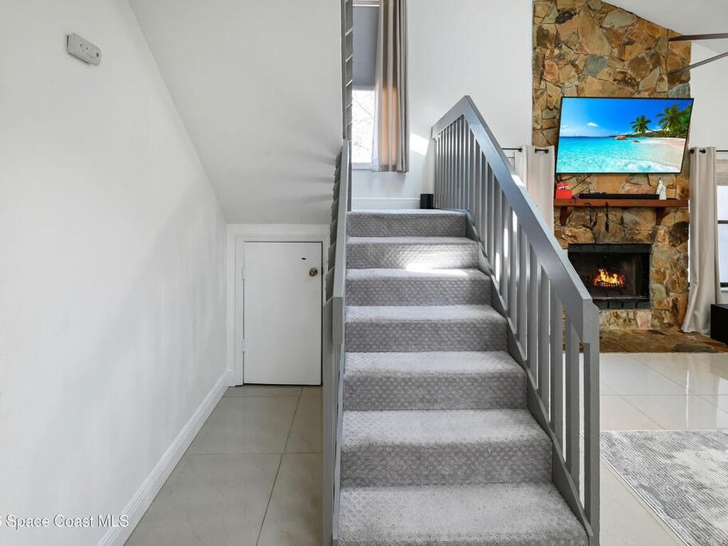 VIEW TODAY! Stunning pool home in desirable Lockmar Estates, within walking distance to Lockmar Elementary School. Beautiful home features a spacious living room with a soaring vaulted ceiling & a striking floor-to-ceiling stone fireplace. The kitchen offers an island, pantry, tile backsplash, and French doors leading to the screened-in pool. The dining area includes a charming bay window. Tile flooring runs throughout the downstairs, with laminate wood flooring in the 2 downstairs bedrooms. Downstairs bathrm has been stylishly updated & features dual sinks. Upstairs master suite includes a private balcony overlooking the screened pool, along with a bathrm featuring a dual sink vanity and a walk-in closet. Enjoy a large driveway with an extension for extra parking. The red shed conveys. Situated on a spacious 0.36-acre lot, this home is ready for a new family. Conveniently located near Target, Publix, and a variety of dining, shopping, & entertainment options, w/ quick access to I-95.