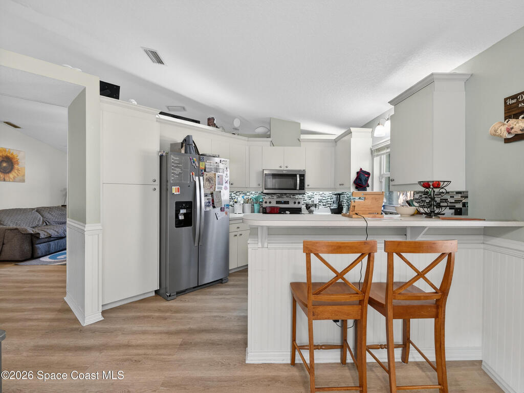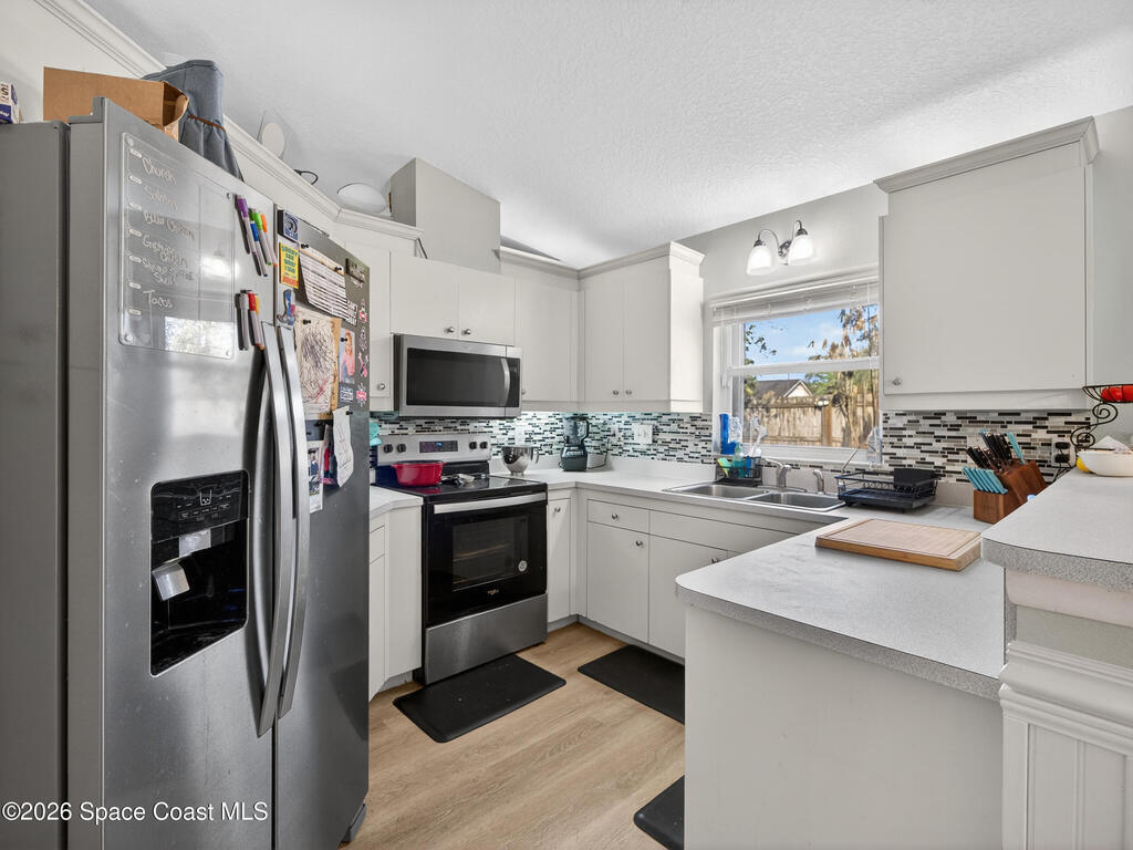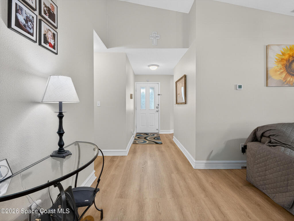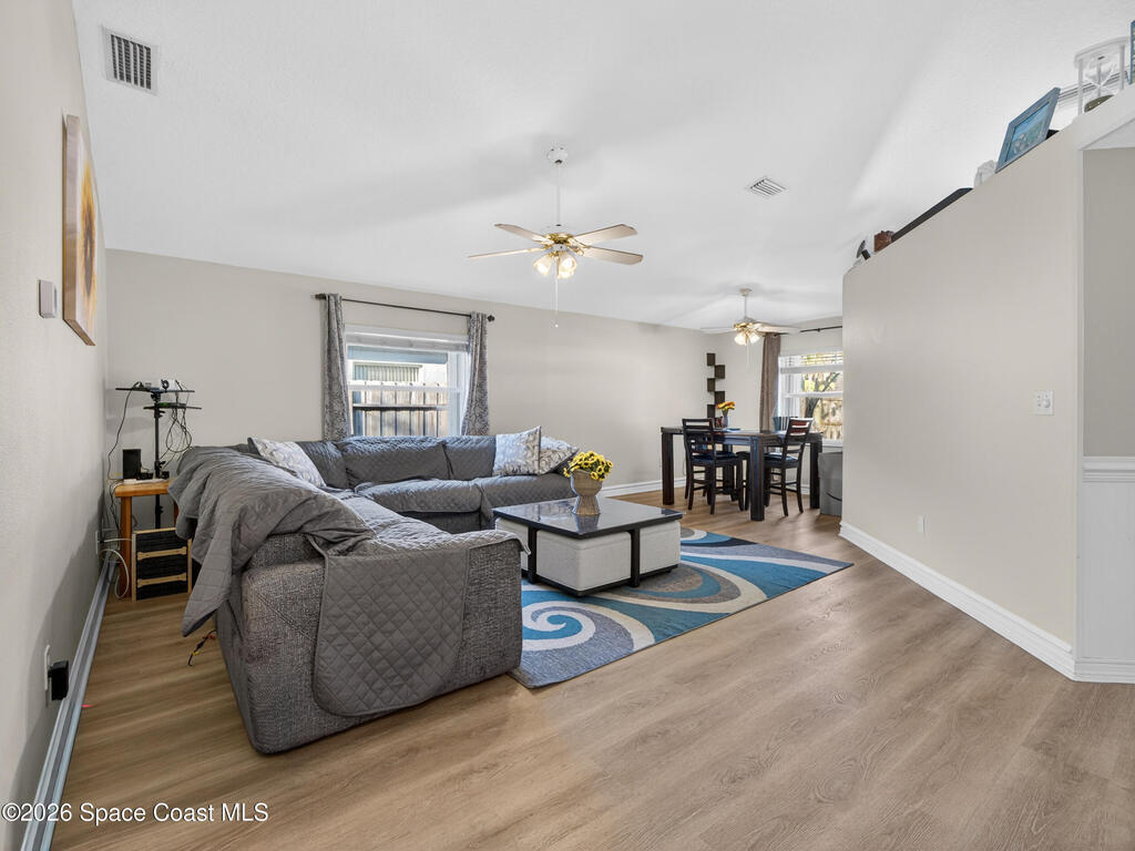 Welcome to this beautifully maintained 3-bedroom, 2-bath home in the heart of Rockledge with **NO HOA**! Major updates have already been taken care of with a newer roof, HVAC system, and water heater--offering peace of mind for years to come.Inside, you'll love the desirable split floor plan featuring luxury vinyl plank flooring and charming bead board wall accents that add warmth and character. The updated kitchen shines with stainless steel appliances, while both bathrooms offer granite-topped vanities for a modern touch. Step outside to a fully fenced backyard--perfect for pets, play, or entertaining--plus a screened-in back porch ideal for relaxing year-round. The pavered driveway adds curb appeal as you arrive at the spacious 2-car garage. Conveniently located near shopping, dining, major employers, and just a short drive to the beaches, this move-in-ready home checks all the boxes.