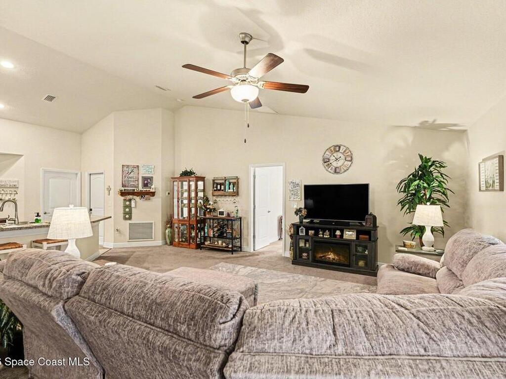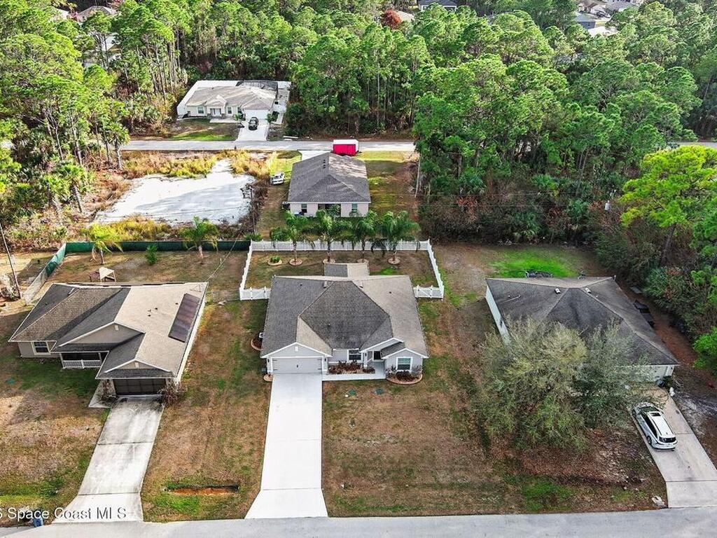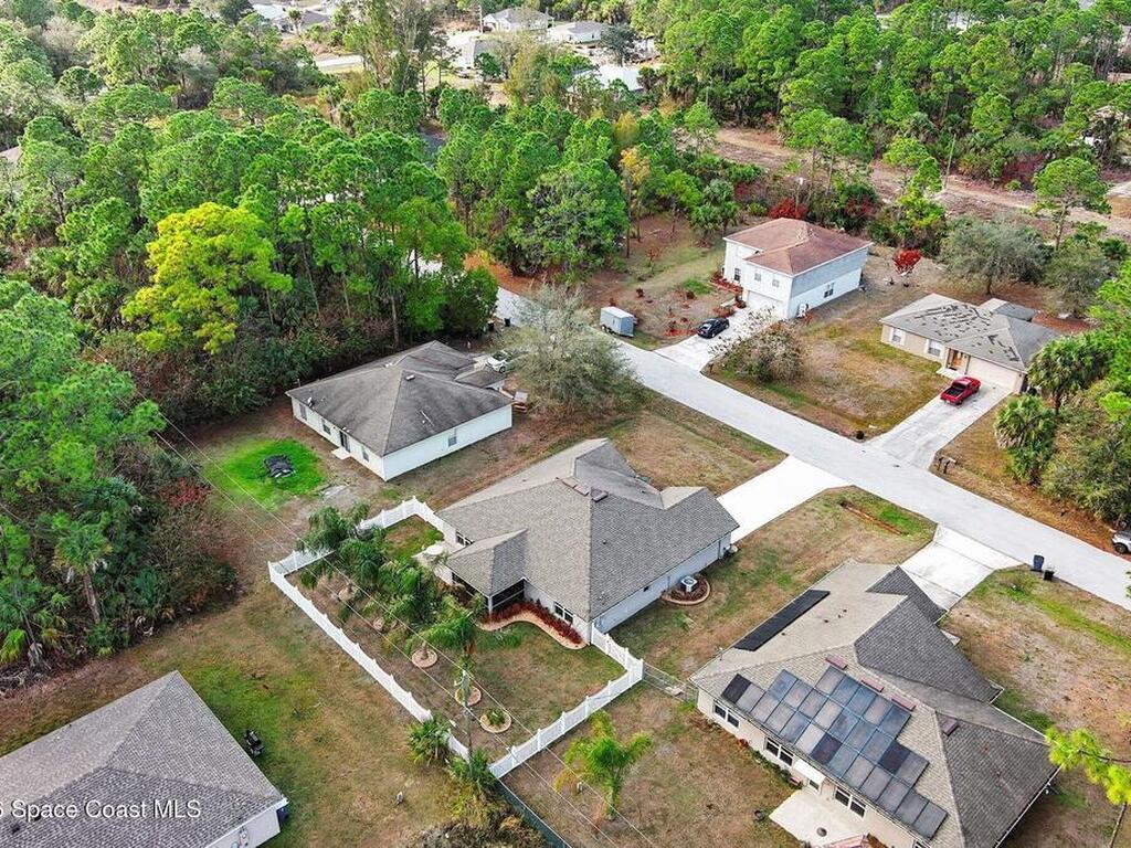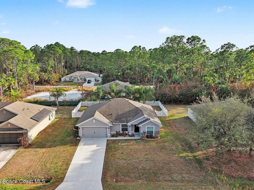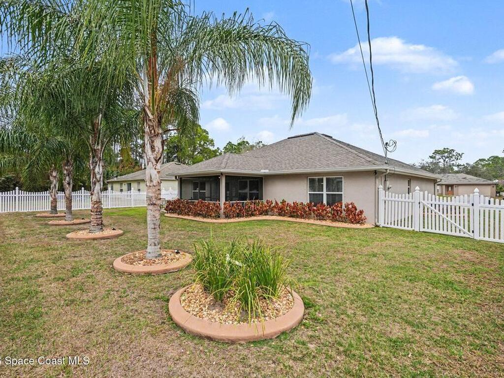Built in 2019 and meticulously maintained, this 4-bedroom, 2-bath split-plan home comes complete with everything new construction asks you to add on later. A refrigerator, washer, dryer, white vinyl fenced backyard, coated driveway, and manicured landscaping are all already here and waiting. The open layout features a large kitchen island overlooking the great room, a separate dining area, and a primary suite with double vanities, garden tub, and separate shower. The oversized laundry room adds everyday convenience. Step outside to a fully furnished screened lanai with a Polywood table set, perfect for outdoor entertaining, plus an extended patio, all ready to enjoy from day one. Select interior furniture included, making this truly turnkey. No builder-lender requirements, bring any lender and loan program that works best for you. A growing Palm Bay community with a home that is complete, move-in ready, and priced to reflect real value.