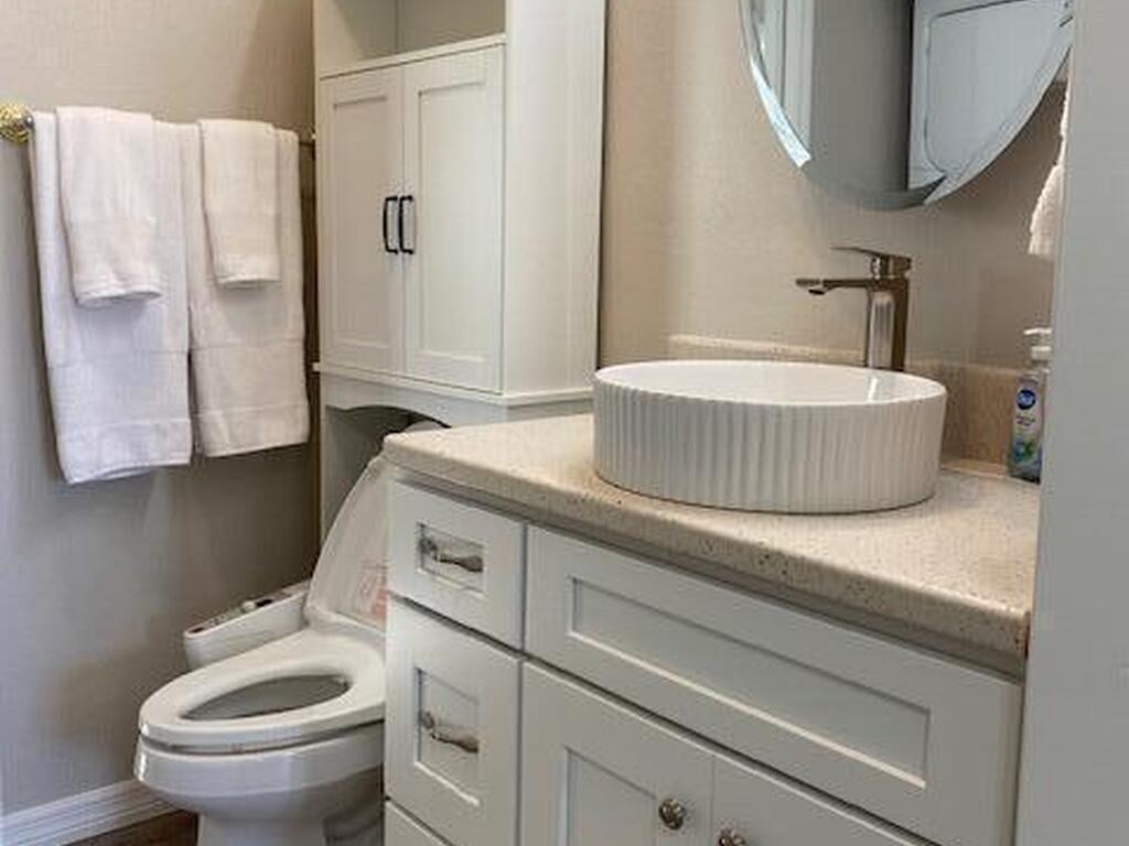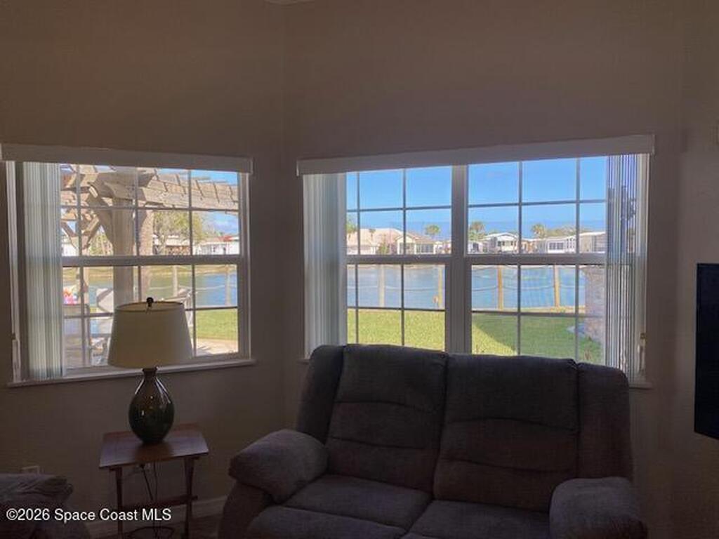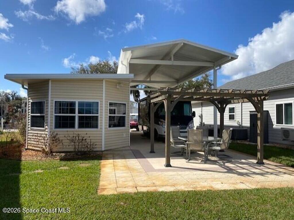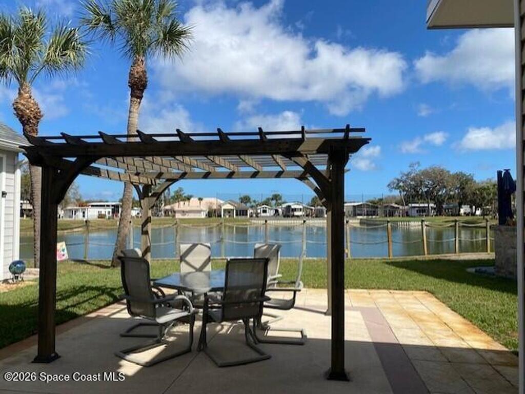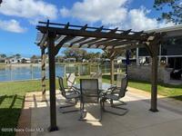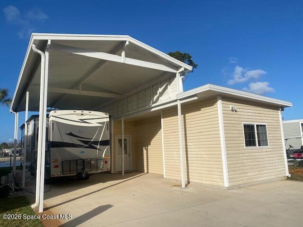 This beautifully updated home is located with lake views and features covered parking for a Class A motorhome. Move in and enjoy Florida resort living, year round or seasonally. The outdoor space features a pergola and paved patio with a sea wall providing relaxing views of the lake and fountain. The house has new everything including: new cabinets, appliances, tile backsplash and shower, washer/dryer, ceiling fans, and paint. Fresh and ready for you to enjoy. New roof and AC in 2024. Amenities include; clubhouse, heated pool, pickleball, tennis, shuffleboard, bocce, and gated entry closes after 6 pm. Executive golf course and watch the rocket launches from your own front yard. Close to airports, beaches, theme parks, shopping and restaurants.