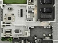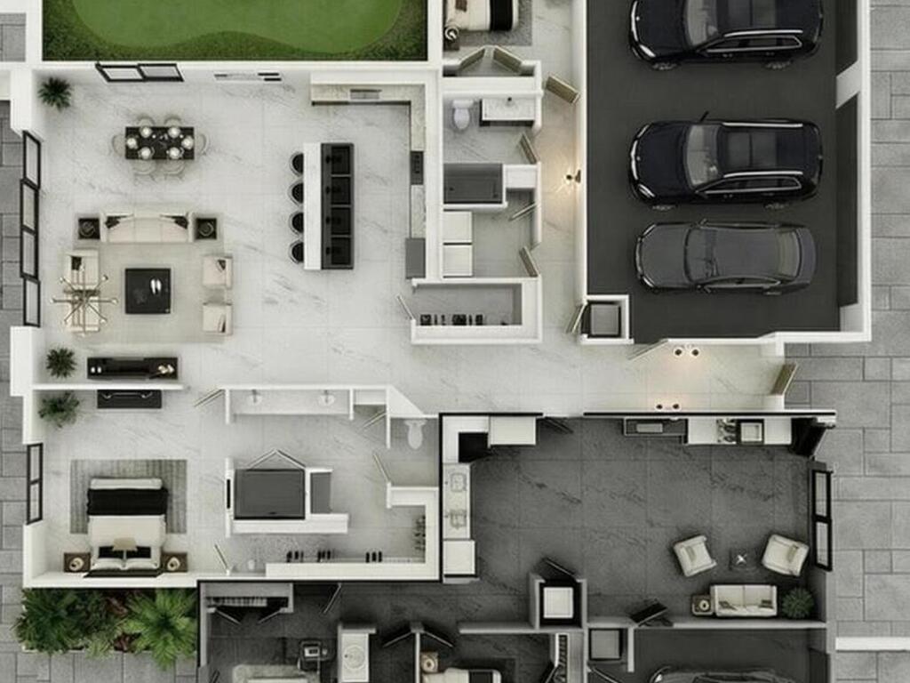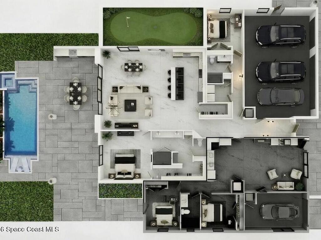 This stunning smart home sits on 1-acre offering the perfect multi-generational living experience with 4 spacious bedrooms and three baths. Enjoy luxurious amenities, including a modern kitchen with quartz countertops, a built-in icemaker, custom cabinets, a hidden coffee bar, and a large walk-in pantry. The main living area features soaring 12-foot ceilings, while the in-laws' side has cozy 9.4-foot ceilings. Entertain outdoors with a summer kitchen, propane gas fire pit, sparkling heated pool, and hot tub. Safety is enhanced with IMPACT windows. The home boasts a total of four garages: three on the main side and one for the in-laws' suite, with a lift ready for a fifth vehicle. A durable metal roof, double-paned insulated wall and door in the primary bedroom, and tile flooring throughout ensuring comfort and efficiency. The spacious kitchen and living area are perfect for gatherings, while a mini putting green adds recreational fun. This home embodies luxury and family togetherness