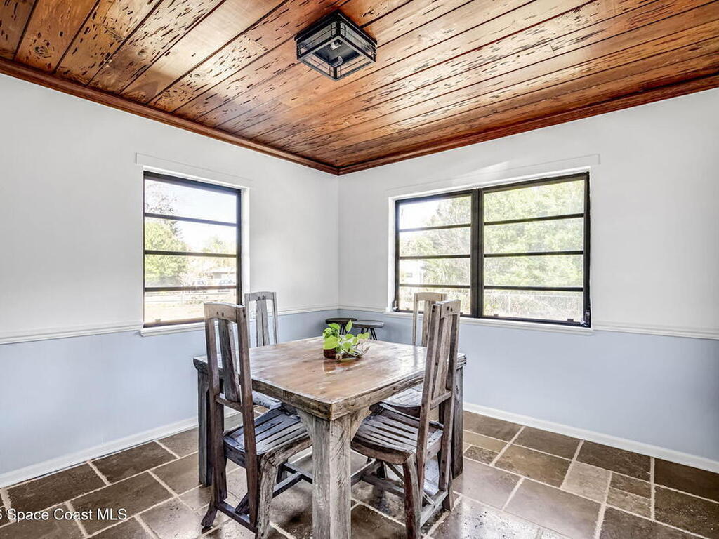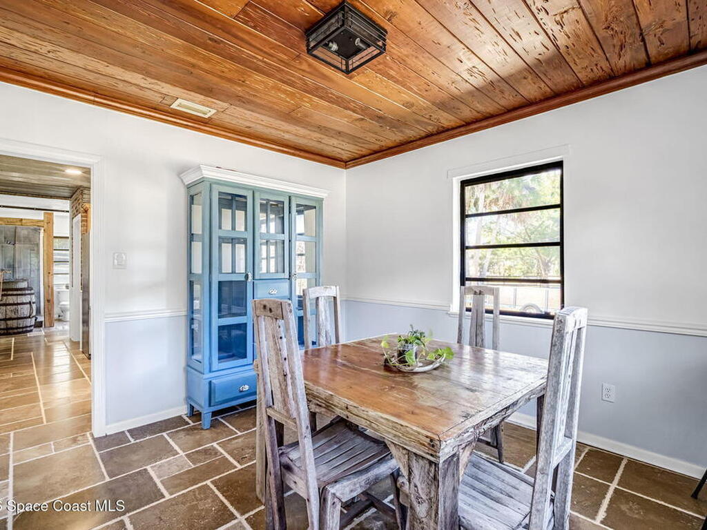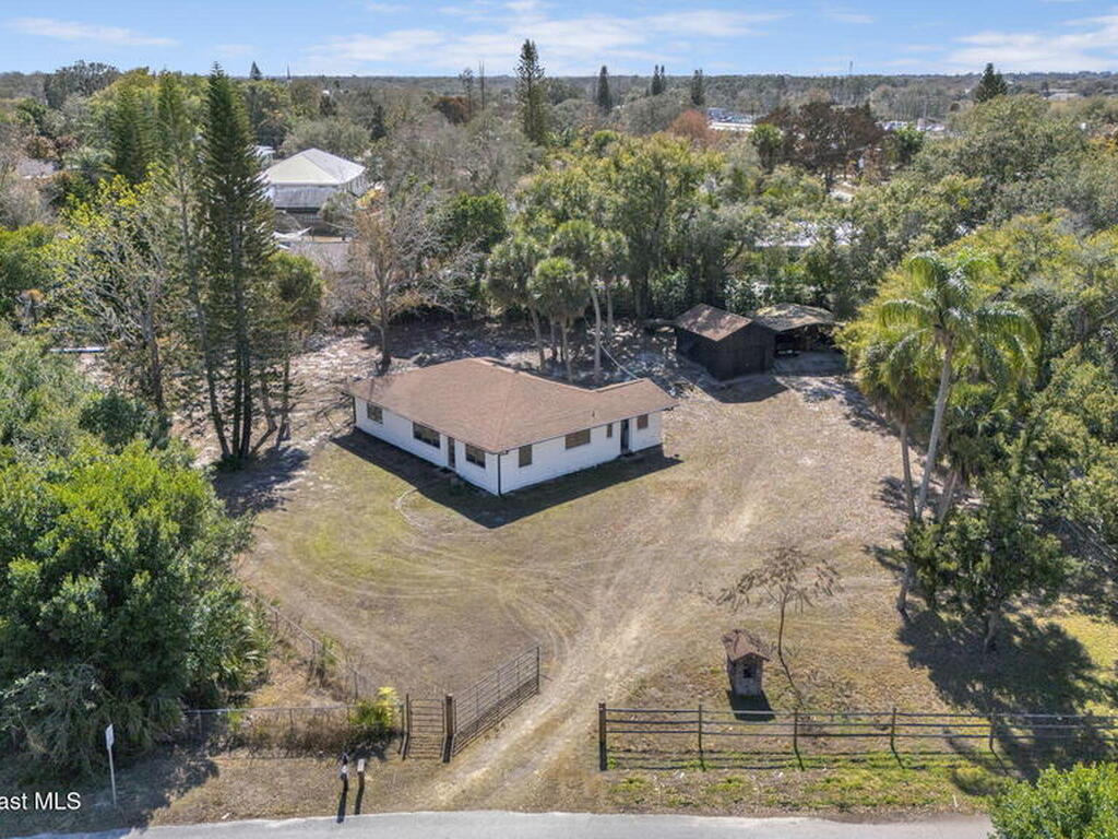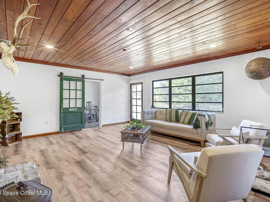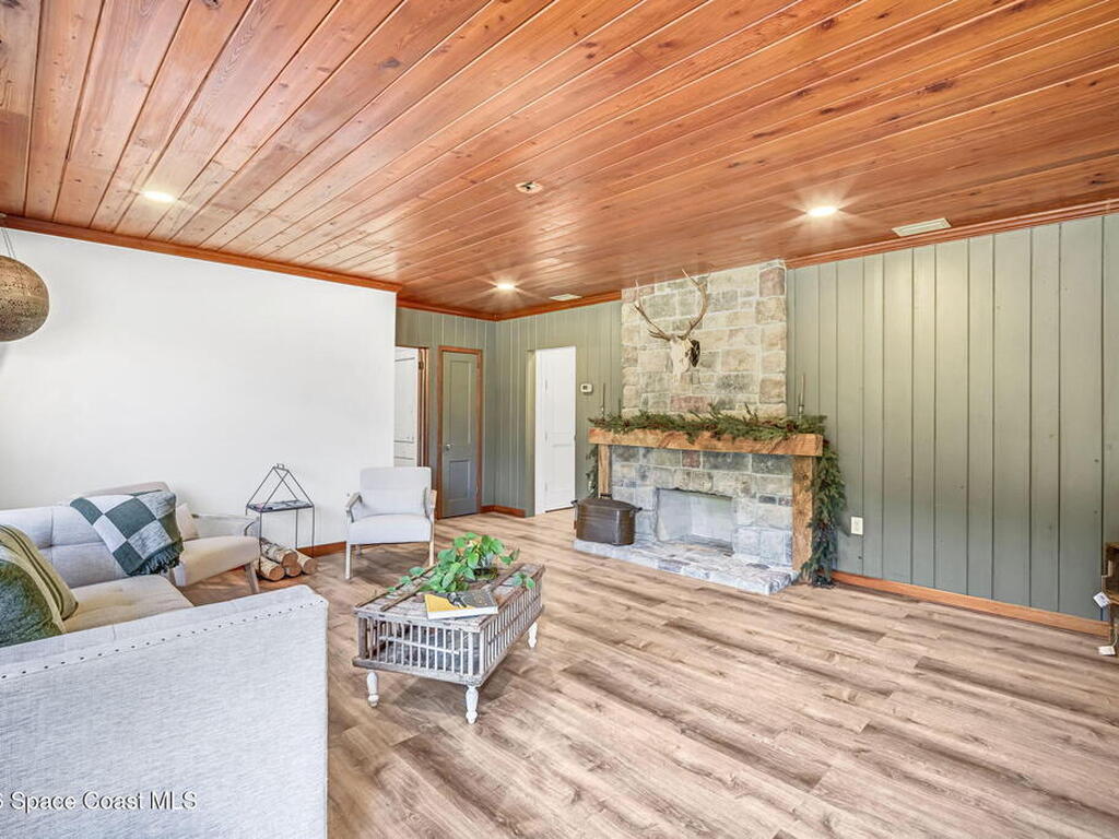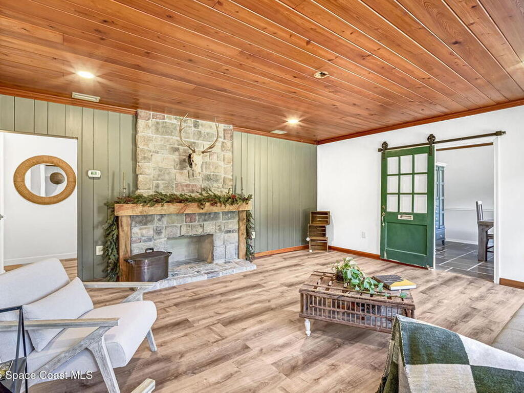 Step into this breathtaking one-of-a-kind 1940's country blending timeless character with high-quality modern upgrades, all set on a spacious .71-acre lot just blocks from the Indian River. Solidly built with concrete interior walls, this beautifully remodeled home showcases meticulous craftsmanship throughout, featuring all new plumbing, a butler's kitchen, updated bathrooms, new flooring, and premium finishes. sale, equipped with a newer electric panel, hurricane shutters, and gutters, septic system and roof. Inside, you'll find hardwood floors, a hand-laid brick fireplace, and tongue-and-groove Florida knotty pine ceiling accents that highlights this homes charm. The detached garage includes a built-in loft and shelving, perfect for a workshop, storage, or creative space. With NO HOA, a great location and plenty of room for boats, RVs, or future additions, this property delivers privacy, quality, and flexibility all in one.