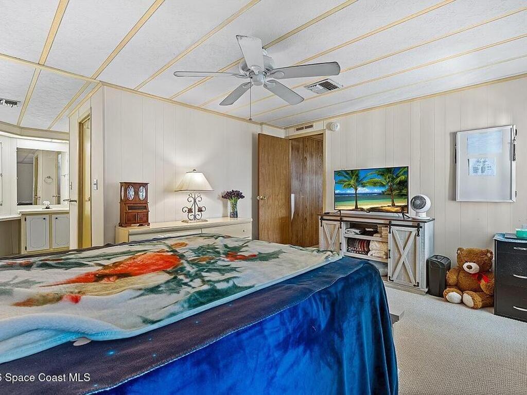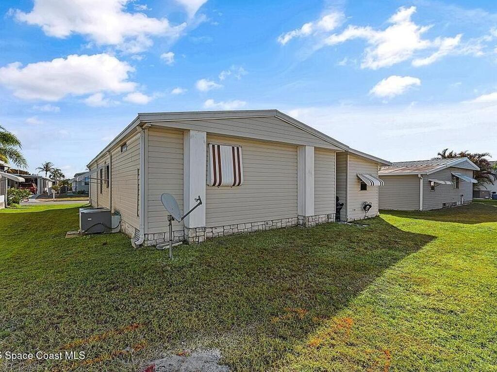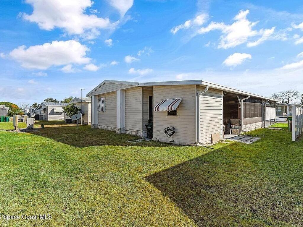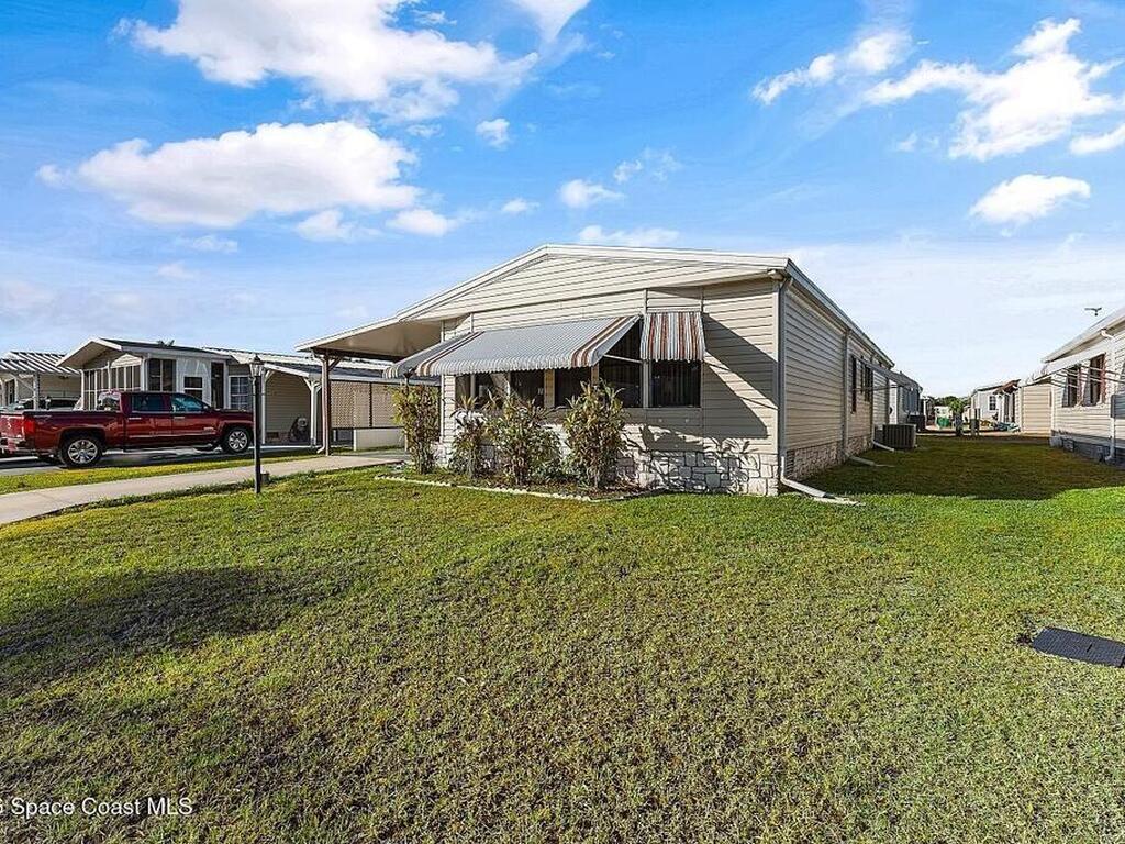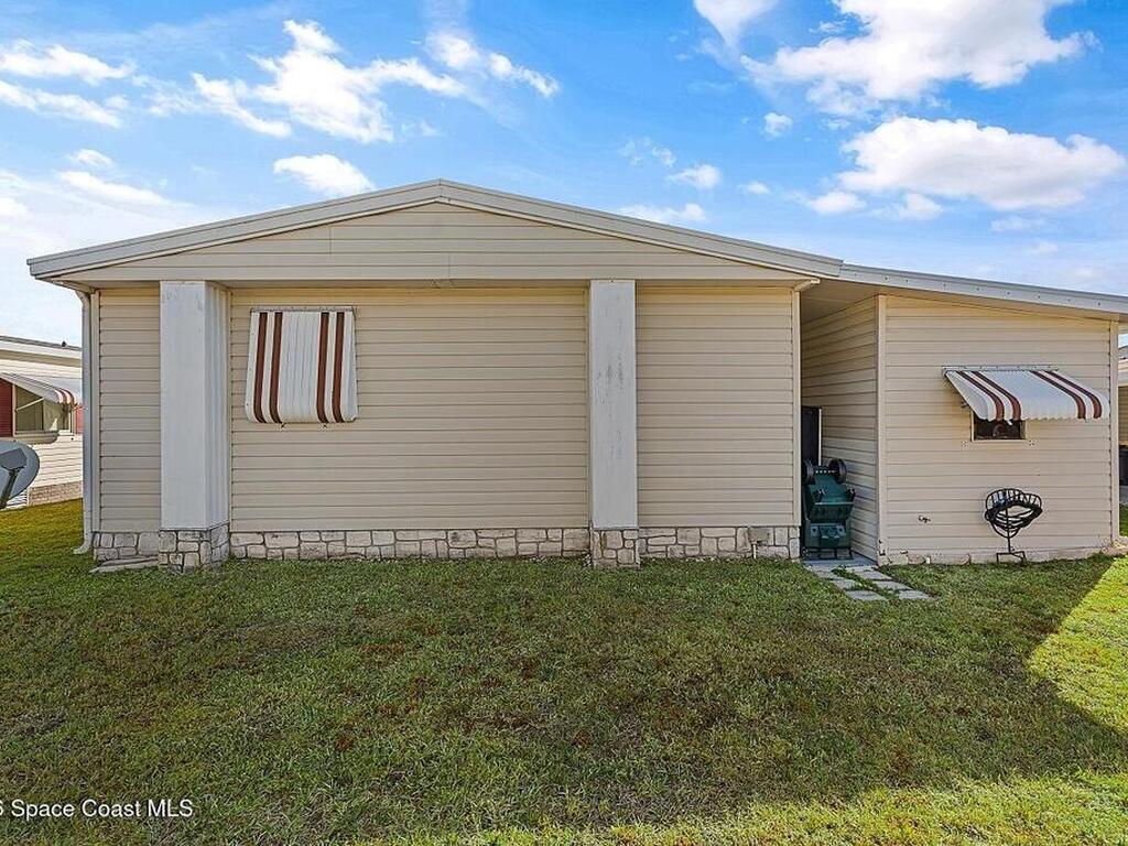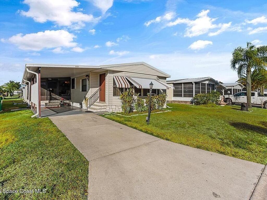 All-ages resort-style Barefoot Bay community. You own the land, no lot rent! Located in the desirable Flower Section, 2BR/2BA home offers 1, 294 sq ft w/ large living areas & an entertaining-style kitchen featuring a center island cooktop & abundant cabinetry. XLG primary suite with dual sinks, walk-in shower, and walk-in closet. Guest bedroom w/ en-suite bath. Sunroom w/windows, patio, storage shed, & 1-car carport. Updates metal roof (2020), WH (2020), partial re-pipe, vapor barrier replaced, added hurricane straps, generator plug, & clamshell shutters. Priced to sell bring your vision.