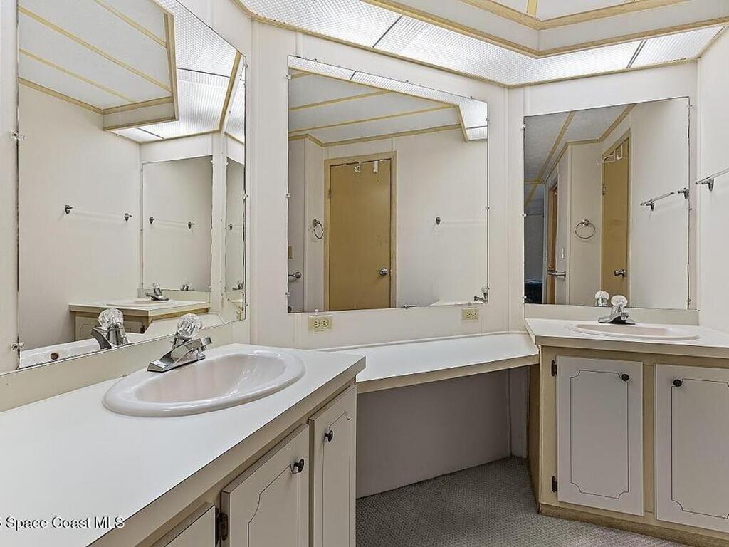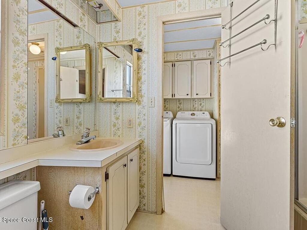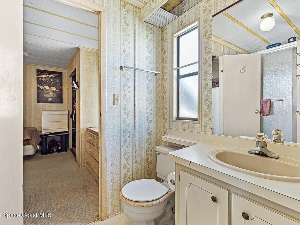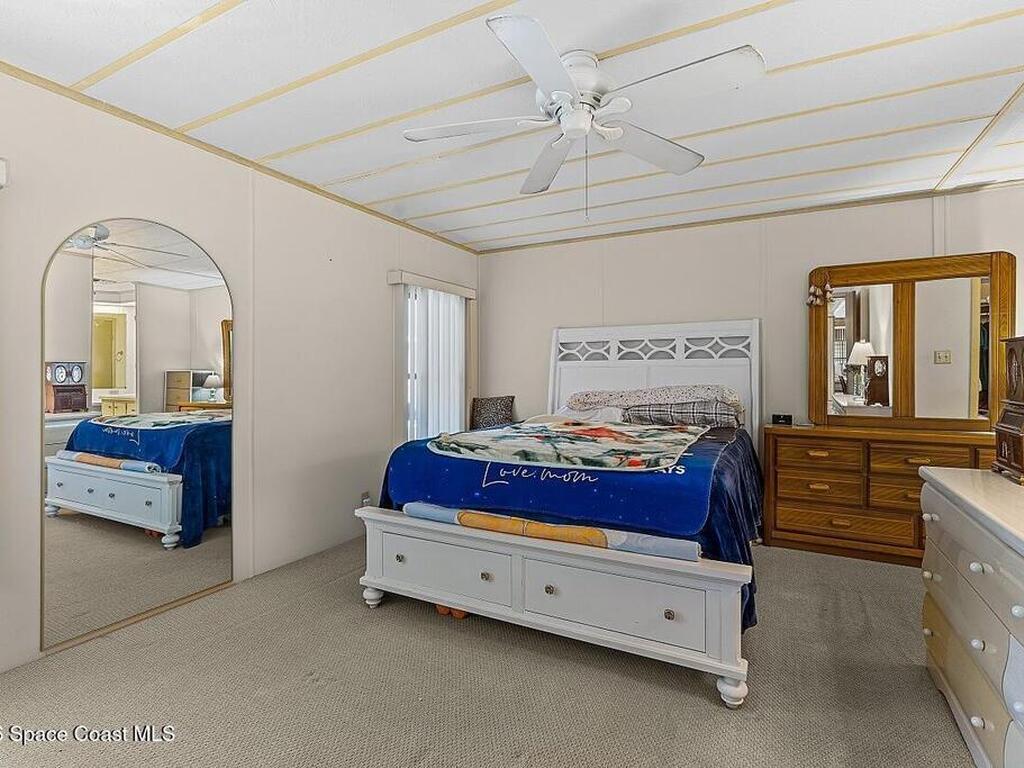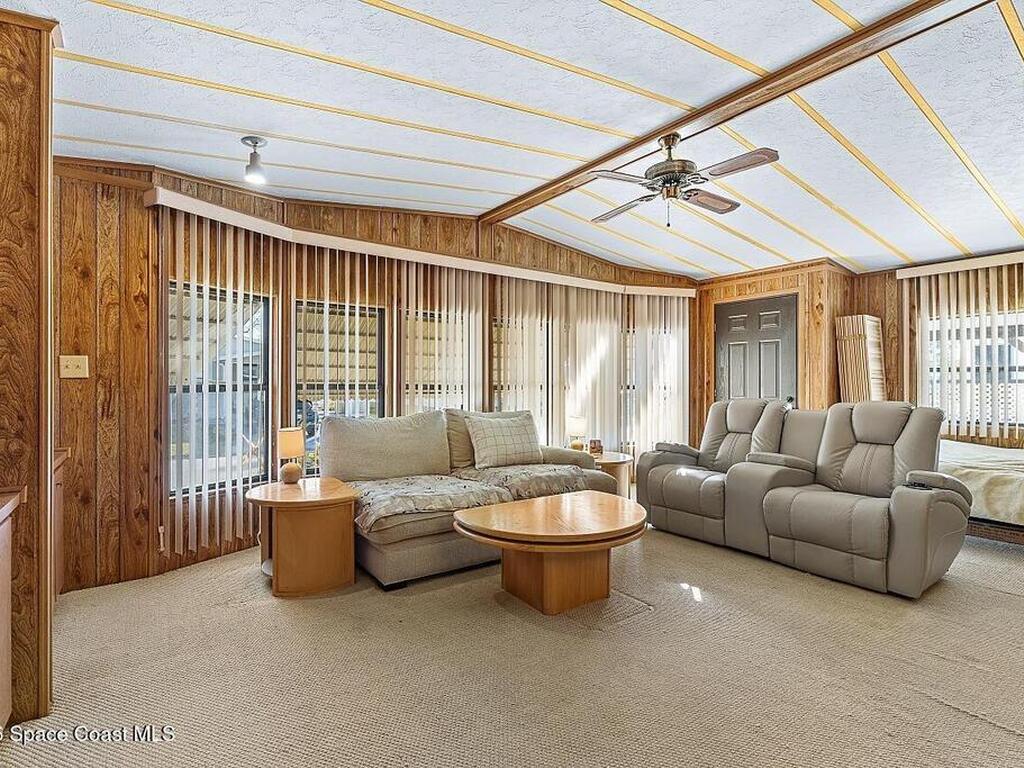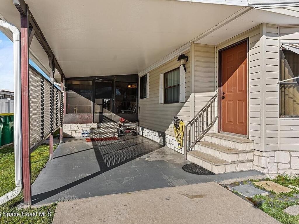 All-ages resort-style Barefoot Bay community. You own the land, no lot rent! Located in the desirable Flower Section, 2BR/2BA home offers 1, 294 sq ft w/ large living areas & an entertaining-style kitchen featuring a center island cooktop & abundant cabinetry. XLG primary suite with dual sinks, walk-in shower, and walk-in closet. Guest bedroom w/ en-suite bath. Sunroom w/windows, patio, storage shed, & 1-car carport. Updates metal roof (2020), WH (2020), partial re-pipe, vapor barrier replaced, added hurricane straps, generator plug, & clamshell shutters. Priced to sell bring your vision.