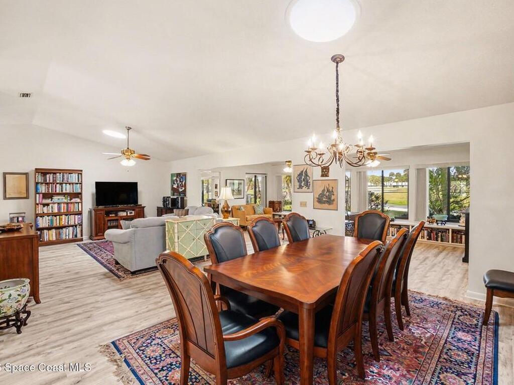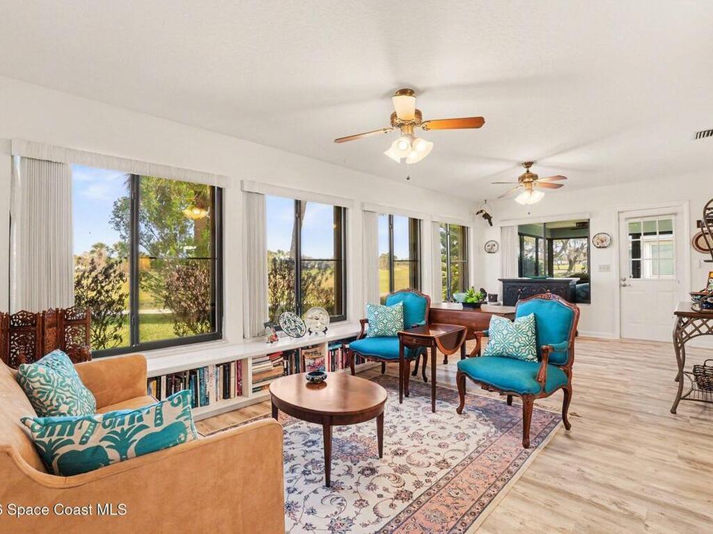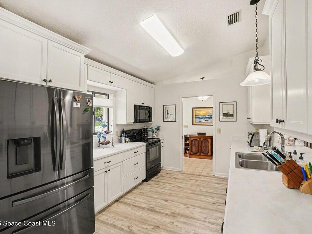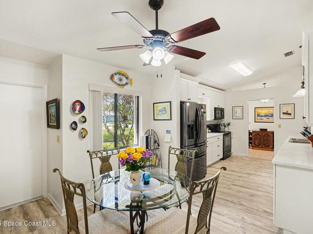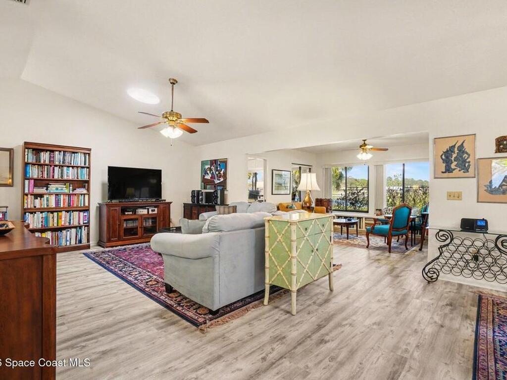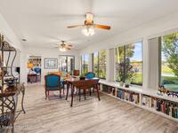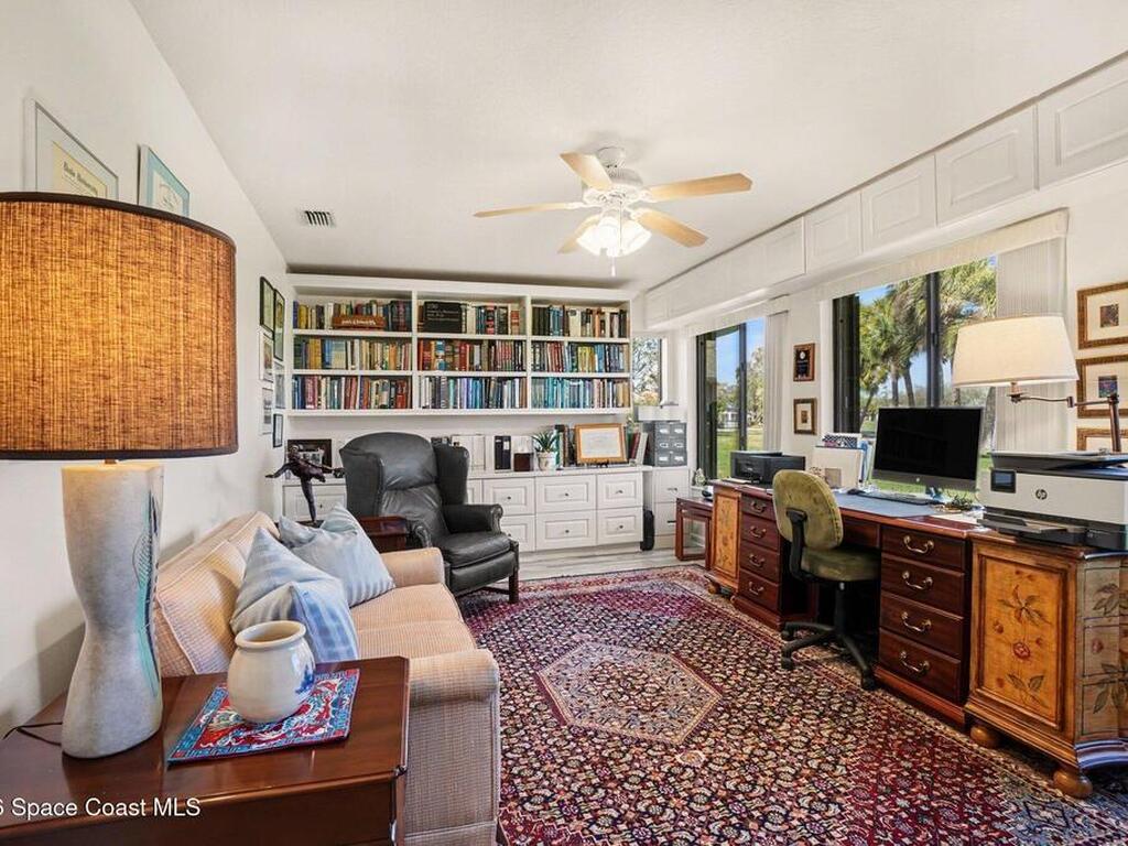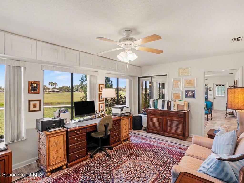 Expanded Raleigh model in a resort-style country club community, offering top-notch amenities and an exceptional Florida lifestyle. This well-maintained home features all new luxury vinyl flooring, with tile remaining in the bathrooms, creating a cohesive, low-maintenance look. The spacious Florida room with built-in window seating, opens to a covered lanai with a beautiful water and golf course view. The split-bedroom layout includes an oversized rear guest bedroom and an updated guest bath with Corian countertops, vessel sink, and updated vanity. A dedicated office off the Florida room showcases built-in bookcases/cabinets, large windows, creating a bright, inviting workspace. The kitchen features K Kraft custom cabinetry, Corian countertops, black appliances, and a functional layout with one side for laundry and a center coffee bar. All bathroom and kitchen cabinets are K Kraft custom, and the home includes almost all new light fixtures and fans for a fresh, modern feel.