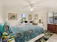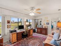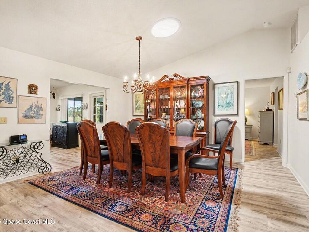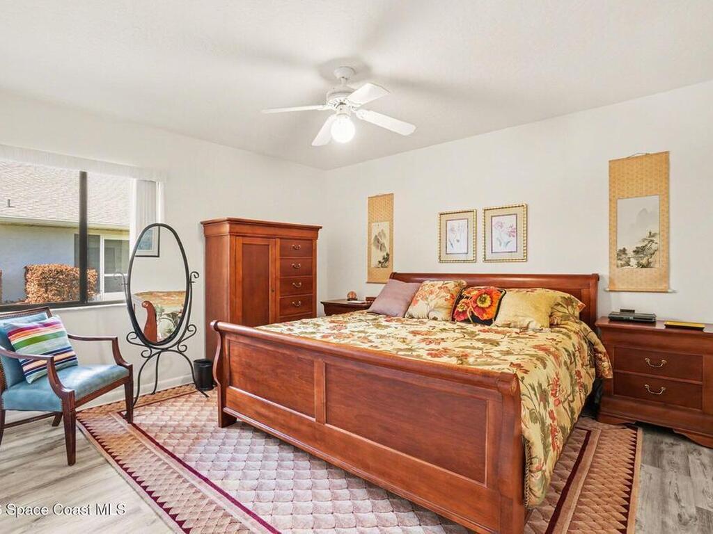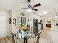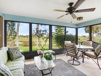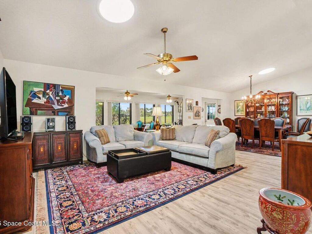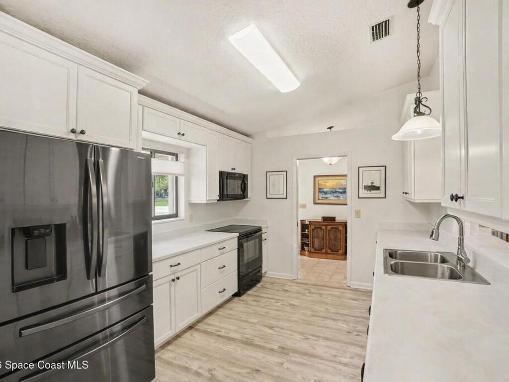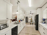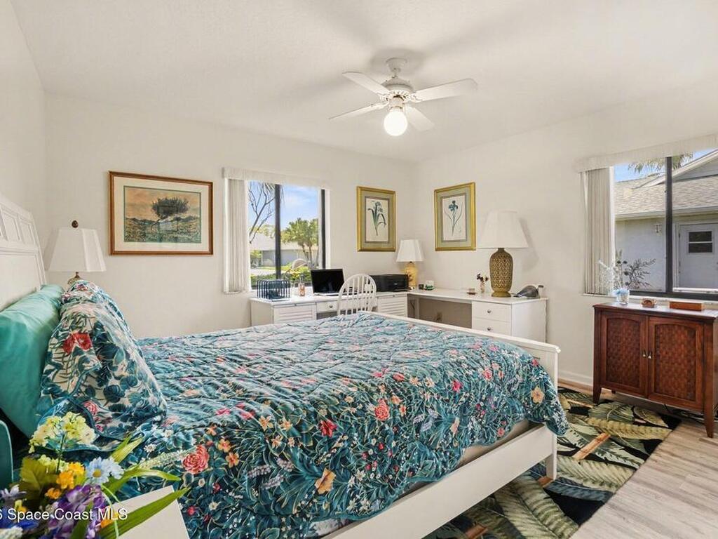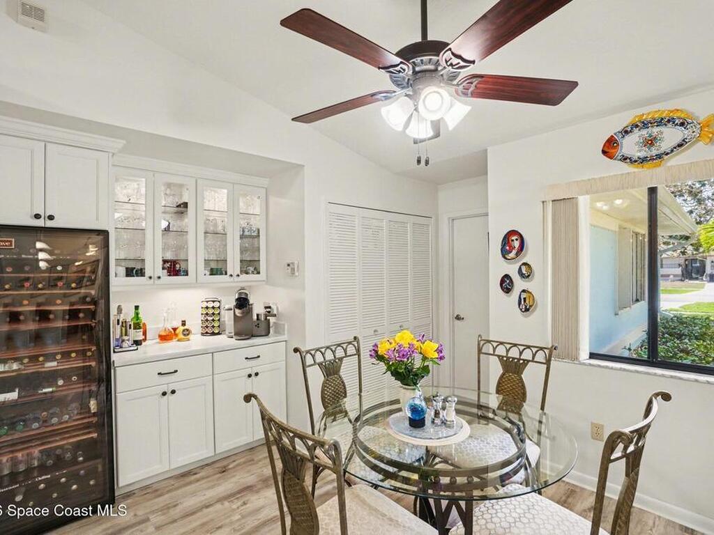 Expanded Raleigh model in a resort-style country club community, offering top-notch amenities and an exceptional Florida lifestyle. This well-maintained home features all new luxury vinyl flooring, with tile remaining in the bathrooms, creating a cohesive, low-maintenance look. The spacious Florida room with built-in window seating, opens to a covered lanai with a beautiful water and golf course view. The split-bedroom layout includes an oversized rear guest bedroom and an updated guest bath with Corian countertops, vessel sink, and updated vanity. A dedicated office off the Florida room showcases built-in bookcases/cabinets, large windows, creating a bright, inviting workspace. The kitchen features K Kraft custom cabinetry, Corian countertops, black appliances, and a functional layout with one side for laundry and a center coffee bar. All bathroom and kitchen cabinets are K Kraft custom, and the home includes almost all new light fixtures and fans for a fresh, modern feel.