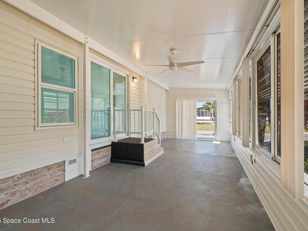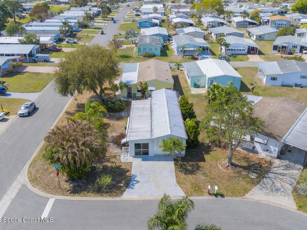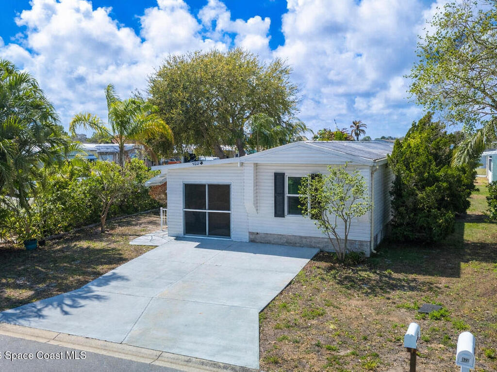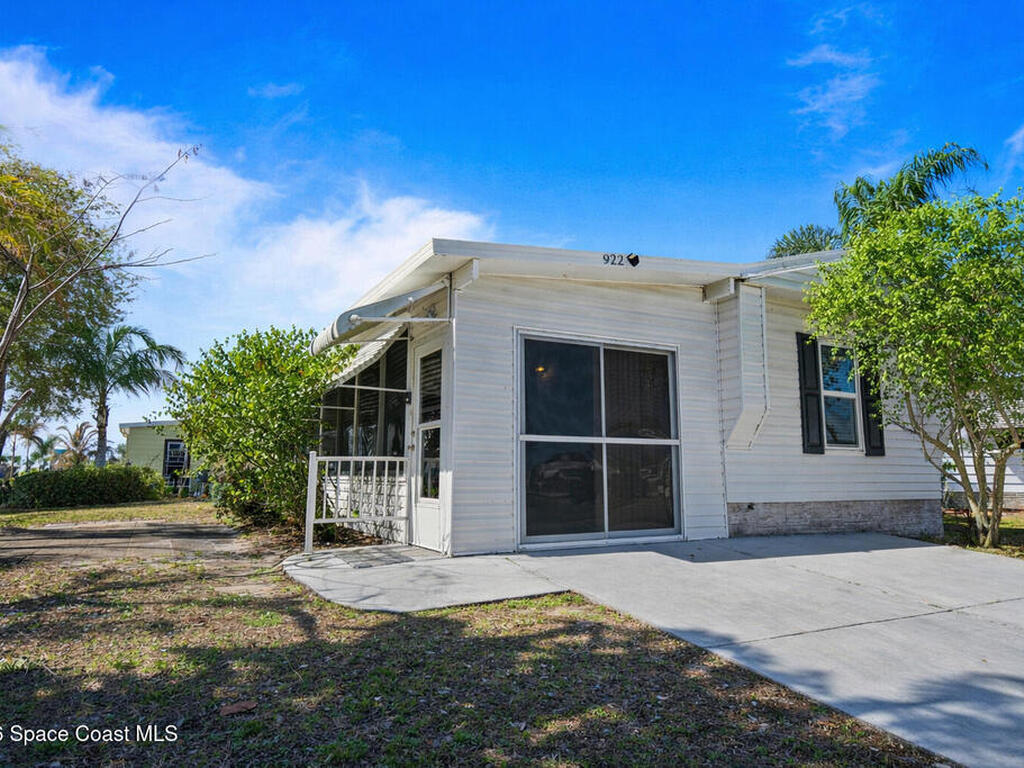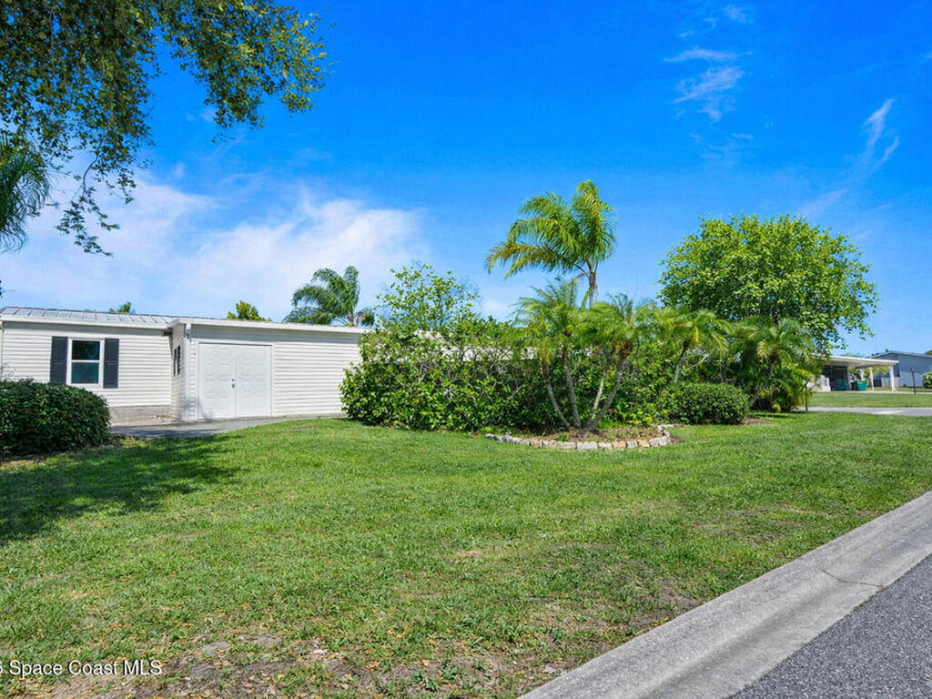 Move-in ready corner lot opportunity in Barefoot Bay! This well-maintained home offers 840 sq ft of living area plus over 500 sq ft of enclosed Florida room/flex space with windows, screens, and its own AC, creating comfortable additional living space beyond the official square footage. The enclosed area includes workshop and storage areas ideal for hobbies or projects. Inside you'll find tile flooring, vaulted ceilings, updated kitchen with white cabinetry, and a bright open living and dining layout. Both bathrooms have been updated, and the home also features a metal roof and spacious concrete driveway. Situated on a desirable corner lot with mature tropical landscaping. Located within the Barefoot Bay Recreation District offering pools, golf, tennis, pickleball, clubhouse activities, fishing pier, and beach access nearby. Exceptional value in Barefoot Bay and priced to sell. Ideal for seasonal living, full-time residence, or investment.