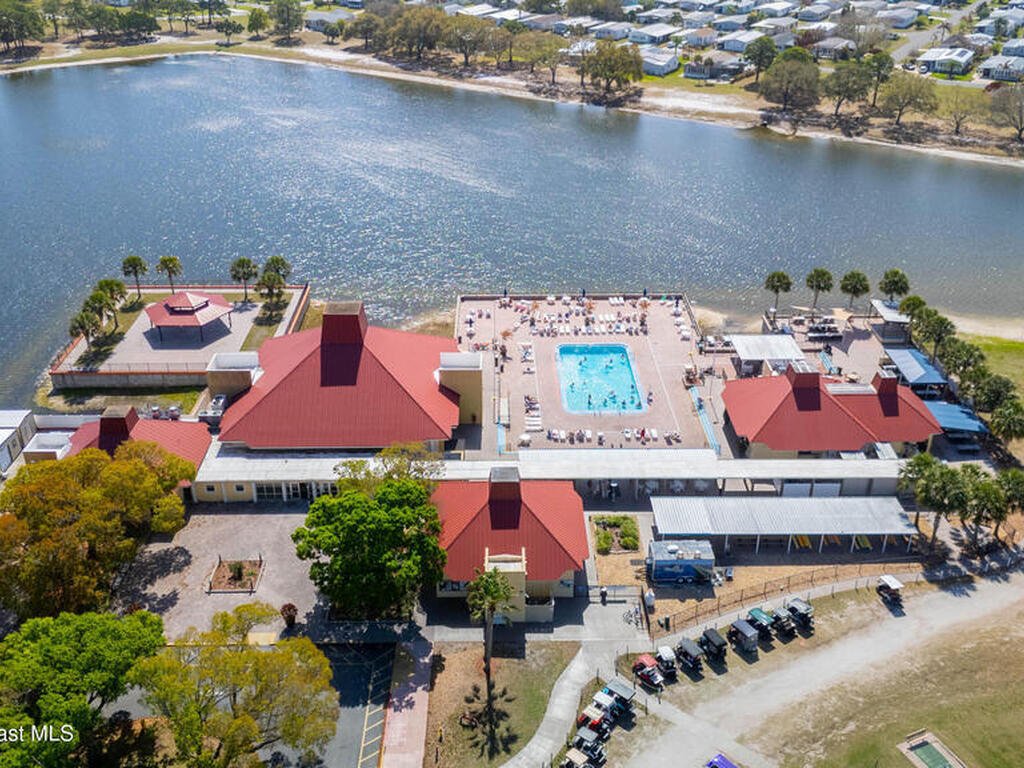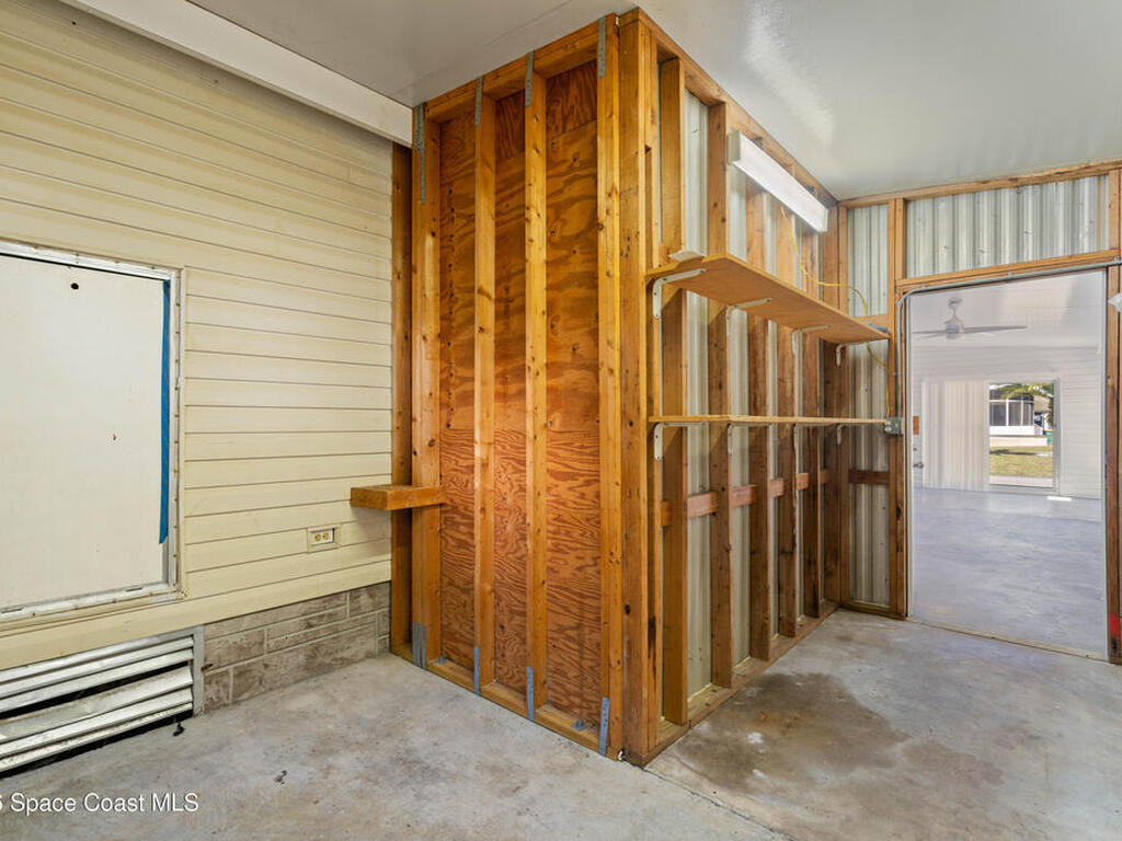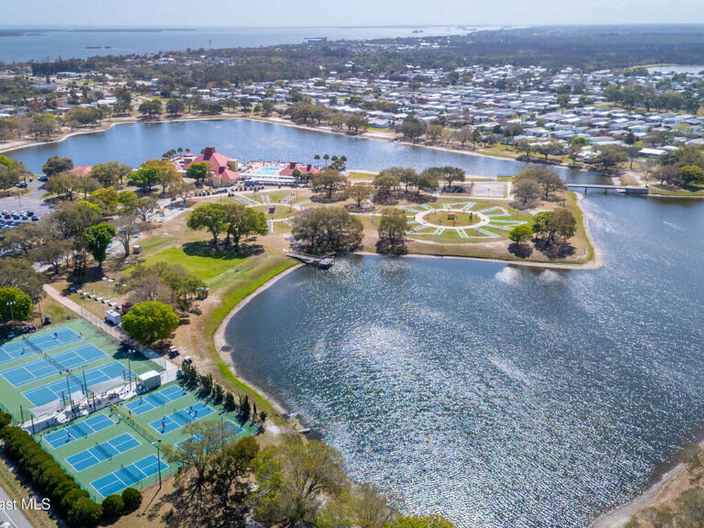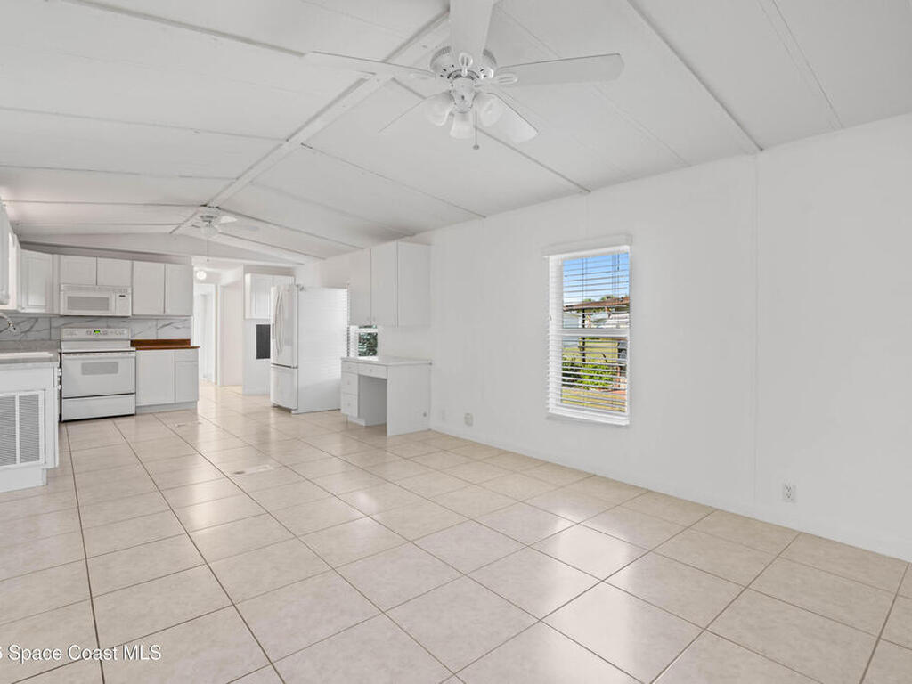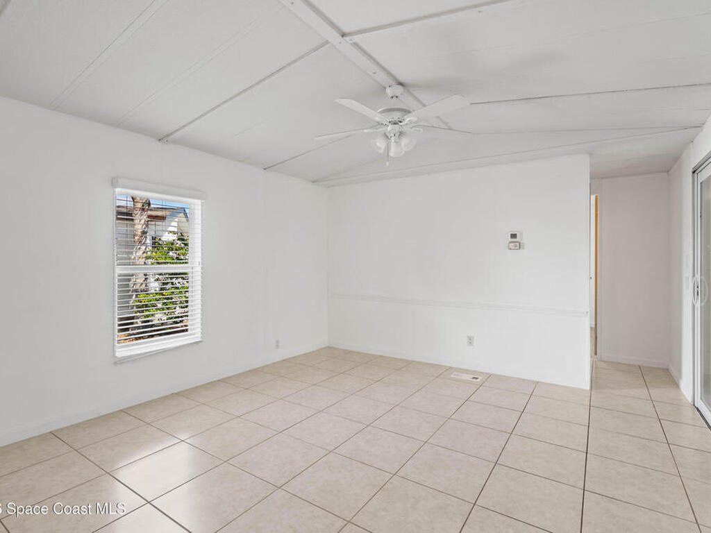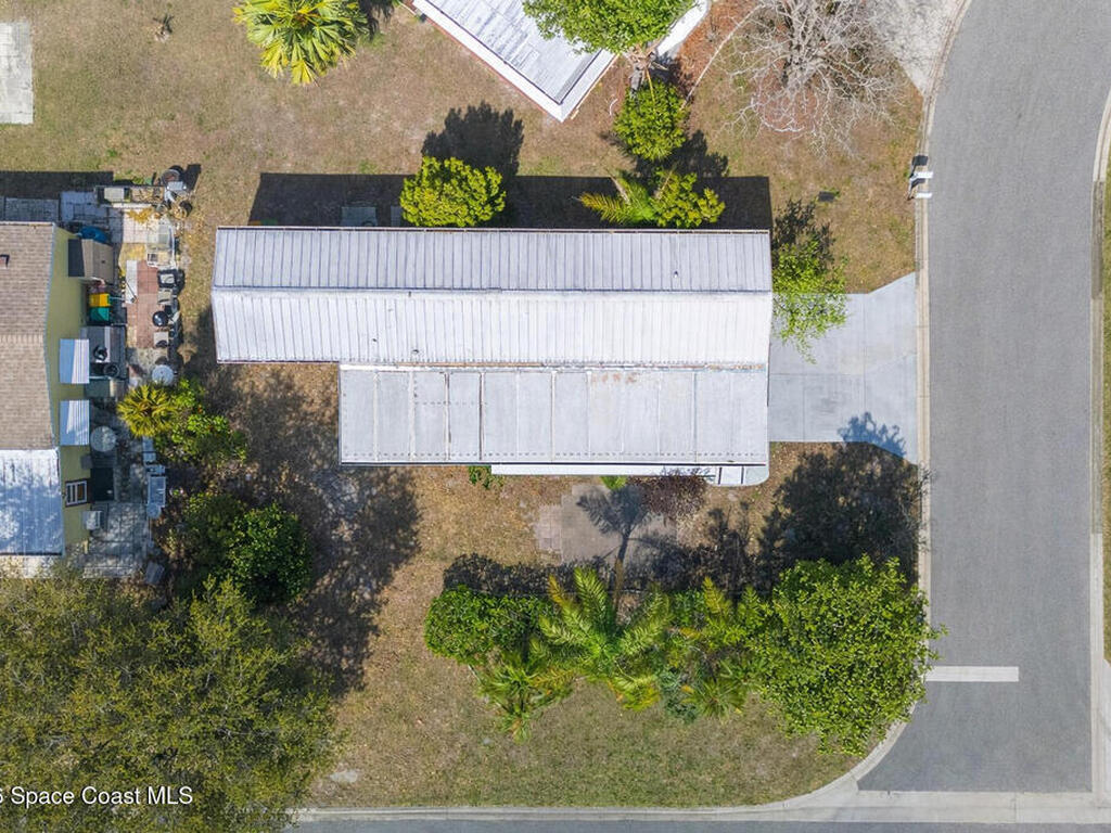 Move-in ready corner lot opportunity in Barefoot Bay! This well-maintained home offers 840 sq ft of living area plus over 500 sq ft of enclosed Florida room/flex space with windows, screens, and its own AC, creating comfortable additional living space beyond the official square footage. The enclosed area includes workshop and storage areas ideal for hobbies or projects. Inside you'll find tile flooring, vaulted ceilings, updated kitchen with white cabinetry, and a bright open living and dining layout. Both bathrooms have been updated, and the home also features a metal roof and spacious concrete driveway. Situated on a desirable corner lot with mature tropical landscaping. Located within the Barefoot Bay Recreation District offering pools, golf, tennis, pickleball, clubhouse activities, fishing pier, and beach access nearby. Exceptional value in Barefoot Bay and priced to sell. Ideal for seasonal living, full-time residence, or investment.