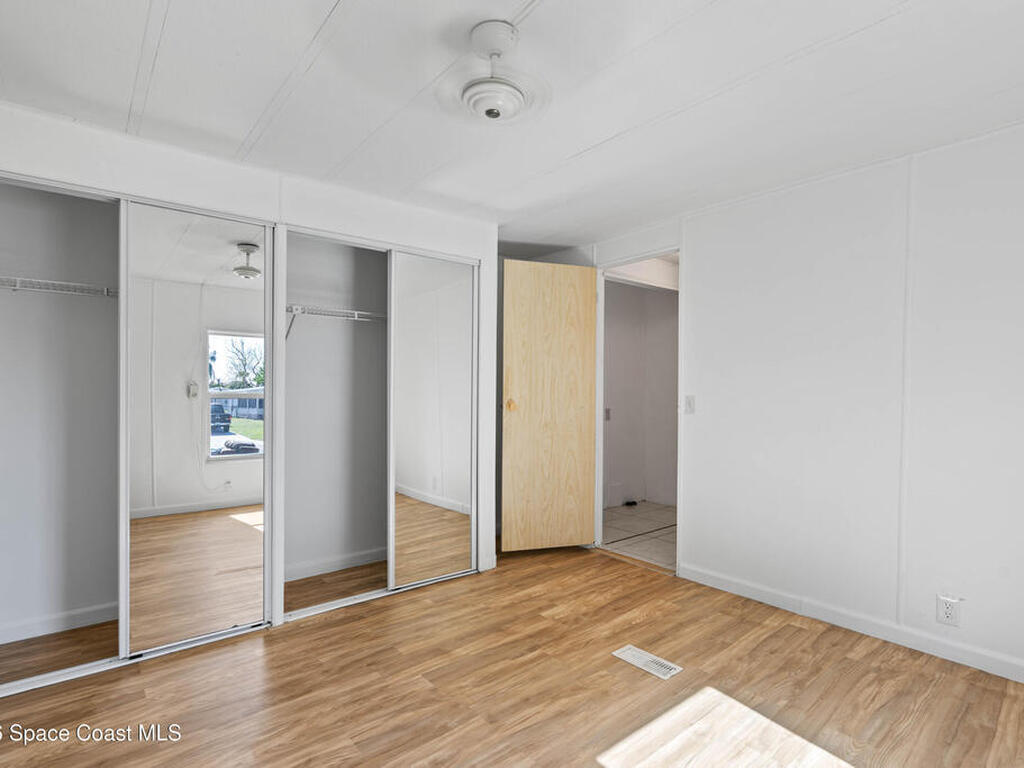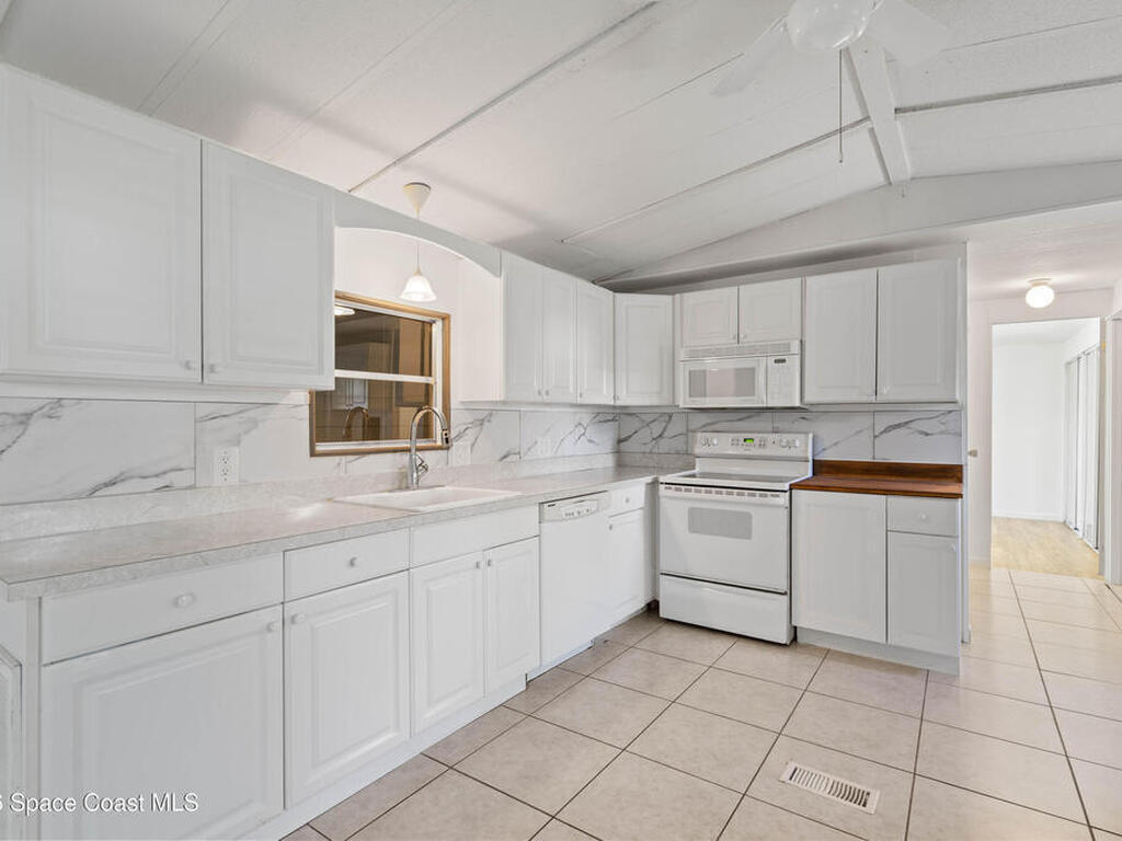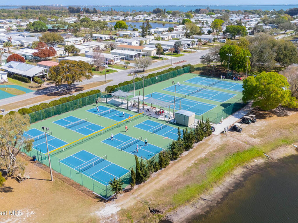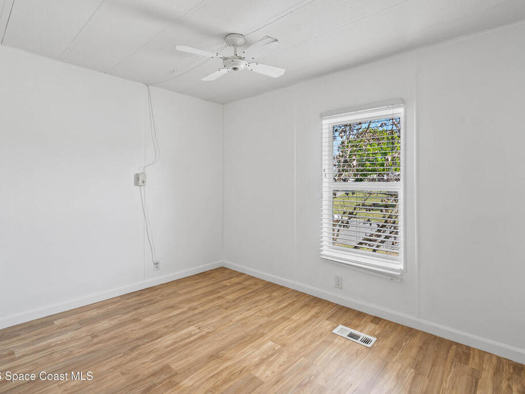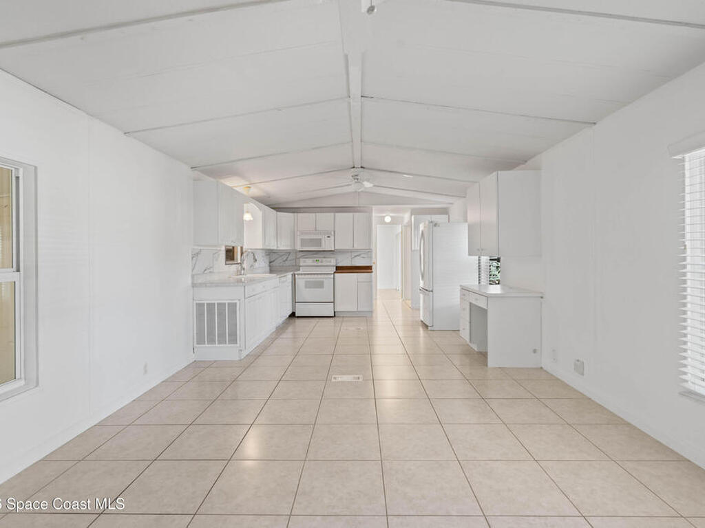 Move-in ready corner lot opportunity in Barefoot Bay! This well-maintained home offers 840 sq ft of living area plus over 500 sq ft of enclosed Florida room/flex space with windows, screens, and its own AC, creating comfortable additional living space beyond the official square footage. The enclosed area includes workshop and storage areas ideal for hobbies or projects. Inside you'll find tile flooring, vaulted ceilings, updated kitchen with white cabinetry, and a bright open living and dining layout. Both bathrooms have been updated, and the home also features a metal roof and spacious concrete driveway. Situated on a desirable corner lot with mature tropical landscaping. Located within the Barefoot Bay Recreation District offering pools, golf, tennis, pickleball, clubhouse activities, fishing pier, and beach access nearby. Exceptional value in Barefoot Bay and priced to sell. Ideal for seasonal living, full-time residence, or investment.