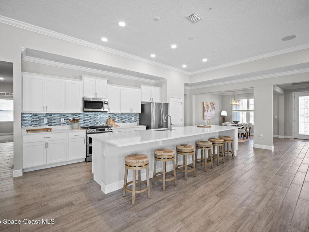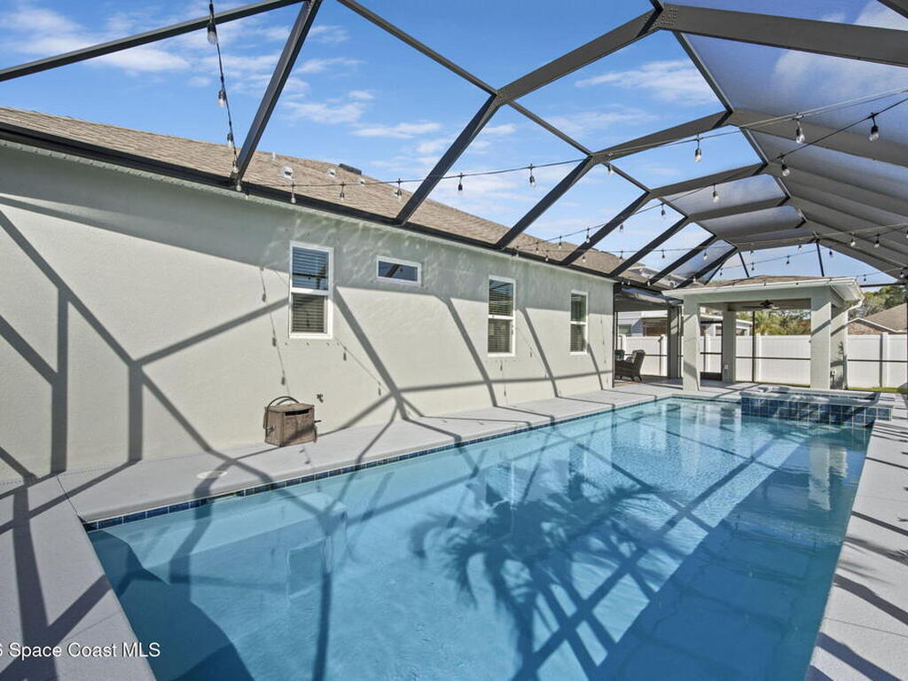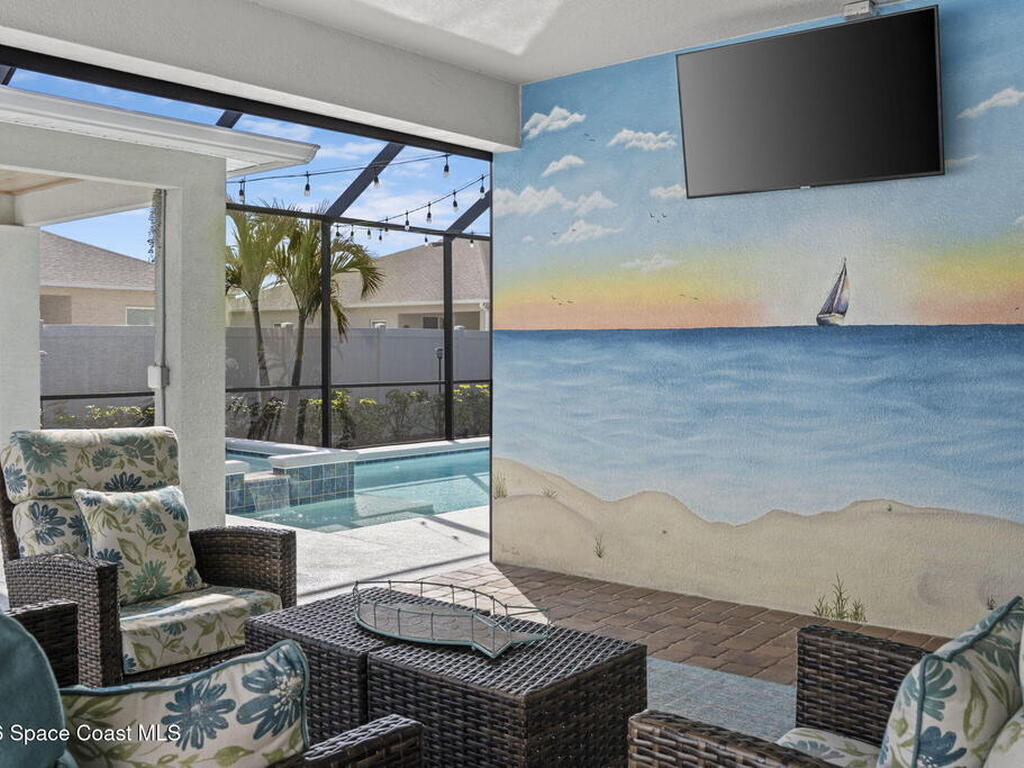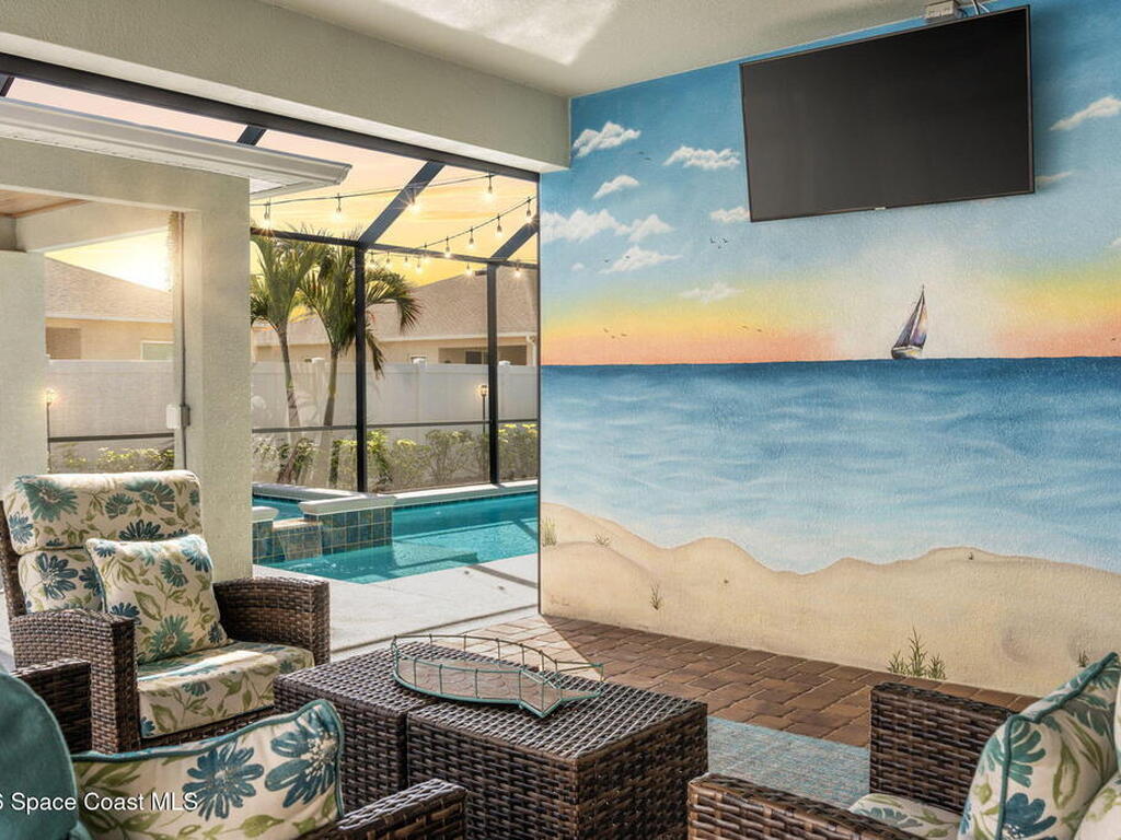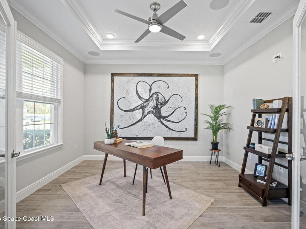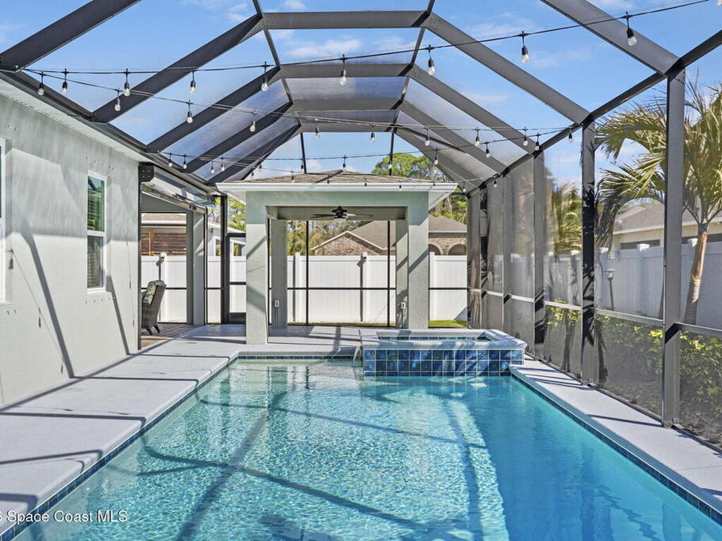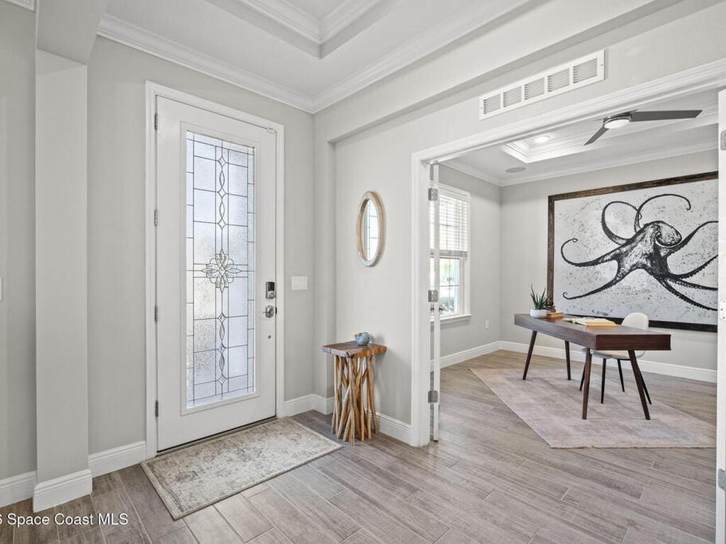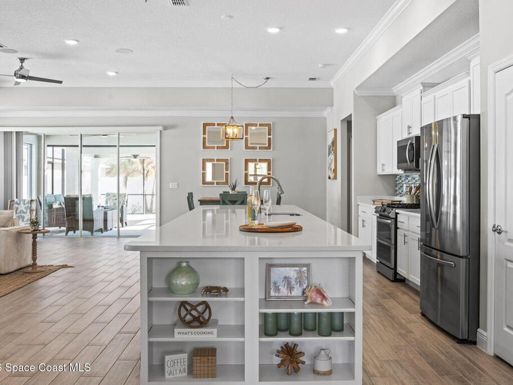 Step into the Space Coast Lifestyle you've been dreaming of in N Merritt Island! Offering just over 3, 000', 4BR, 3BA + Office & 3 Car Garage. Soaring 12' Ceilings w/ Tray Accents, Crown Molding throughout & a bright Open Floor Plan. Chef's Kitchen features Quartz Counters, 42'' Solid Wood Cabinets, Custom Backsplash, Energy Star SS Appliances, Wine Frig & oversized 14' Island for everyday living & entertaining. Wired for Whole Home Audio/Video, Smart Garage Opener & Gas Tankless WH. Primary Suite offers a massive Walk-in CA Closet & Spa Style Bath w/ Dual Sinks, Quartz Counters, & Walk-in Shower w/ Dual Shower Heads. Backyard retreat that lives like a private resort, w/ a Screened-in, Gas Heated Pool + Spa, Custom CBS Gazebo, & Kevlar Hurricane Retractable Screens + a Key West Style Mural in the Patio Area so it feels like your own beach escape. Impact Windows + Storm Shutters for peace of mind. Approx 10 min to KSC, 20 min to Cocoa Beach & 40 min to MCO.