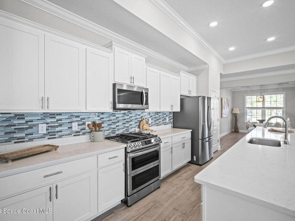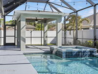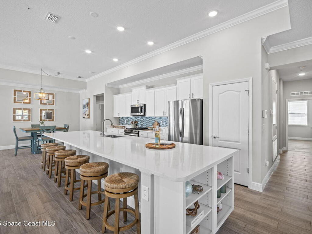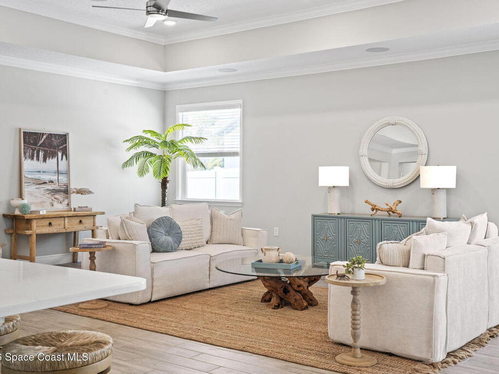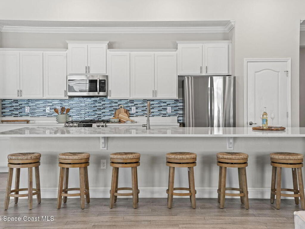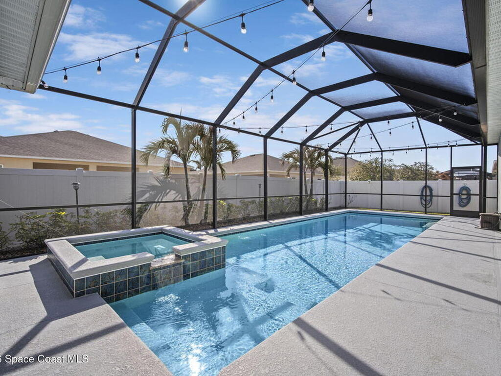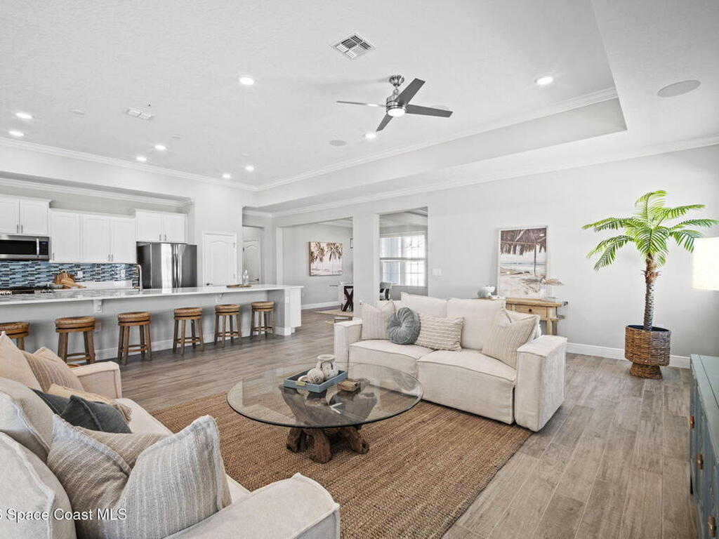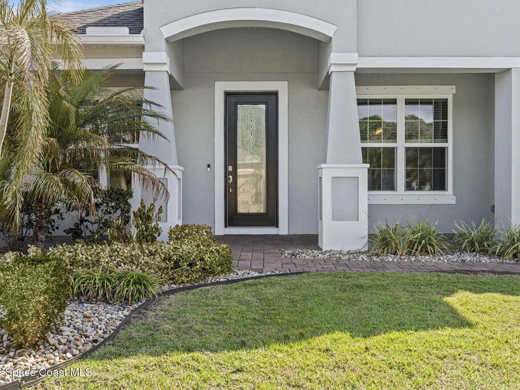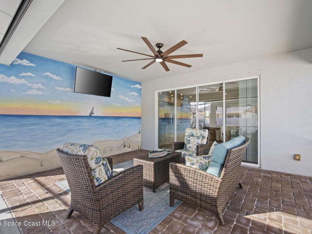 Step into the Space Coast Lifestyle you've been dreaming of in N Merritt Island! Offering just over 3, 000', 4BR, 3BA + Office & 3 Car Garage. Soaring 12' Ceilings w/ Tray Accents, Crown Molding throughout & a bright Open Floor Plan. Chef's Kitchen features Quartz Counters, 42'' Solid Wood Cabinets, Custom Backsplash, Energy Star SS Appliances, Wine Frig & oversized 14' Island for everyday living & entertaining. Wired for Whole Home Audio/Video, Smart Garage Opener & Gas Tankless WH. Primary Suite offers a massive Walk-in CA Closet & Spa Style Bath w/ Dual Sinks, Quartz Counters, & Walk-in Shower w/ Dual Shower Heads. Backyard retreat that lives like a private resort, w/ a Screened-in, Gas Heated Pool + Spa, Custom CBS Gazebo, & Kevlar Hurricane Retractable Screens + a Key West Style Mural in the Patio Area so it feels like your own beach escape. Impact Windows + Storm Shutters for peace of mind. Approx 10 min to KSC, 20 min to Cocoa Beach & 40 min to MCO.