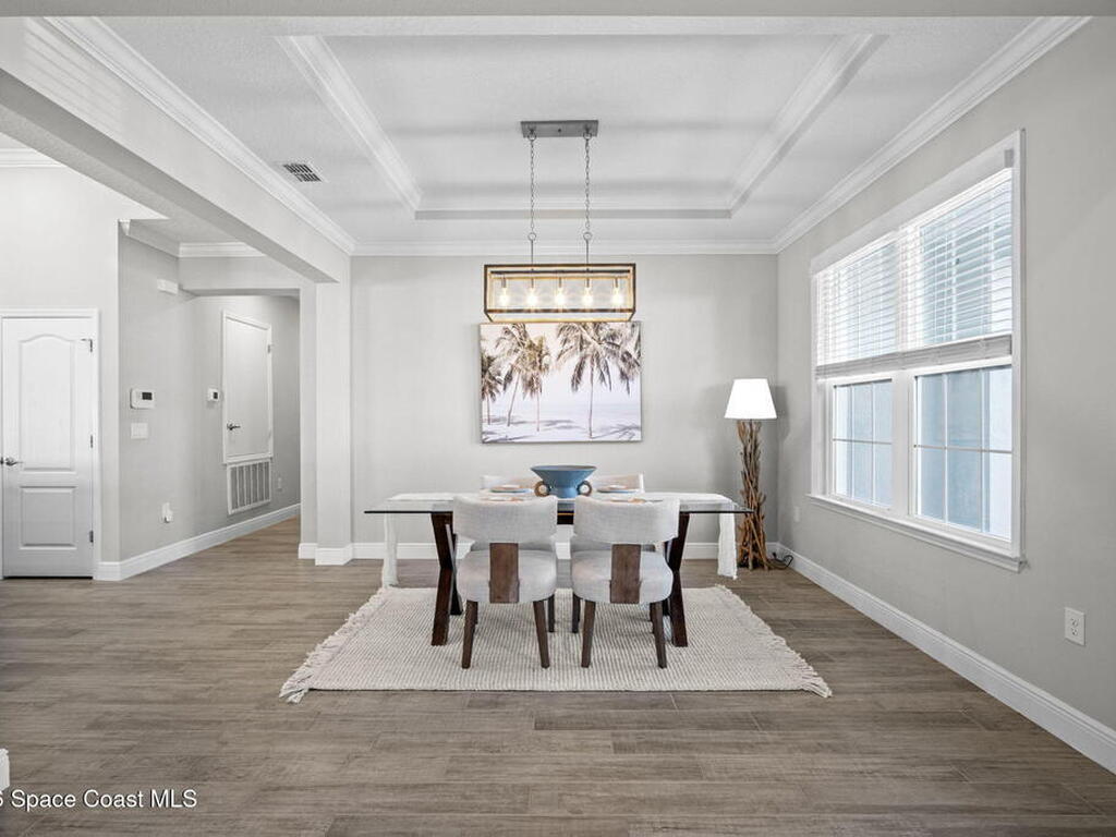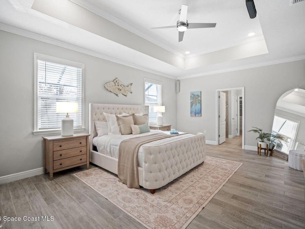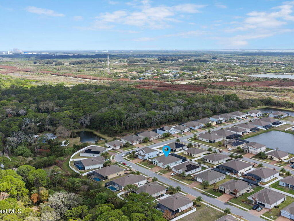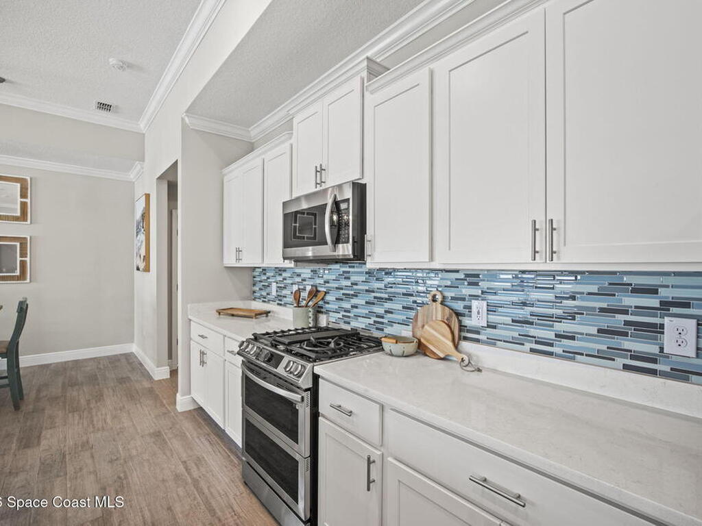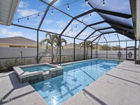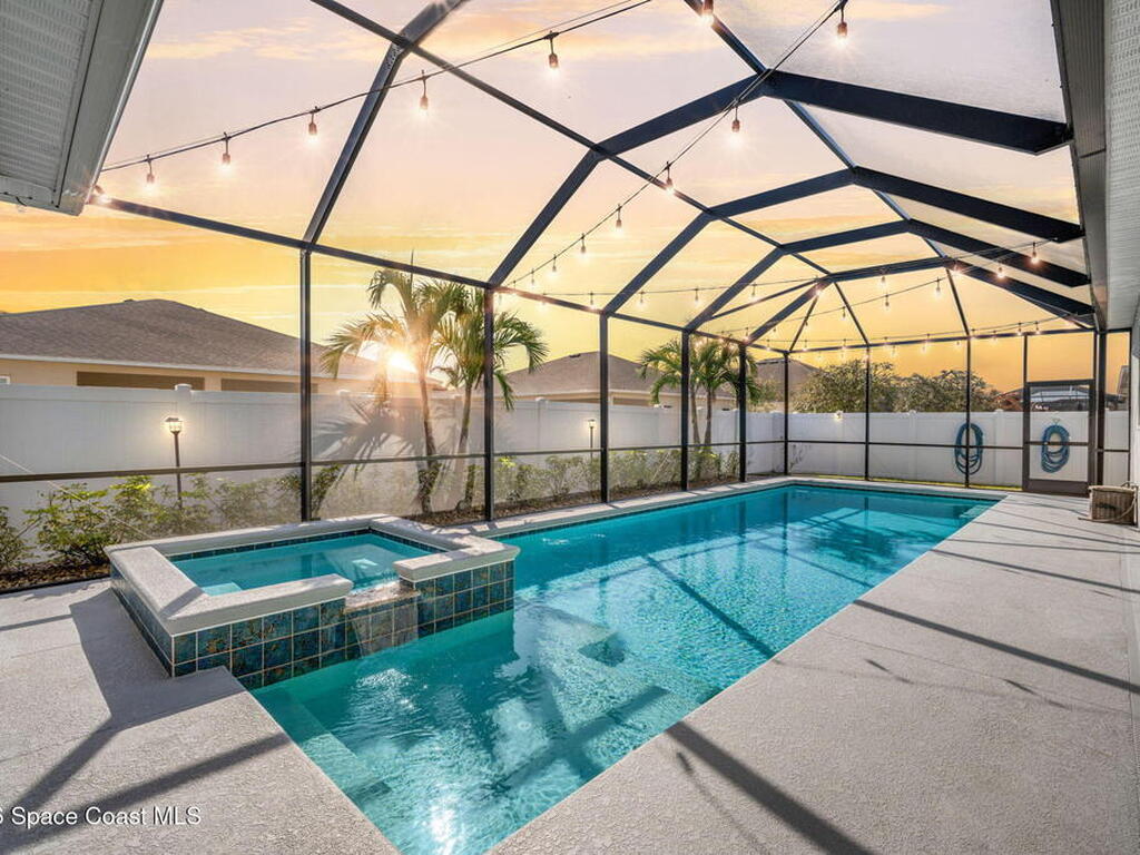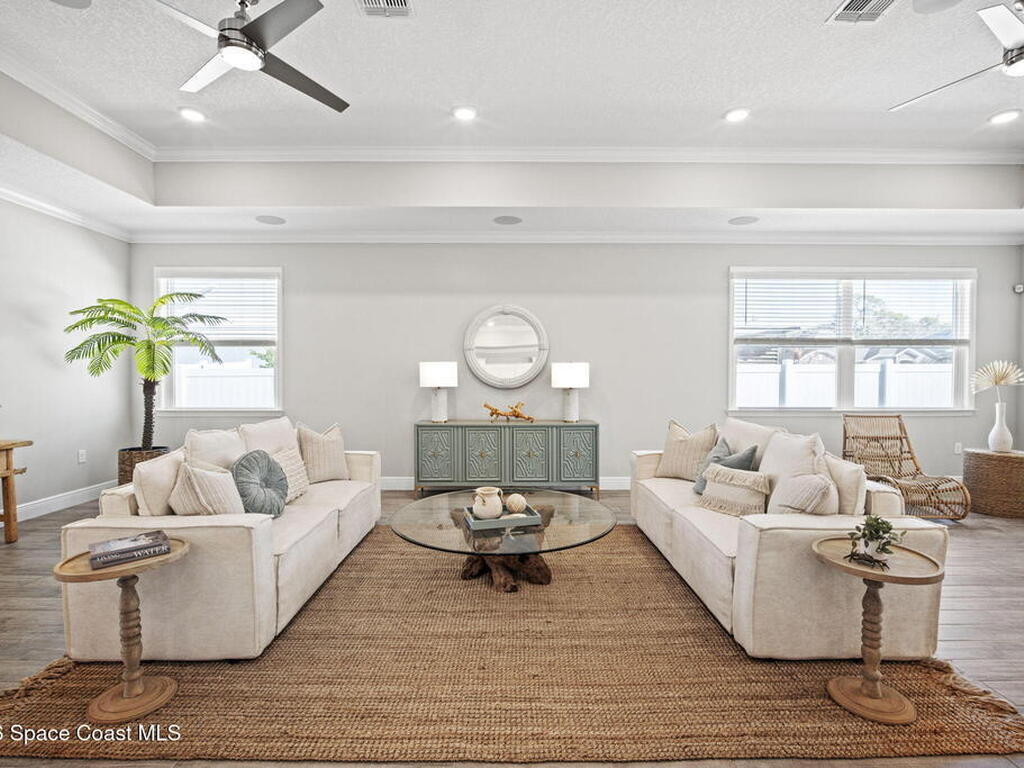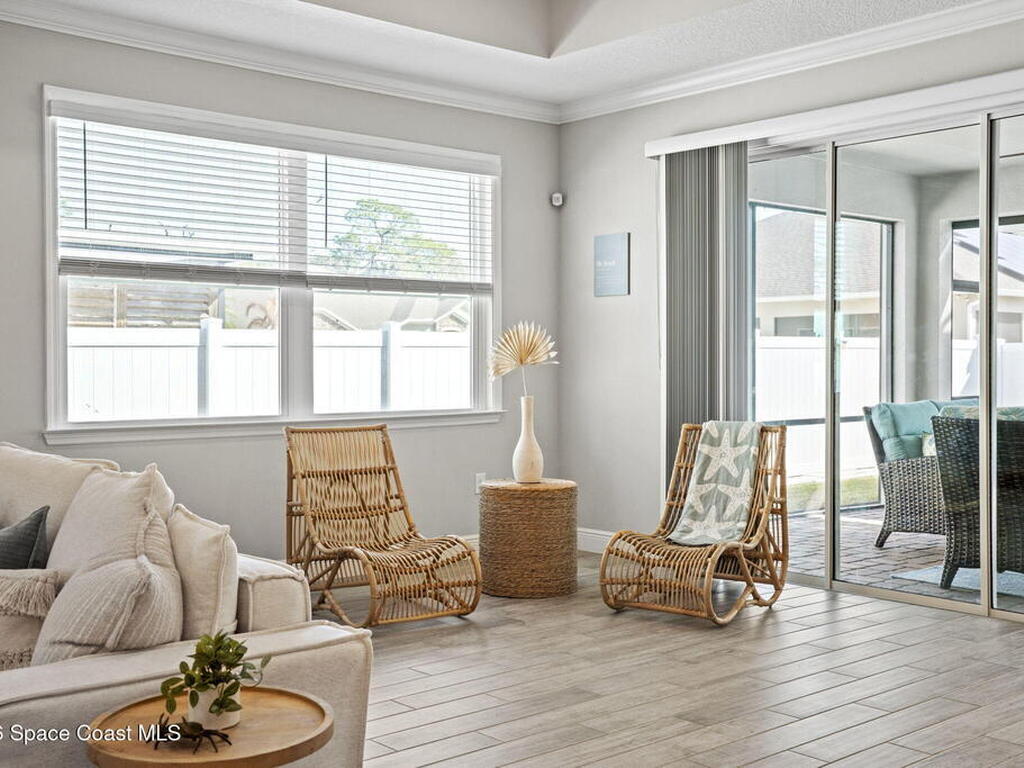 Step into the Space Coast Lifestyle you've been dreaming of in N Merritt Island! Offering just over 3, 000', 4BR, 3BA + Office & 3 Car Garage. Soaring 12' Ceilings w/ Tray Accents, Crown Molding throughout & a bright Open Floor Plan. Chef's Kitchen features Quartz Counters, 42'' Solid Wood Cabinets, Custom Backsplash, Energy Star SS Appliances, Wine Frig & oversized 14' Island for everyday living & entertaining. Wired for Whole Home Audio/Video, Smart Garage Opener & Gas Tankless WH. Primary Suite offers a massive Walk-in CA Closet & Spa Style Bath w/ Dual Sinks, Quartz Counters, & Walk-in Shower w/ Dual Shower Heads. Backyard retreat that lives like a private resort, w/ a Screened-in, Gas Heated Pool + Spa, Custom CBS Gazebo, & Kevlar Hurricane Retractable Screens + a Key West Style Mural in the Patio Area so it feels like your own beach escape. Impact Windows + Storm Shutters for peace of mind. Approx 10 min to KSC, 20 min to Cocoa Beach & 40 min to MCO.