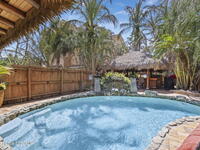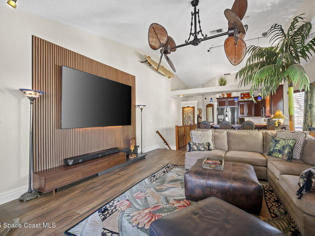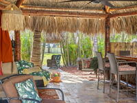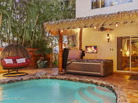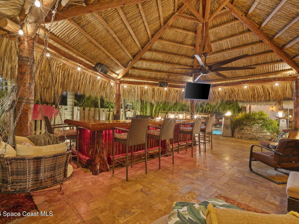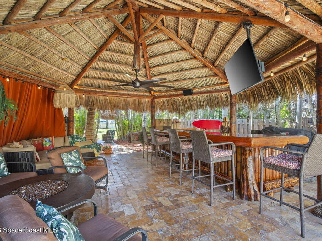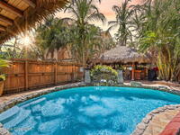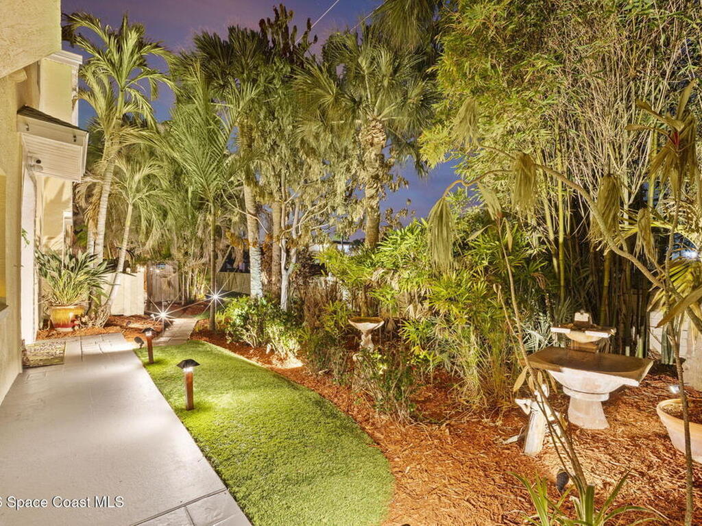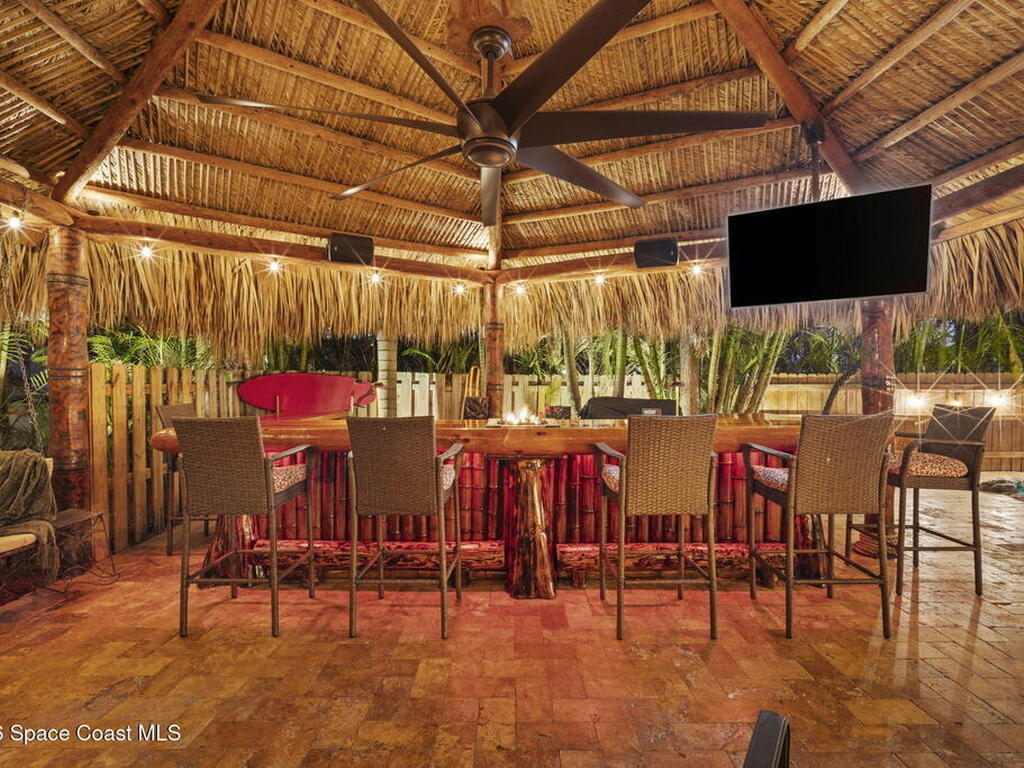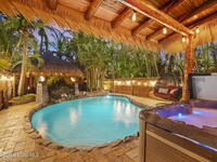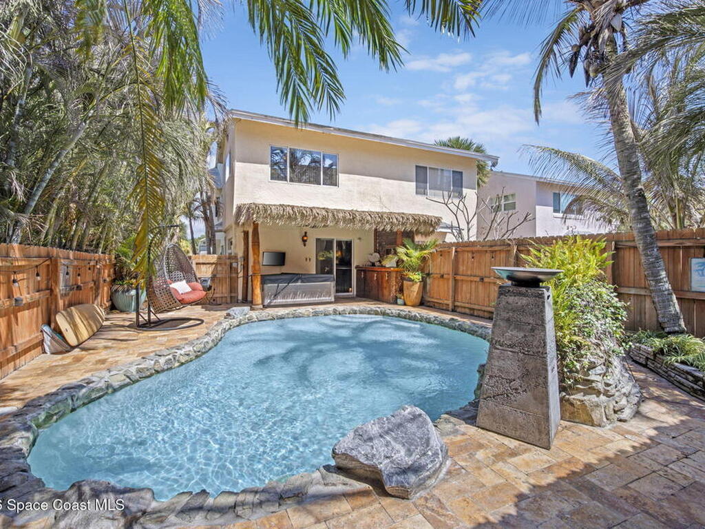 Tropical paradise just steps from the beach in Cape Canaveral! This one-of-a-kind 3 bedroom, 2 baths + office townhome is the only property on the east side of Ridgewood Ave to span an entire city block (BUILDABLE LOT INCLUDED), offering rare privacy and endless possibilities. Arrive through lush, manicured tropical landscaping that feels like your own island retreat. The backyard is an entertainer's dream with a stunning blue lagoon pool, travertine pavers, and a one-of-a-kind tiki pavilion with a fully built-out bar. A rare vacant lot provides room for a guest house, future investment property, or space for all your toys. Inside feels like a Hawaiian escape with wood-look tile floors and custom touches throughout. The open floor plan flows effortlessly as the kitchen overlooks the spacious family room with vaulted ceilings. The primary suite overlooks the tropical backyard and features a spa-like bath with steam shower and soaking tub.