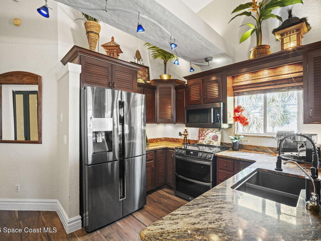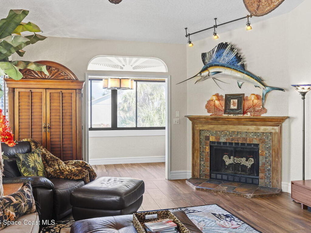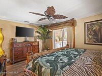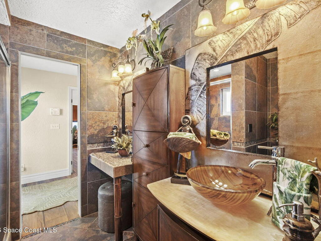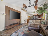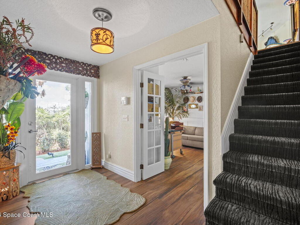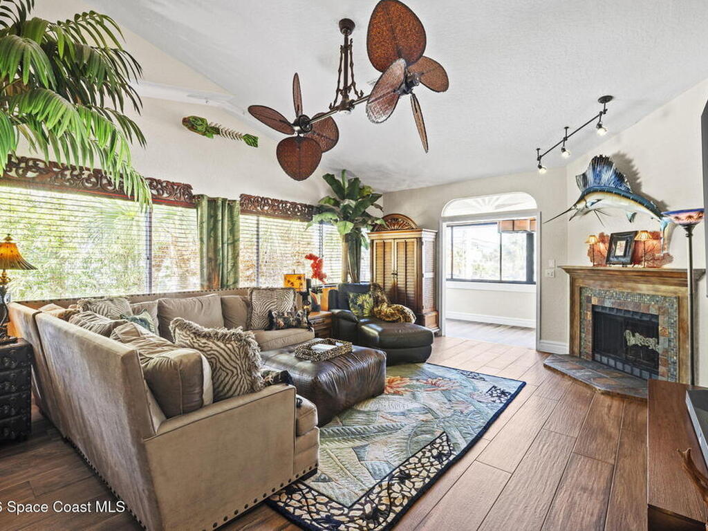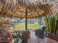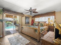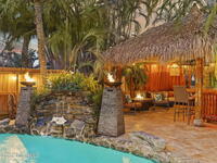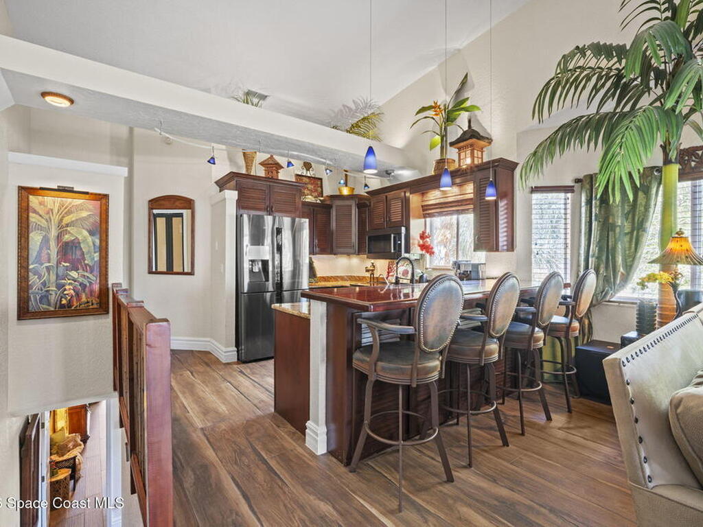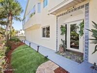 Tropical paradise just steps from the beach in Cape Canaveral! This one-of-a-kind 3 bedroom, 2 baths + office townhome is the only property on the east side of Ridgewood Ave to span an entire city block (BUILDABLE LOT INCLUDED), offering rare privacy and endless possibilities. Arrive through lush, manicured tropical landscaping that feels like your own island retreat. The backyard is an entertainer's dream with a stunning blue lagoon pool, travertine pavers, and a one-of-a-kind tiki pavilion with a fully built-out bar. A rare vacant lot provides room for a guest house, future investment property, or space for all your toys. Inside feels like a Hawaiian escape with wood-look tile floors and custom touches throughout. The open floor plan flows effortlessly as the kitchen overlooks the spacious family room with vaulted ceilings. The primary suite overlooks the tropical backyard and features a spa-like bath with steam shower and soaking tub.