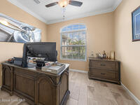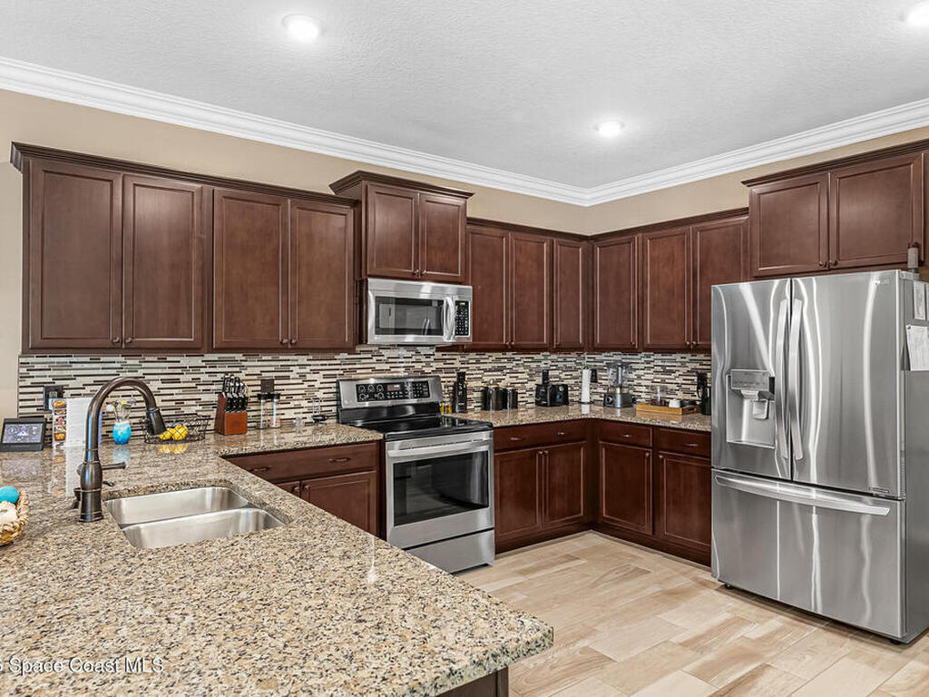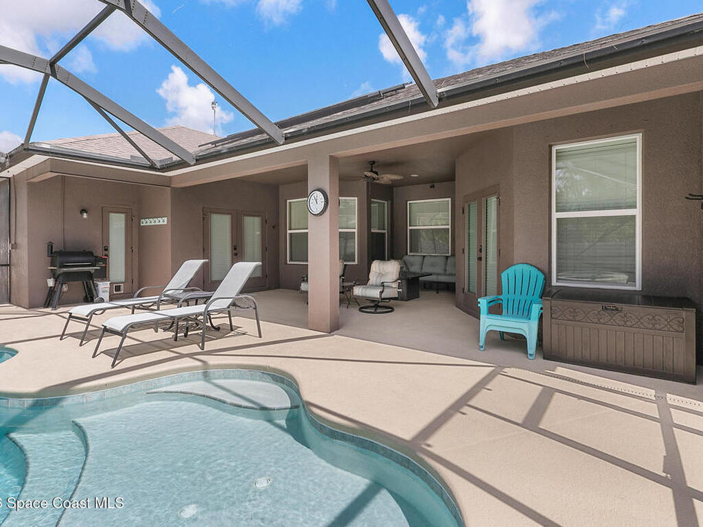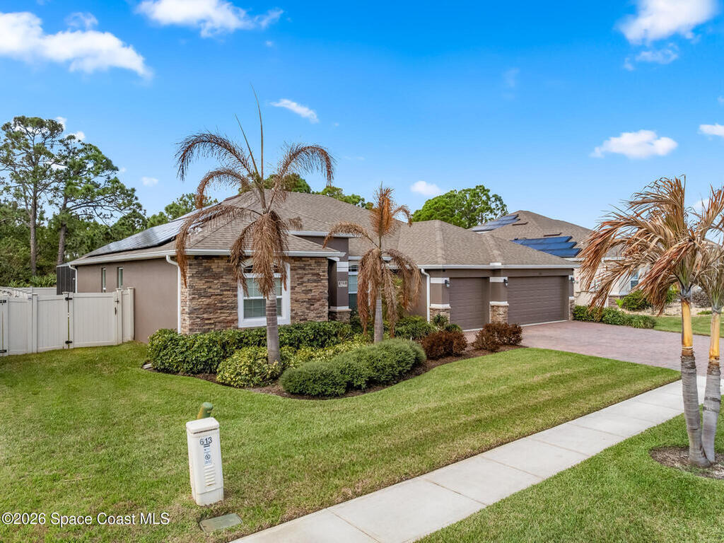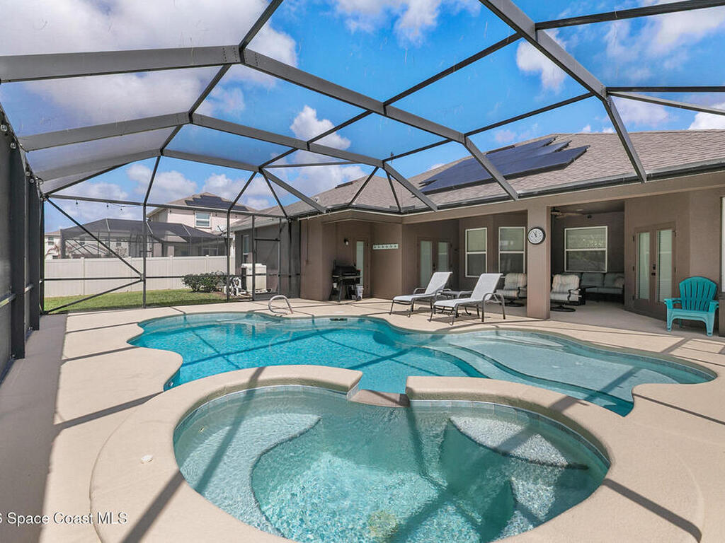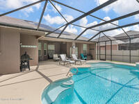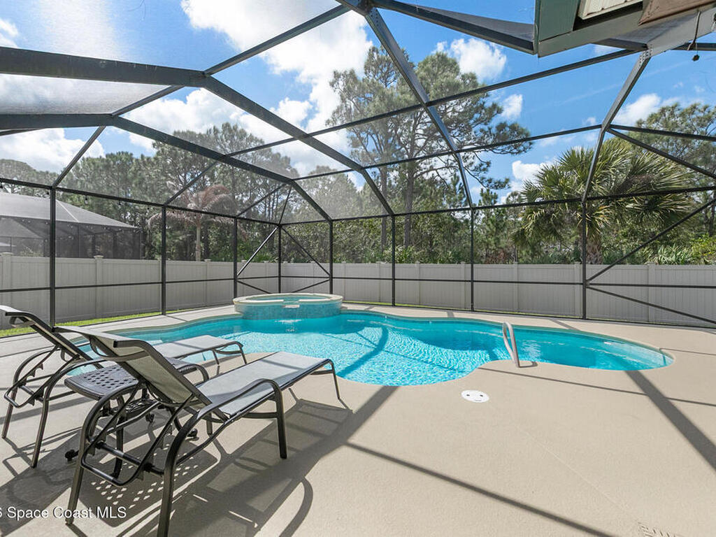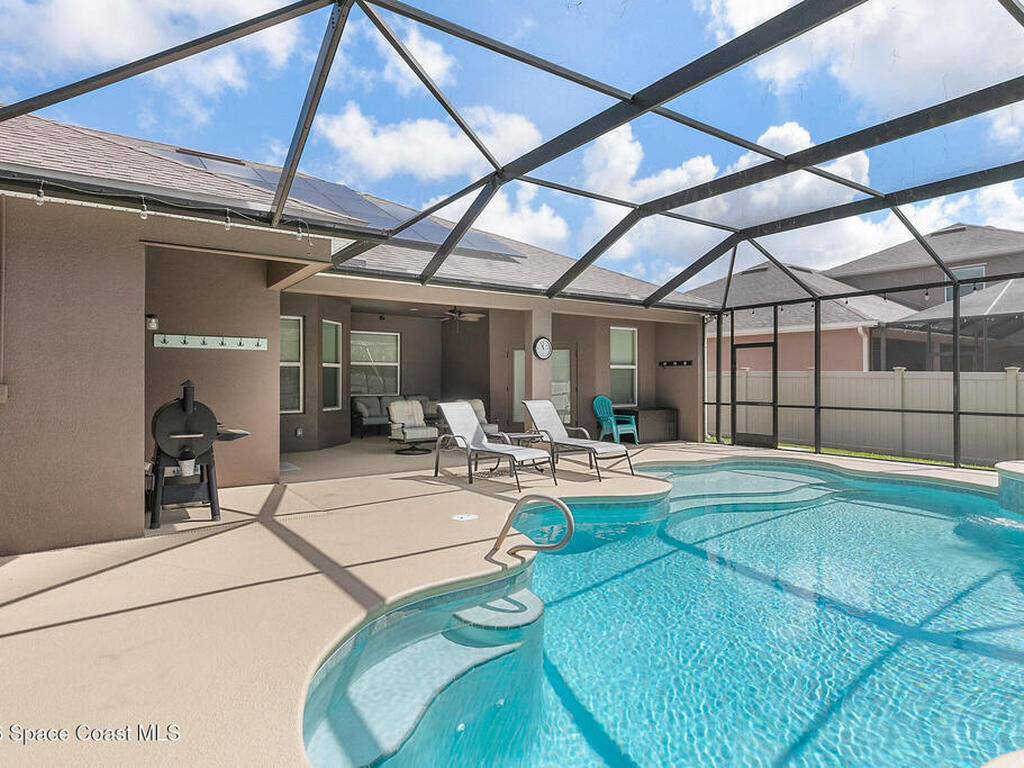 Like-new beautiful 4-bedroom, 3-bath home with a 3-car garage in the desirable Bayside Lakes Stonebriar community backing to a peaceful preserve. This spacious floor plan includes a sitting room and dedicated office, offering flexibility for work or relaxation. The kitchen opens to the main living area and all kitchen appliances remain. Interior features include crown moulding in the living areas, office, and primary bedroom, cordless blinds, ceiling fans, new carpet, fresh interior paint, and a smart thermostat. Enjoy outdoor living with a screened pool and spa with heat pump and a freshly painted pool patio. The property also features a paver driveway, vinyl fencing, fresh exterior paint, and new exterior door hardware. Additional upgrades include an 8-camera digital video system, electronic deadbolts, city water and sewer, and a dedicated sprinkler well and pump. Energy-efficient 12kW solar system with two Tesla batteries provides added efficiency and backup power.
