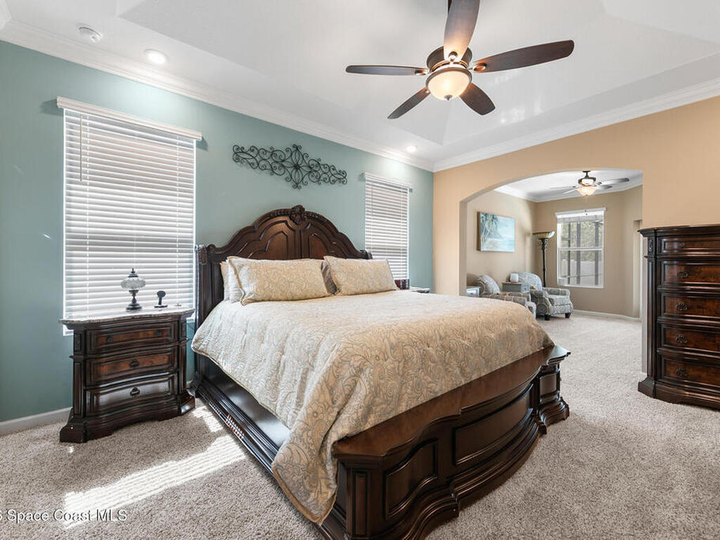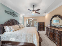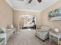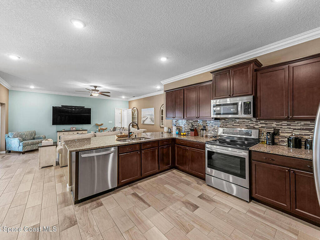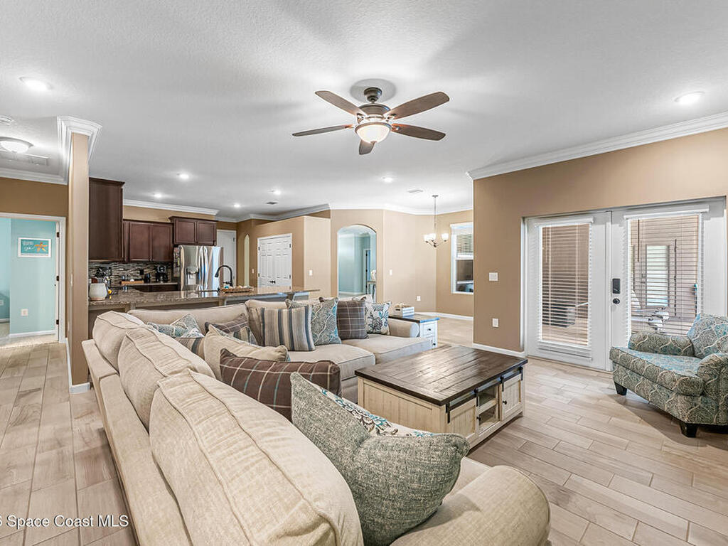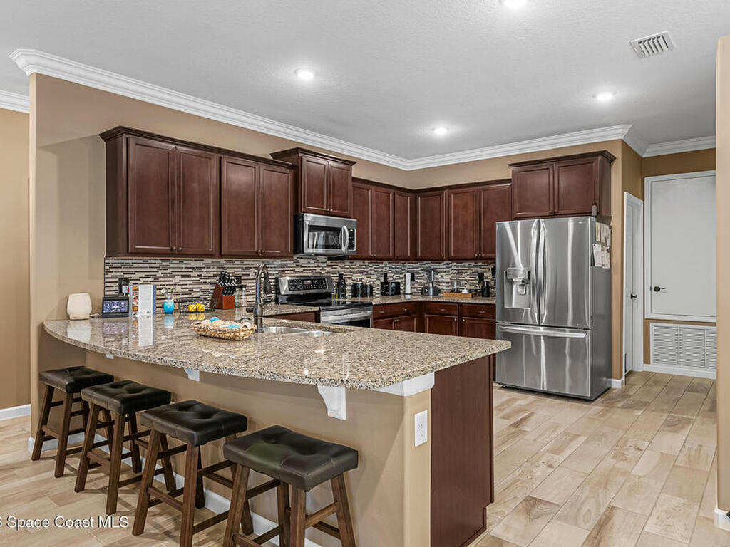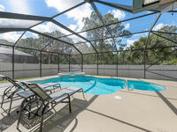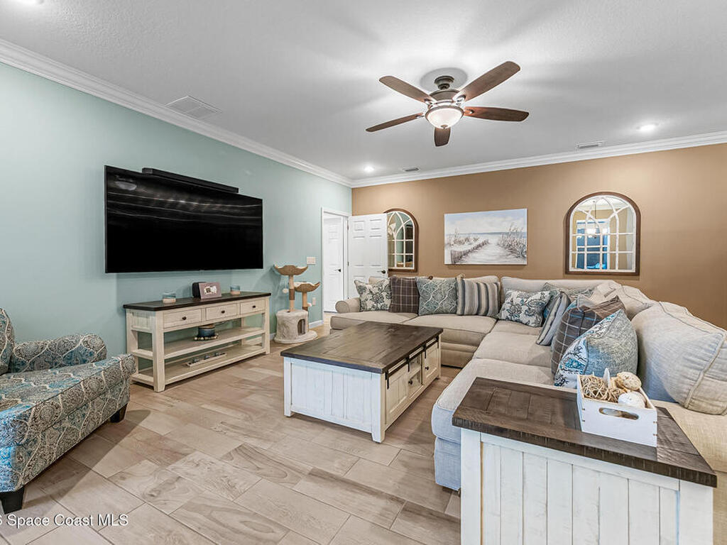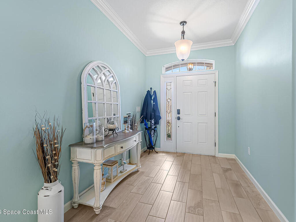 Like-new beautiful 4-bedroom, 3-bath home with a 3-car garage in the desirable Bayside Lakes Stonebriar community backing to a peaceful preserve. This spacious floor plan includes a sitting room and dedicated office, offering flexibility for work or relaxation. The kitchen opens to the main living area and all kitchen appliances remain. Interior features include crown moulding in the living areas, office, and primary bedroom, cordless blinds, ceiling fans, new carpet, fresh interior paint, and a smart thermostat. Enjoy outdoor living with a screened pool and spa with heat pump and a freshly painted pool patio. The property also features a paver driveway, vinyl fencing, fresh exterior paint, and new exterior door hardware. Additional upgrades include an 8-camera digital video system, electronic deadbolts, city water and sewer, and a dedicated sprinkler well and pump. Energy-efficient 12kW solar system with two Tesla batteries provides added efficiency and backup power.