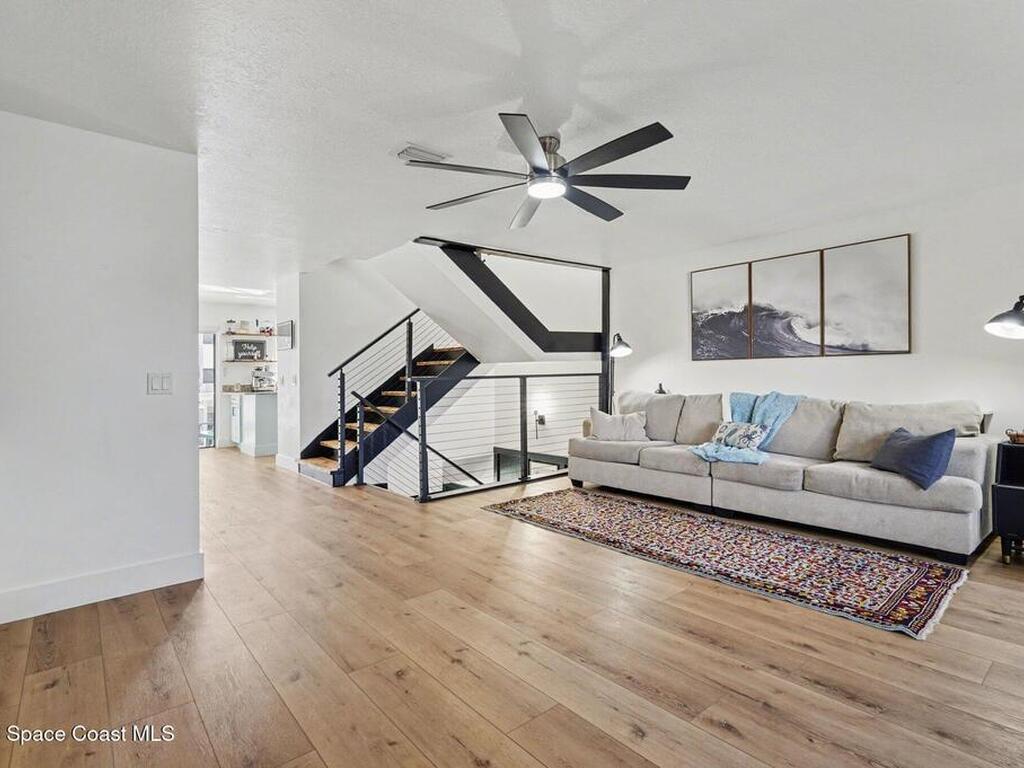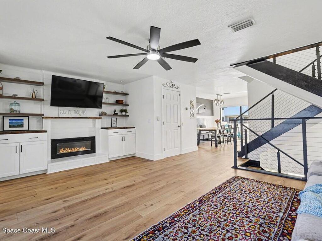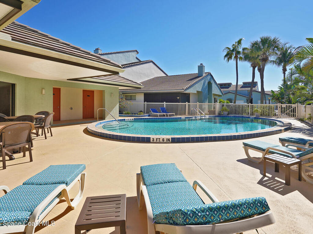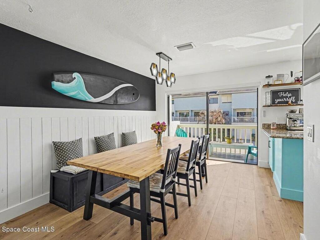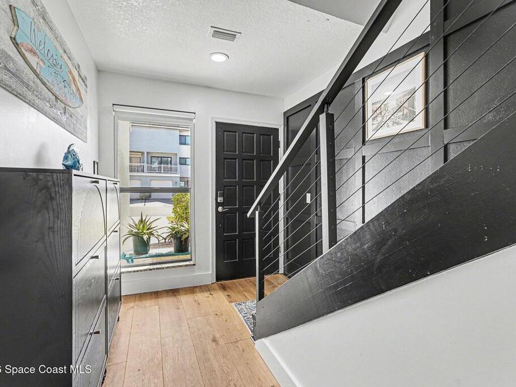 STEPS TO THE OCEAN and two quiet beach accesses. No beach parking headaches here. There are four outdoor spaces to relax and enjoy the sea breeze. This SMART townhome is beachside-industrial cool with unique custom features like the metal wire stair railings, board and batten touches, electric fireplace wall with built-ins, surfboard wave dining area, remote controlled shades and more. The 1st floor suite offers a floor to ceiling wall of closets, covered porch with hot tub and custom tiled shower. The 2nd floor living/dining/kitchen boasts front & back balconies plus a convenient half bathroom. SS appliances, granite, luxury vinyl plank flooring all add to the wow factor. There are 2 more full suites upstairs with walk-in closets and another private balcony. Enjoy a dip in the tropical community pool in this distinctive seaside community with unique architecture & tile roofs or head to the Indian River a few blocks away for more fun on the water. **VA assumable 4.625% mortgage**