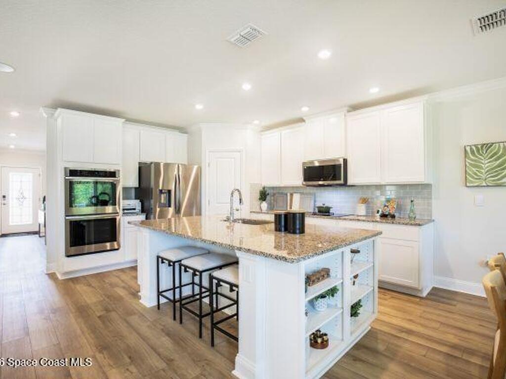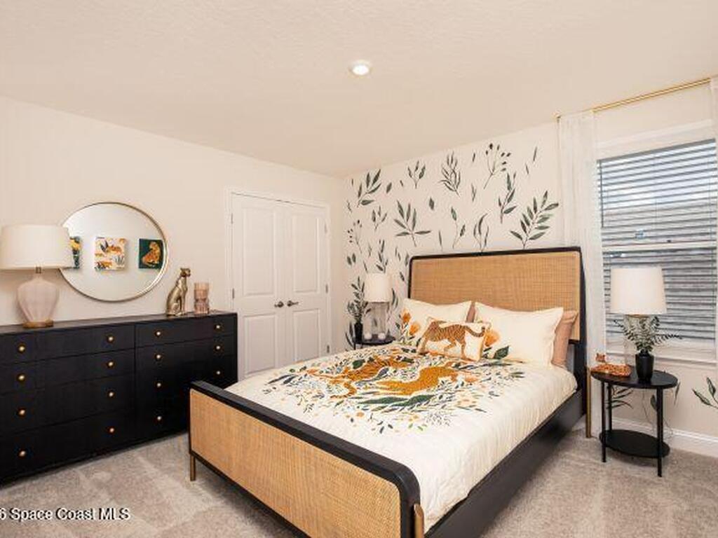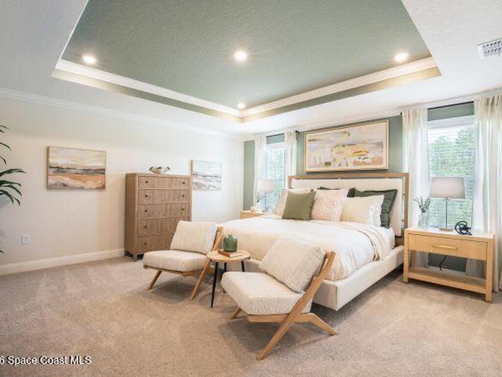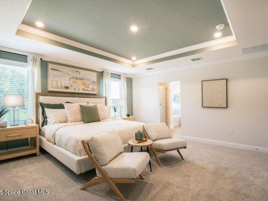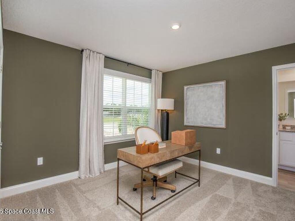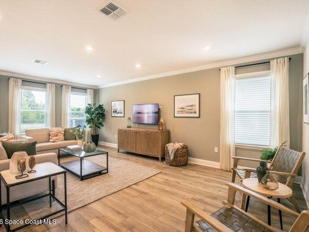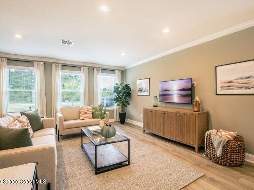 Pre-Construction. To Be Built. Welcome to The Carlisle, where space, style, water views, and modern functionality meet in the heart of Malabar Springs, Palm Bay's premier gated community. From the moment you arrive, the curb appeal draws you in with a stunning stone-accented exterior, elegant window shutters, and a professional paver driveway leading to a spacious 2-car garage with extra storage. Step through the covered front porch and into a thoughtfully designed interior featuring sleek ceramic tile flooring, upgraded door hardware, and brushed nickel accents throughout.The first floor is built for both productivity and relaxation, centered around a versatile den with double French glass doors that serves as the perfect home office. A convenient half bath with a pedestal sink is tucked away nearby, while the heart of the home features a spacious Great Room brightened by additional LED flush mount lighting. This open-concept space flows seamlessly into a chef-inspired kitchen
