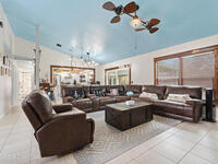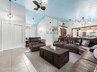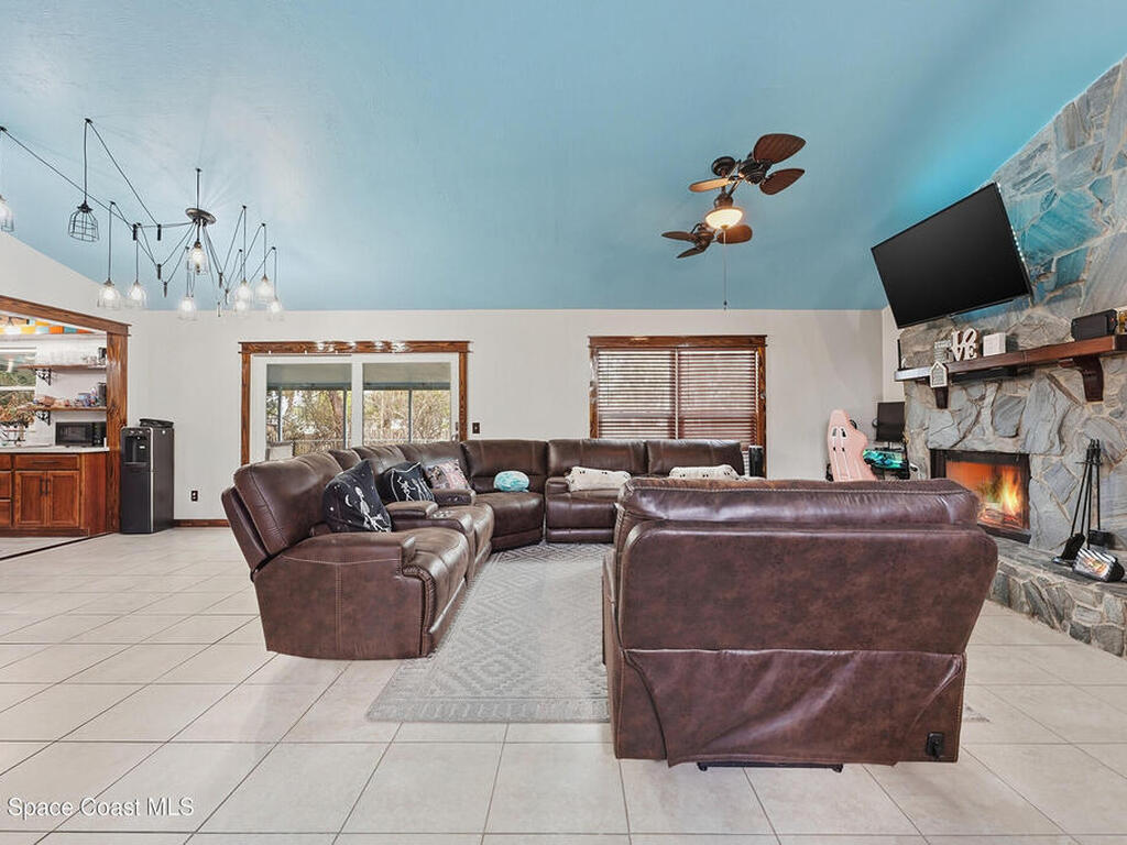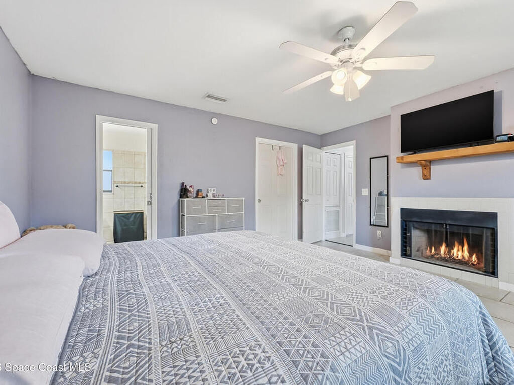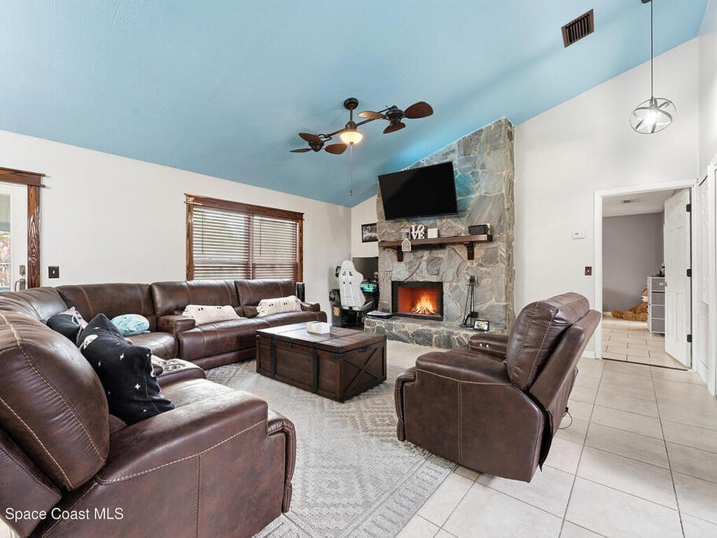 Bright and cheerful home full of unique charm and inviting character. The main living area features vaulted ceilings and a striking floor to ceiling stone wood burning fireplace, creating a cozy yet spacious feel. Recent updates include brand new kitchen appliances, a brand new water heater, and new carpet in the bedrooms. Sliding glass doors open to a screened patio overlooking a large backyard. The primary suite offers its own fireplace, walk in closet, and double vanity in the en suite bath. A charming home with thoughtful updates and plenty of personality.