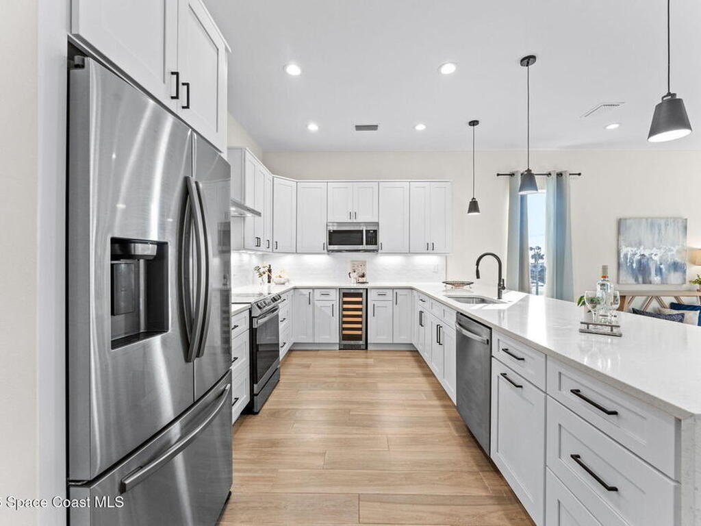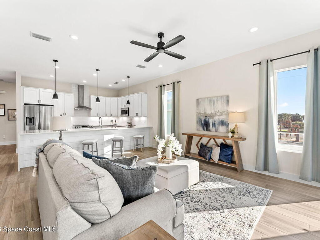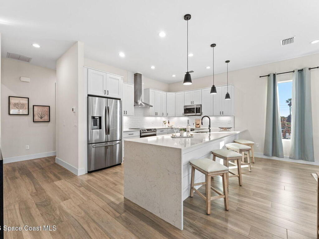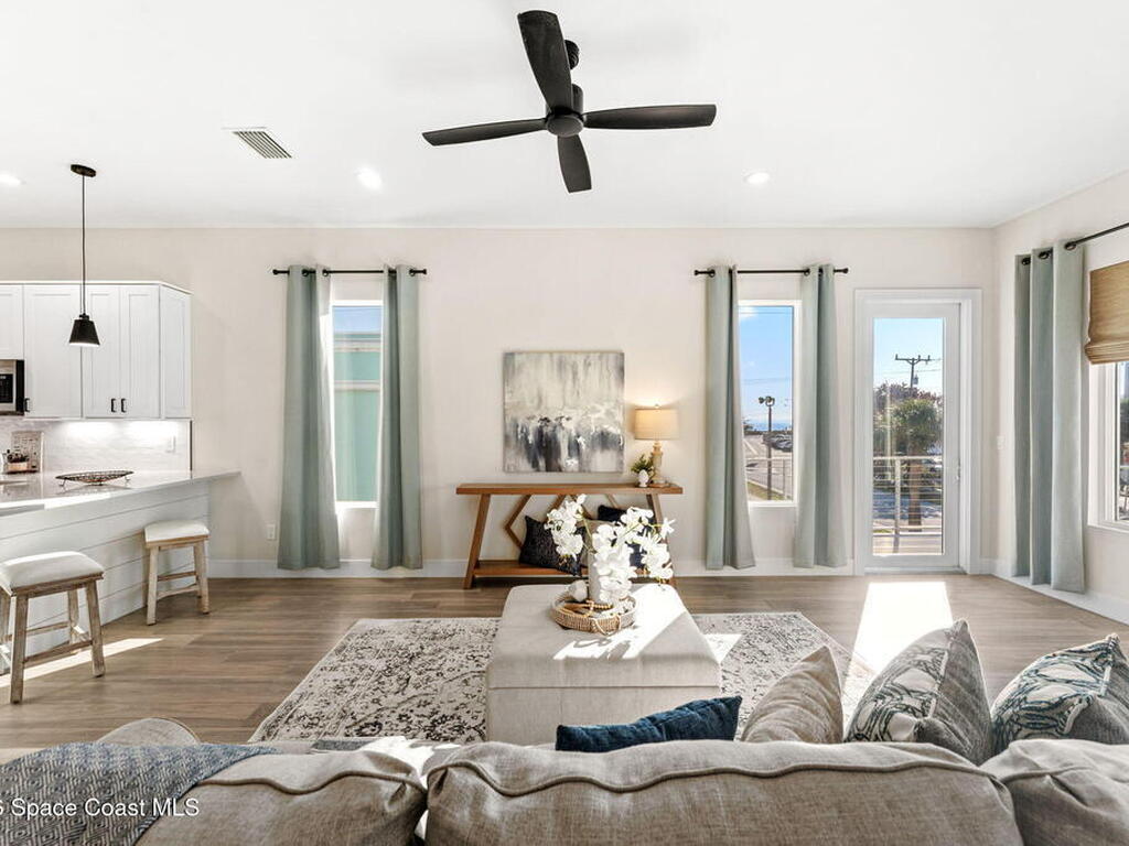 Wake up to ocean breezes and unwind with sunset views from your wraparound balcony in this beachside stunner just moments from the sand. This 3 bedroom, 2.5 bath home delivers an airy open floorplan with split bedrooms and sleek tile flowing throughout. The kitchen is designed to impress with crisp white quartz countertops, a bar refrigerator/wine cooler, and effortless flow for entertaining. Impact windows, a smart thermostat, and an upgraded smart garage bring peace of mind and modern convenience. Step outside to a private courtyard retreat featuring custom pavers and professionally installed artificial turf with bubble sprinklers for easy care and year-round beauty. Inside, custom luxury drapes and shades elevate every space. All just minutes from beach access, great dining, markets, and shopping. A rare blend of style, comfort, and location that truly stands out.