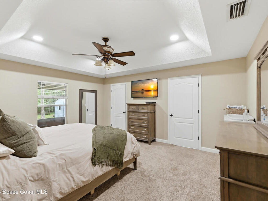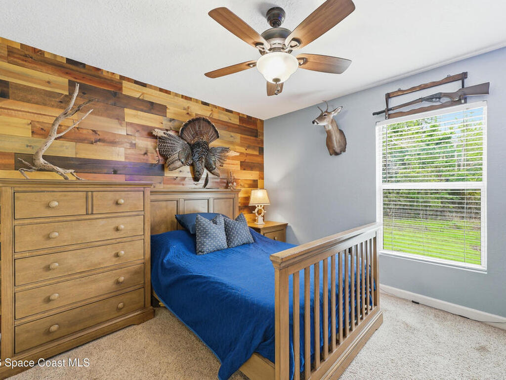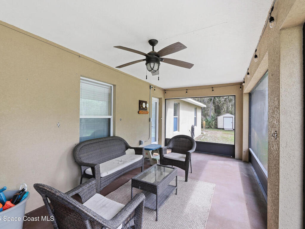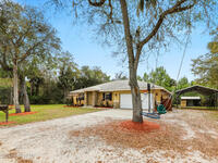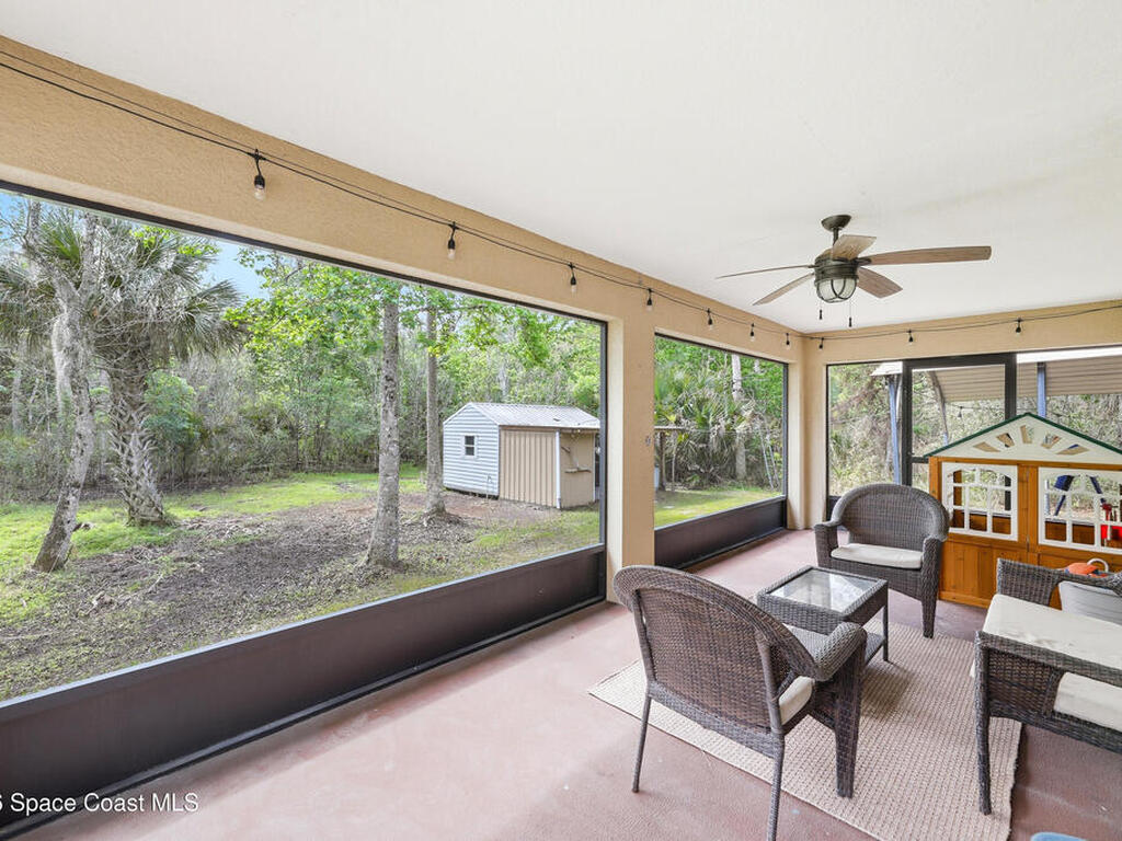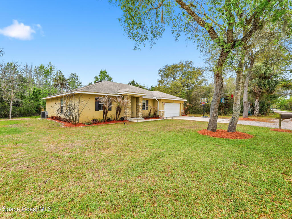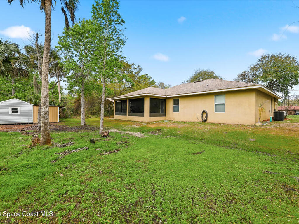 Private, peaceful, and packed with extras! This custom concrete block home offers an open and airy split floor plan with high ceilings, granite countertops, stainless steel appliances, rich wood cabinetry, and a spacious breakfast bar that opens to the main living area. The oversized primary suite is a true retreat with tray ceilings, a walk-in closet, a soaking tub, and a separate tiled shower. A flexible bonus room adds space for a home office, hobby room, or additional guest use. Step outside to enjoy the large screened porch, detached shed, covered outdoor entertaining/work area, and a massive metal carport with room for your boat, RV, or toys. Nestled among mature trees with plenty of privacy, this property delivers the space and lifestyle buyers are looking for. Easy access to Space X, Blue Origin, NASA, ULA, Waterways, Beaches, Shopping, Coast2Coast Bike Trail and less than 1 hour from the Orlando theme parks.
