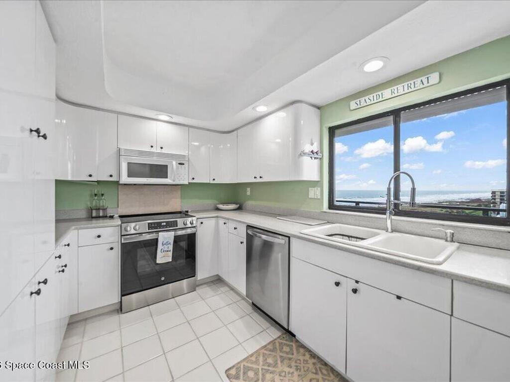 Incredible panoramic Ocean Views from this SE Corner 2 bedroom 2 bath Condo. Includes all new furnishings, and garage. Large wrap around private balcony to watch sunrises over the Ocean , sunsets over the river and Rocket Launches! Complex boast heated pool, private beach access, club house, tennis court and exercise room. Great location close to shopping and restaurants. Easy commute to Orlando Airport. Theme Parks, Kennedy Space Center, and Cape Canaveral Port ,