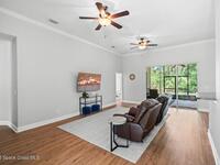 Welcome to this gorgeous 2, 200 sq ft home in SE Palm Bay, featuring 3 bedrooms, 2 bathrooms, and a versatile flex space. The spacious layout includes a formal living room, a formal dining area, and a family room with soaring 11-ft ceilings and elegant crown molding. The three bedrooms and den/flex space boast 9-ft ceilings, providing a bright and open atmosphere. The well-equipped kitchen offers 42-inch upper cabinets, a breakfast bar, new stainless-steel appliances, a pantry, and a cozy breakfast nook overlooking the tranquil backyard. The family room opens through a triple sliding door to a large, screened porch-perfect for enjoying the sights of cardinals, blue jays & painted buntings that visit the yard. The owner's suite features a walk-in closet, double sink vanity, soaking tub, walk-in shower, and a separate toilet room. With durable tile and Lifeproof LVP flooring throughout for easy maintenance, this home truly has it all! Updates include Roof, Shutters, LVP 2022; A/C 2018.