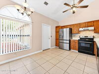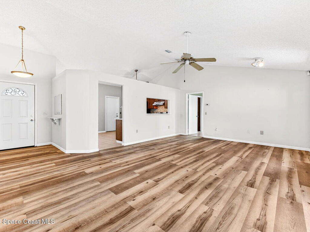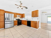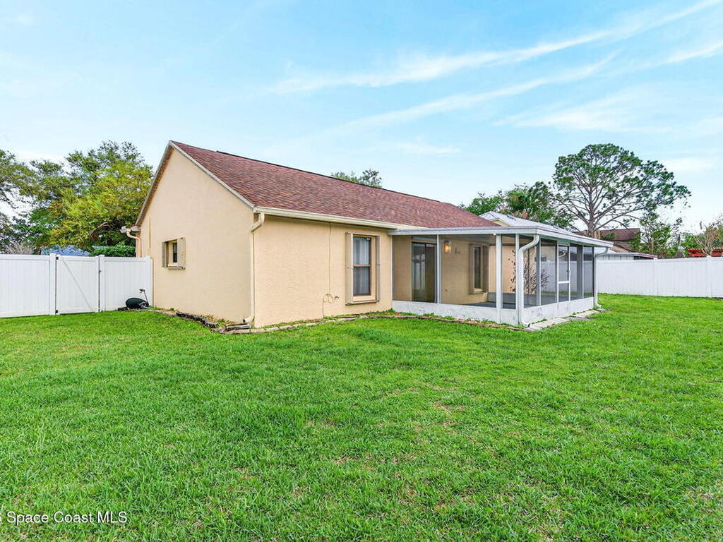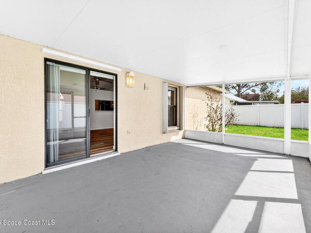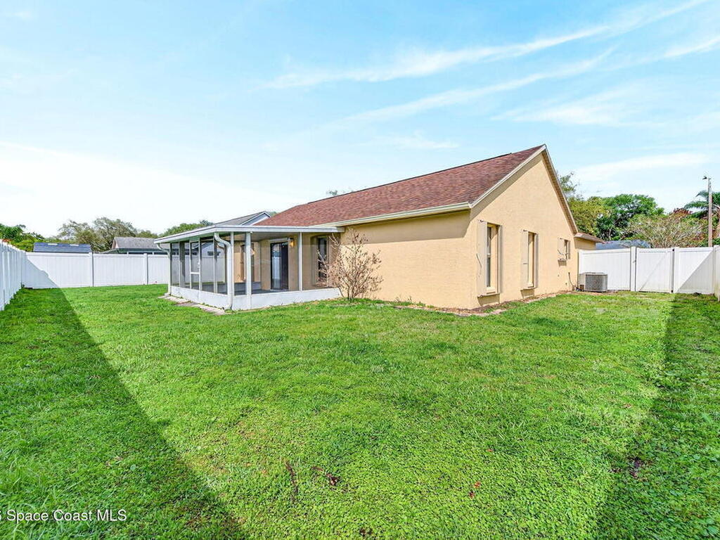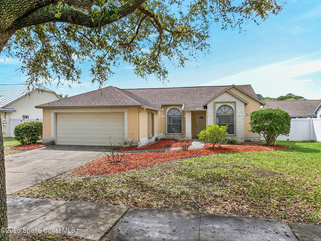 Perfect starter home-NO HOA located in the quiet Cocoa Pines community, this well-maintained 3 bedroom, 2 bath concrete block home offers a desirable split floor plan and a 2-car garage. Conveniently situated with easy access to I-95, Orlando International Airport, Kennedy Space Center, beaches, schools, shopping, and restaurants. Inside, the home features vinyl, tile, laminate flooring throughout along with ceiling fans for added comfort. The eat-in kitchen features newer appliances, updated countertops, and a matching island for added prep and gathering space. The combined living and dining area boasts vaulted ceilings, creating an open and inviting space perfect for entertaining. Sliders lead to a screened porch overlooking the private backyard framed by a white vinyl privacy fence. Additional highlights include a sprinkler system in the front and rear yard and accordion hurricane shutters for added protection and peace of mind. This home is ready for a new family.