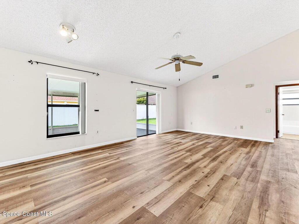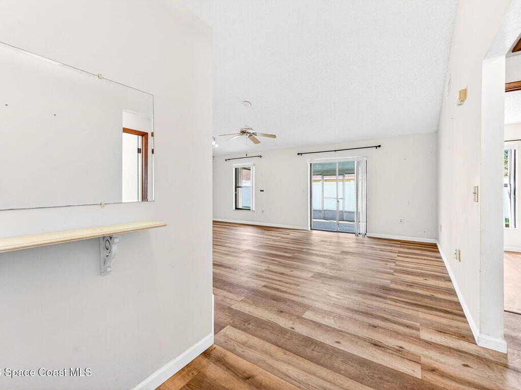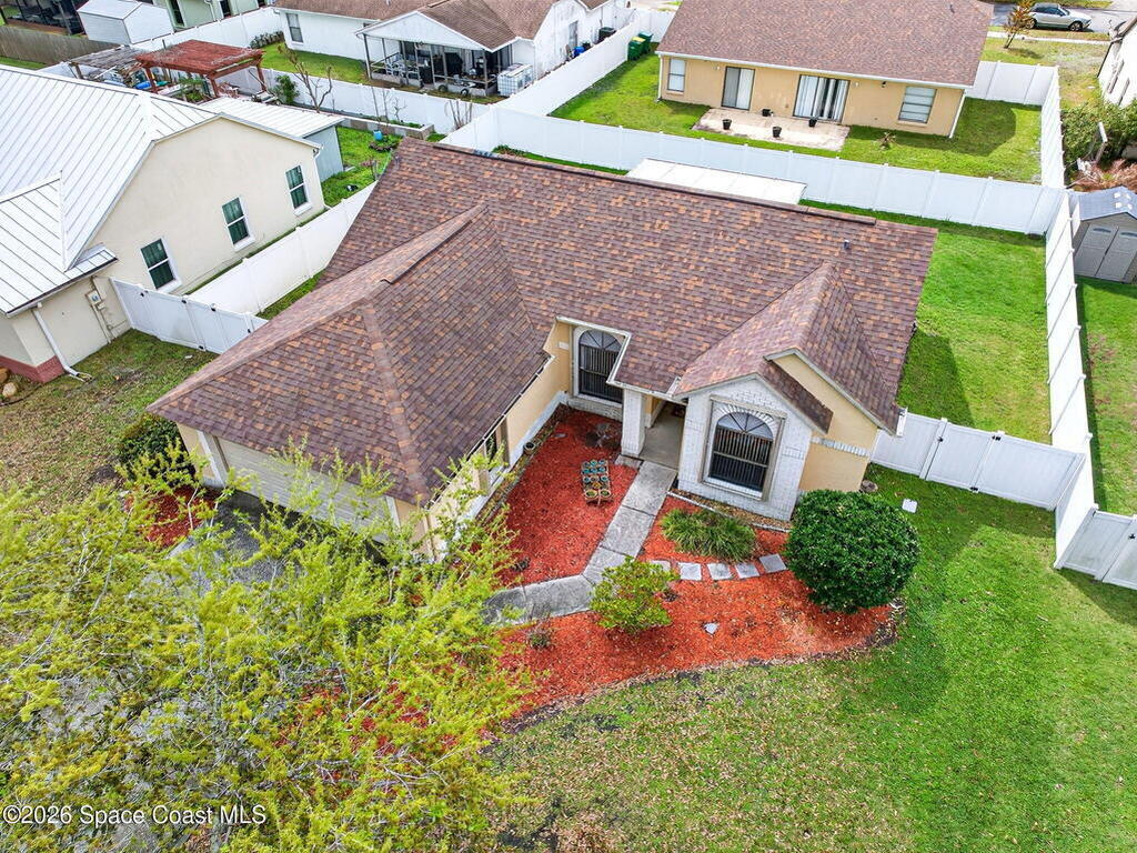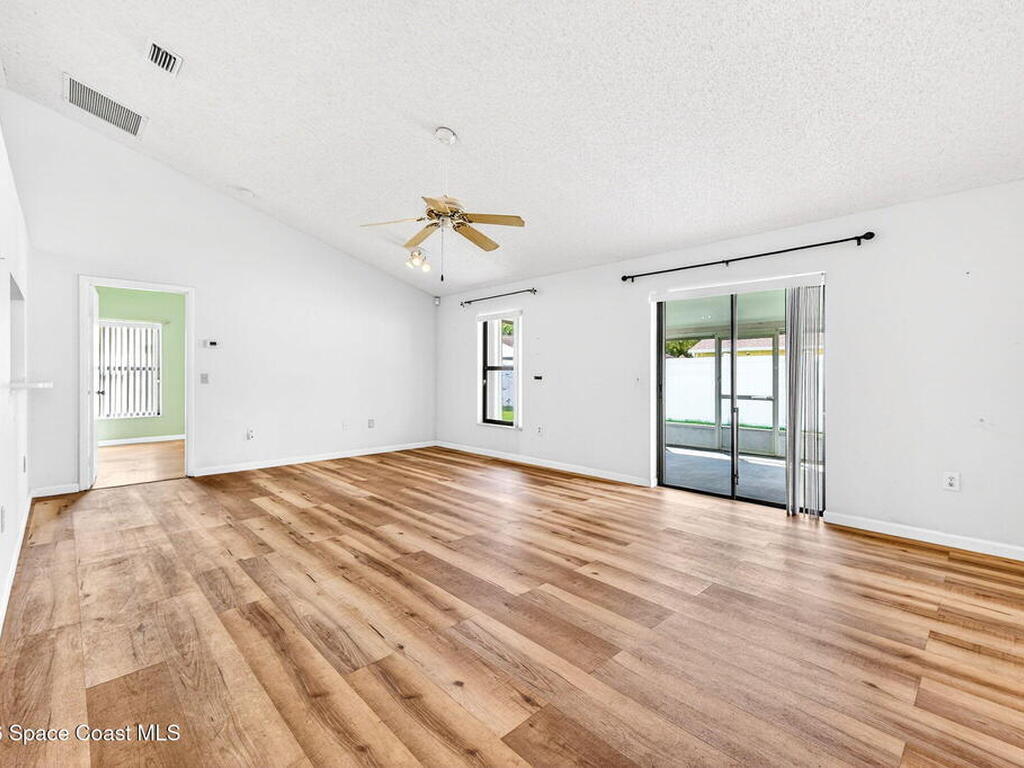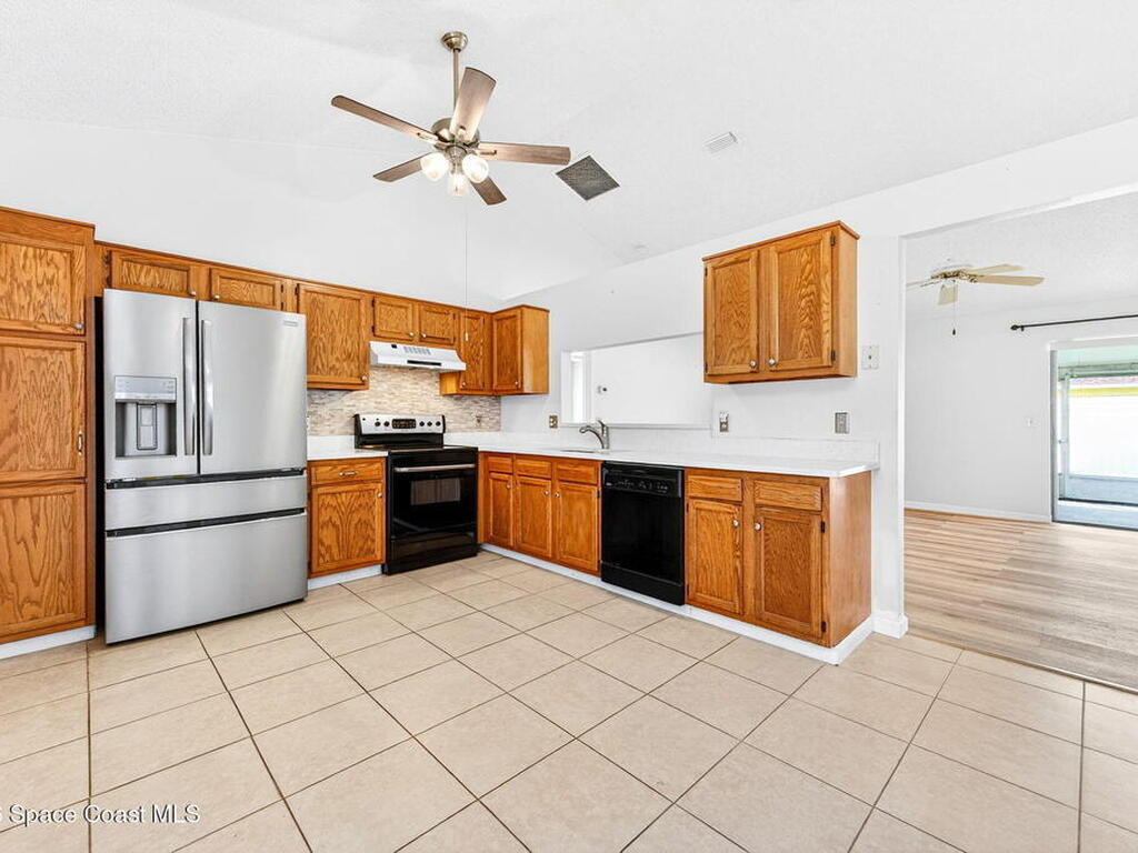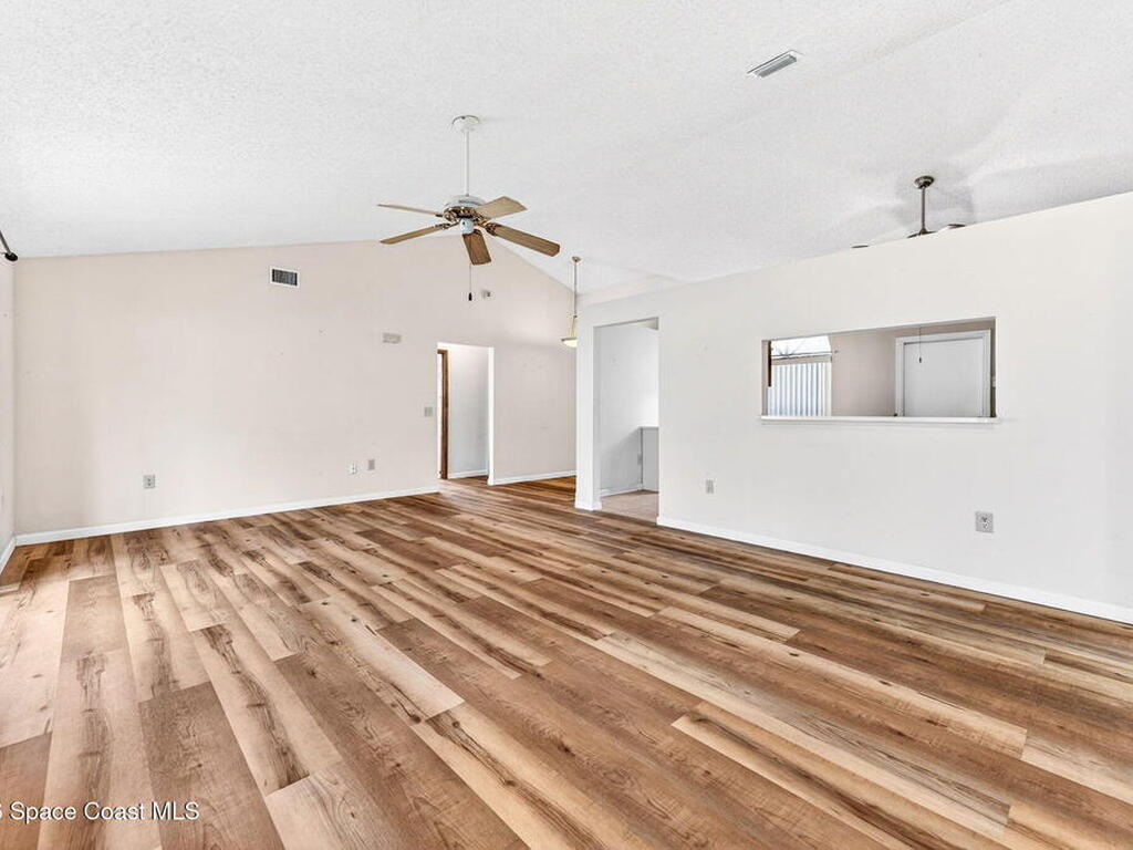 Perfect starter home-NO HOA located in the quiet Cocoa Pines community, this well-maintained 3 bedroom, 2 bath concrete block home offers a desirable split floor plan and a 2-car garage. Conveniently situated with easy access to I-95, Orlando International Airport, Kennedy Space Center, beaches, schools, shopping, and restaurants. Inside, the home features vinyl, tile, laminate flooring throughout along with ceiling fans for added comfort. The eat-in kitchen features newer appliances, updated countertops, and a matching island for added prep and gathering space. The combined living and dining area boasts vaulted ceilings, creating an open and inviting space perfect for entertaining. Sliders lead to a screened porch overlooking the private backyard framed by a white vinyl privacy fence. Additional highlights include a sprinkler system in the front and rear yard and accordion hurricane shutters for added protection and peace of mind. This home is ready for a new family.
