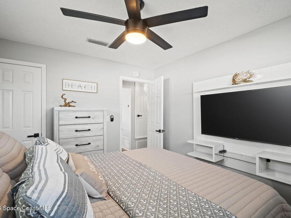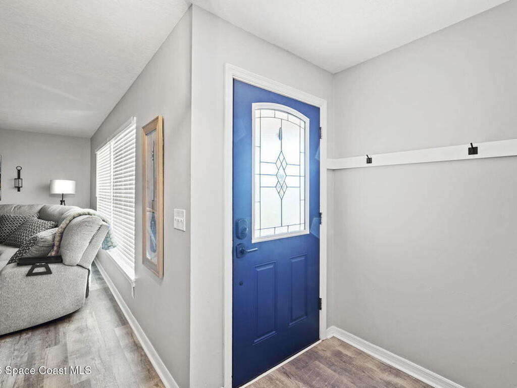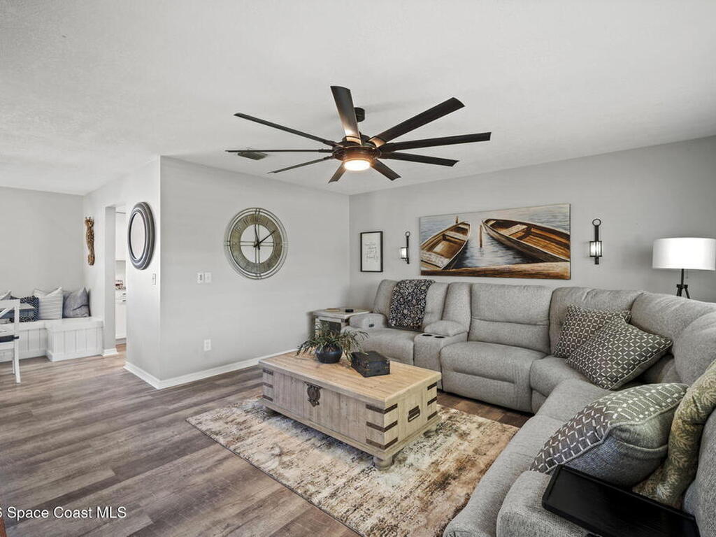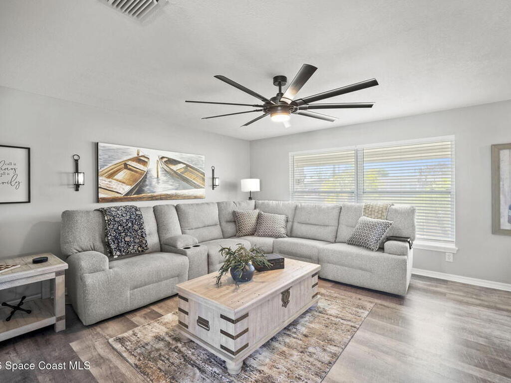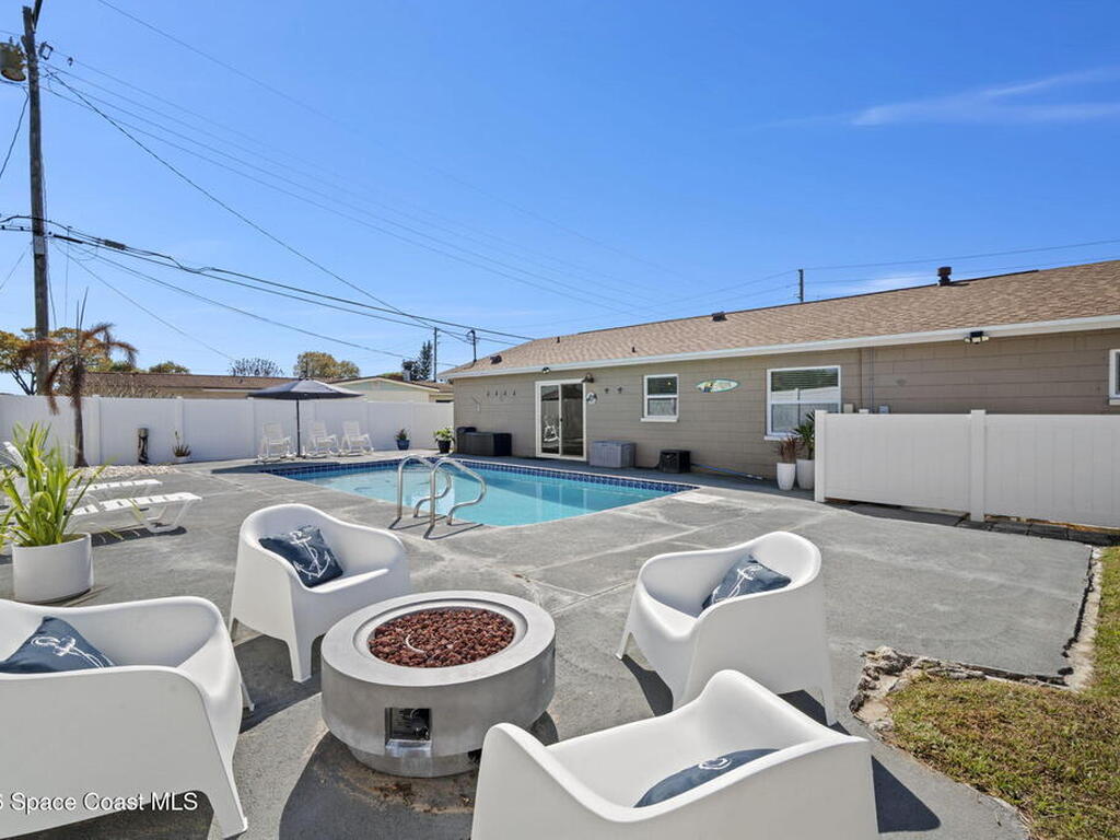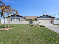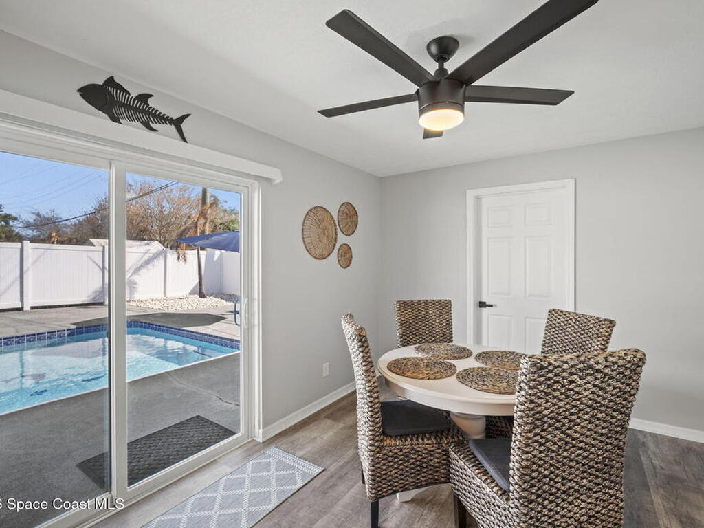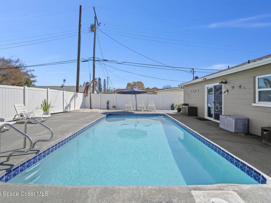 Beautifully updated pool home in Catalina Isles, centrally located in Merritt Island, and move in ready. With a completely refreshed interior this home offers an updated kitchen with white cabinetry, quartz countertops, newer appliances, luxury vinyl plank flooring throughout the entire home, new baseboards, refinished ceilings with no popcorn, fresh interior paint, new lighting and ceiling fans, refreshed bathrooms with new vanities, and a cozy living room with electric fireplace on a ship lap accent wall. Other amazing features include impact windows and sliding glass door, 2021 electrical with 200 amp panel, 2025 Roof, 2023 water heater, 2021 white PVC fence, and 2013 AC with newer compressor.