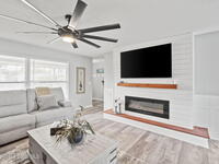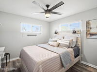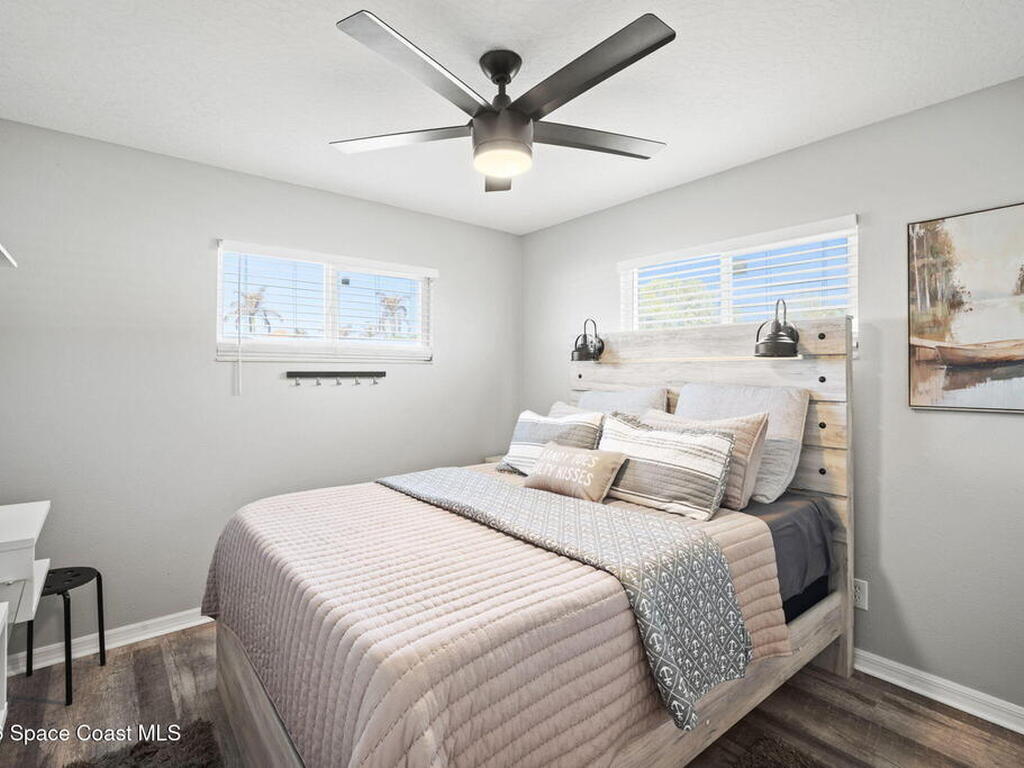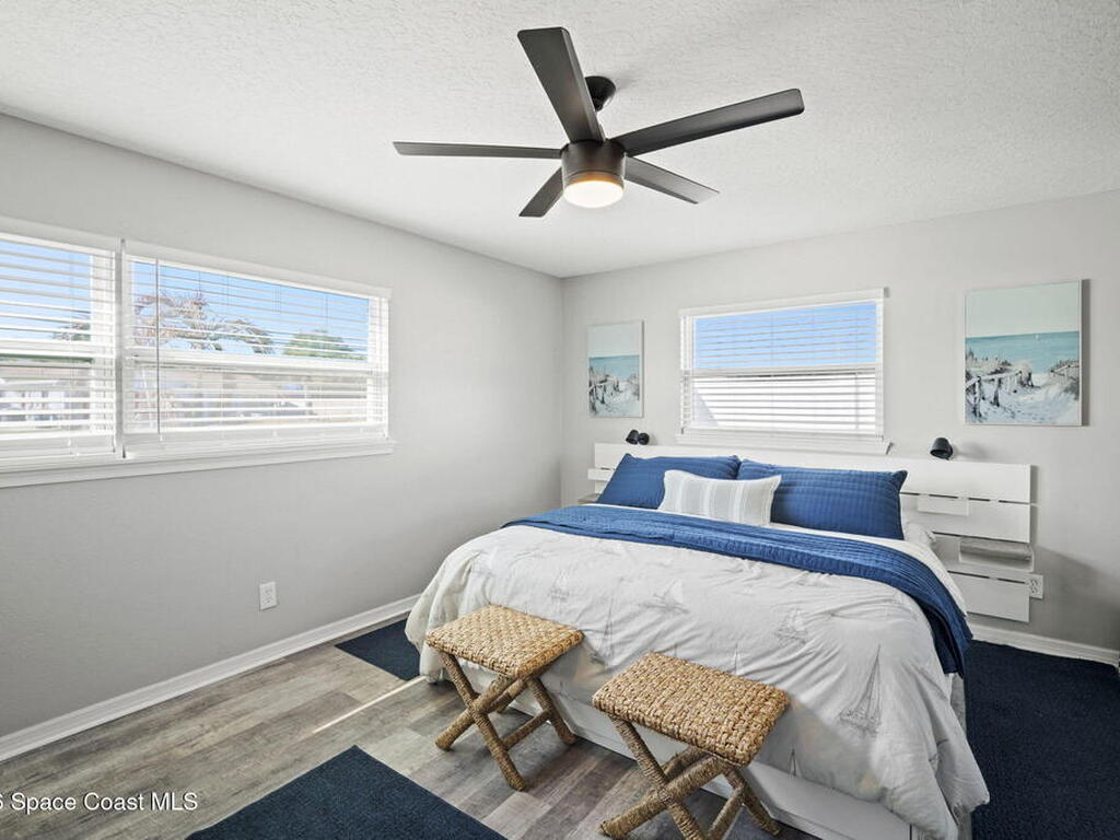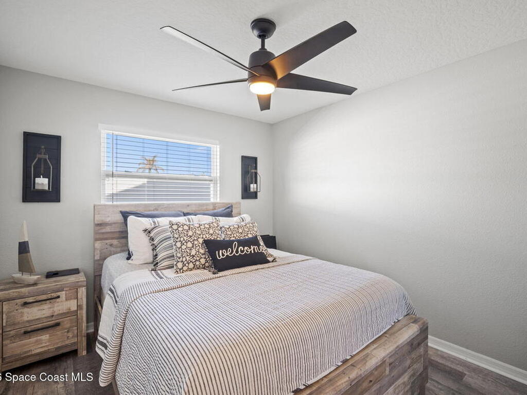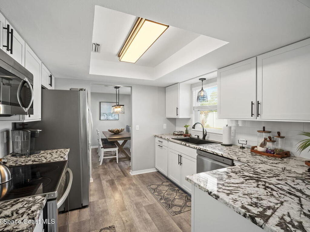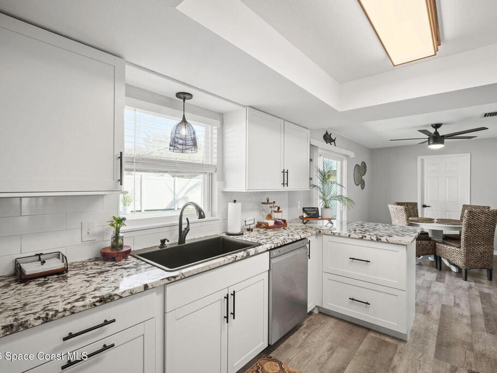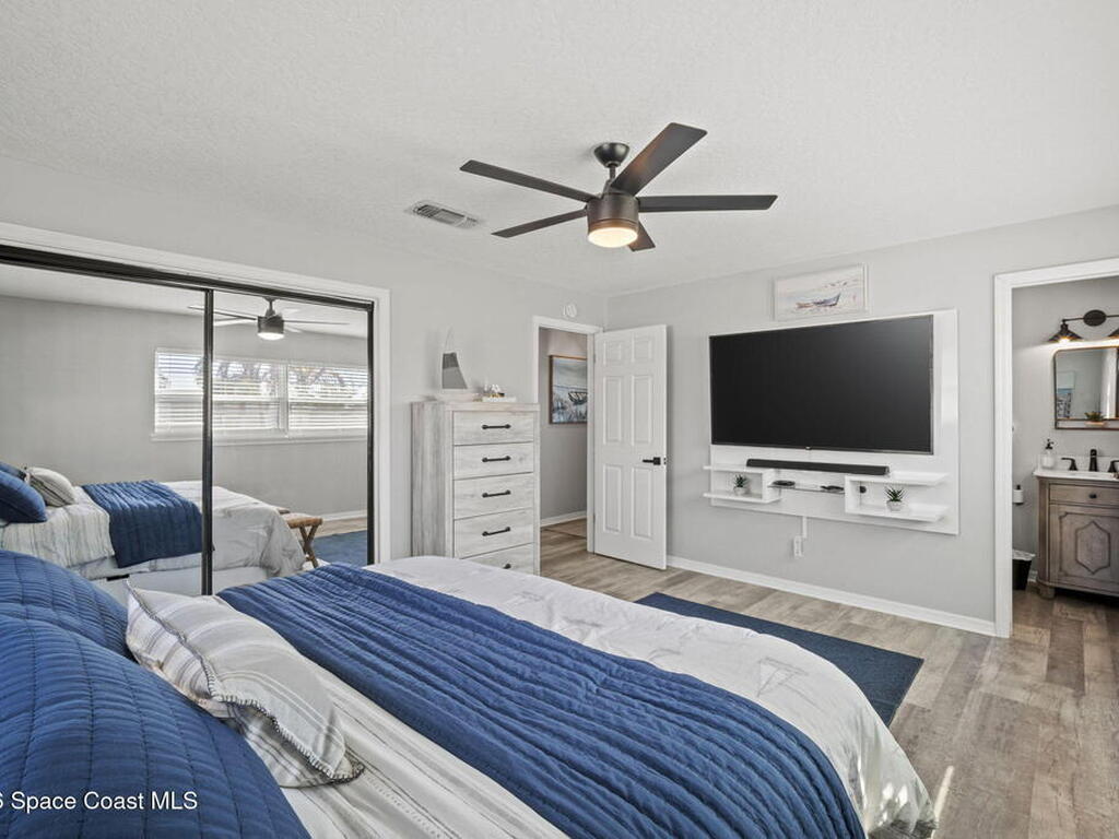 Beautifully updated pool home in Catalina Isles, centrally located in Merritt Island, and move in ready. With a completely refreshed interior this home offers an updated kitchen with white cabinetry, quartz countertops, newer appliances, luxury vinyl plank flooring throughout the entire home, new baseboards, refinished ceilings with no popcorn, fresh interior paint, new lighting and ceiling fans, refreshed bathrooms with new vanities, and a cozy living room with electric fireplace on a ship lap accent wall. Other amazing features include impact windows and sliding glass door, 2021 electrical with 200 amp panel, 2025 Roof, 2023 water heater, 2021 white PVC fence, and 2013 AC with newer compressor.