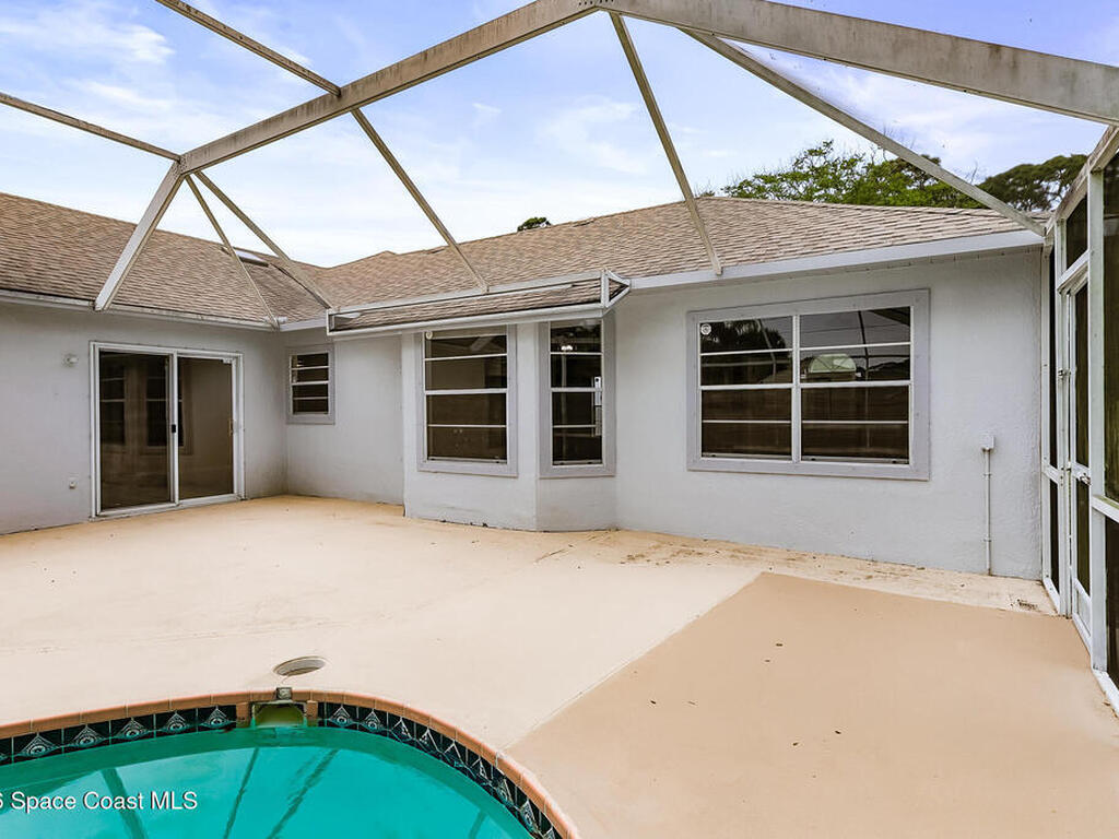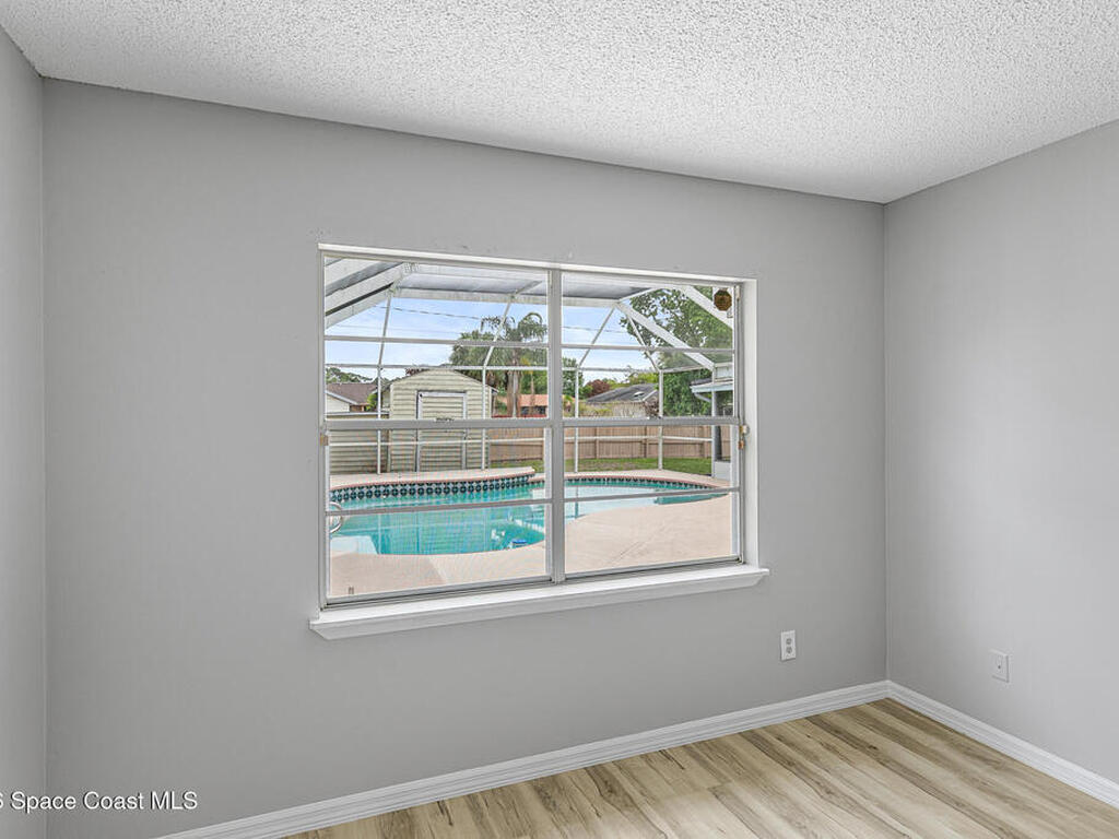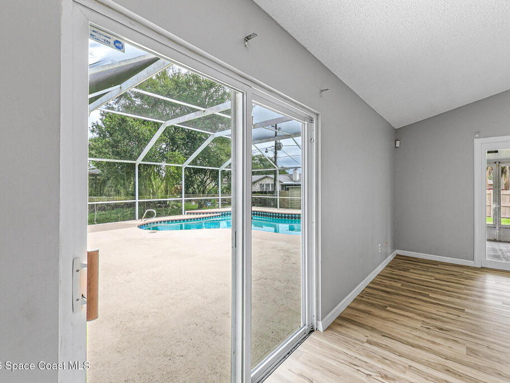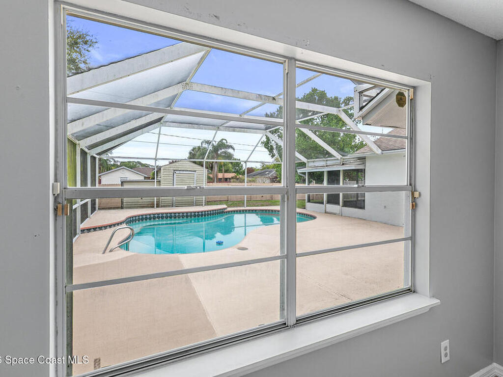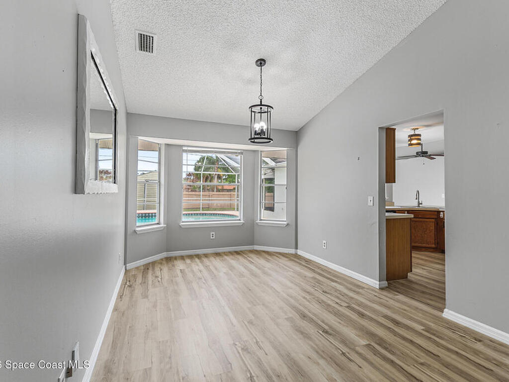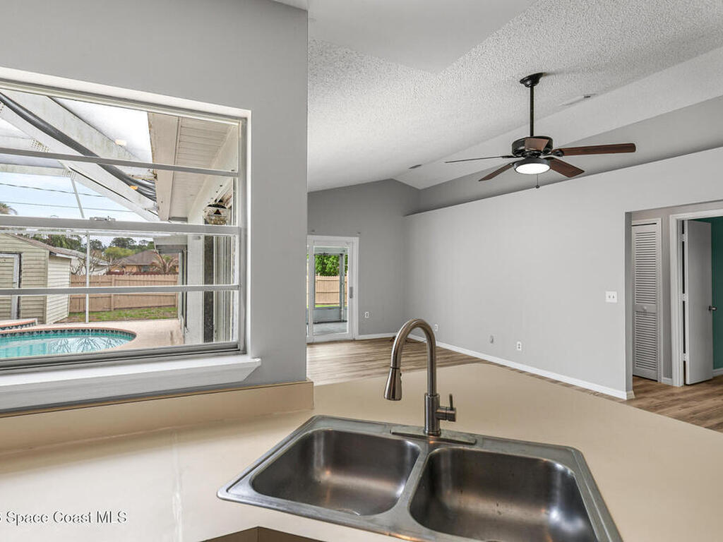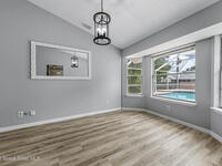 New to the market -- this freshly updated Palm Bay pool home is one of the best values currently available! The seller is offering a $5, 000 closing cost credit to the buyer with an accepted contract closing within 30 days.This spacious 3-bedroom, 2-bath home with a versatile bonus room offers incredible flexibility along with two separate living areas, giving you plenty of room for entertaining, relaxing, working from home, or creating a playroom or guest space.Step inside to a bright and airy open layout featuring vaulted ceilings and luxury vinyl plank flooring throughout. The main living space flows seamlessly into the dining area, where beautiful bay windows overlook the sparkling blue pool, bringing in natural light and creating the perfect backdrop for everyday living.The kitchen sits at the heart of the home, complete with a breakfast bar and plenty of room to gather with family and friends. Several rooms throughout the home enjoy peaceful views of the pool, adding to the