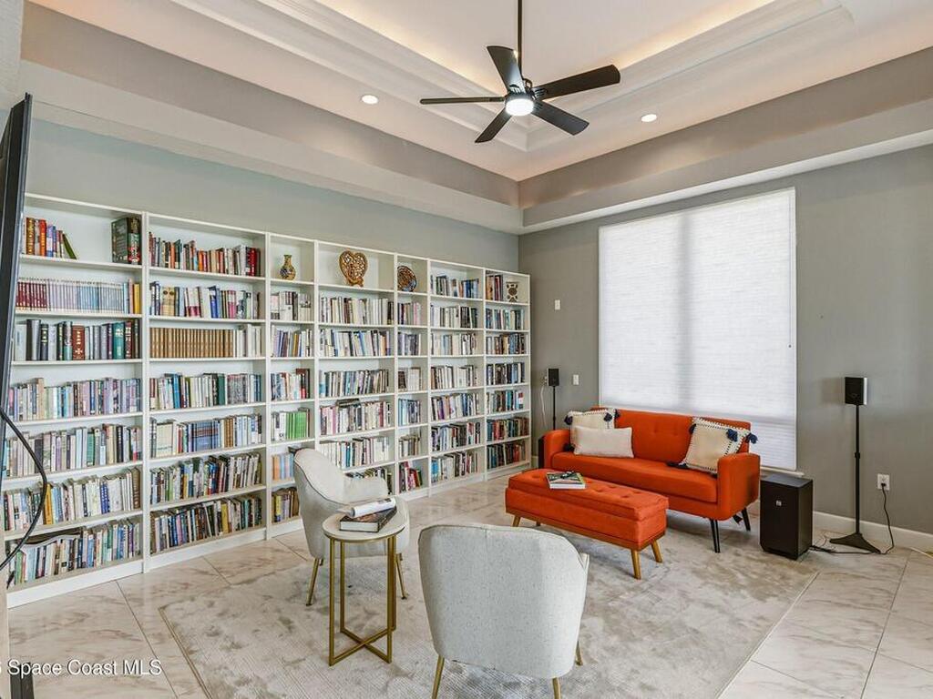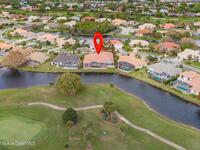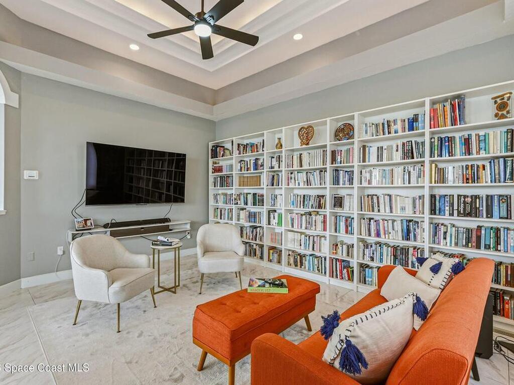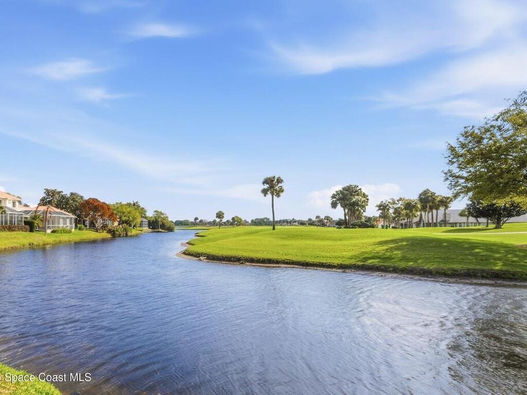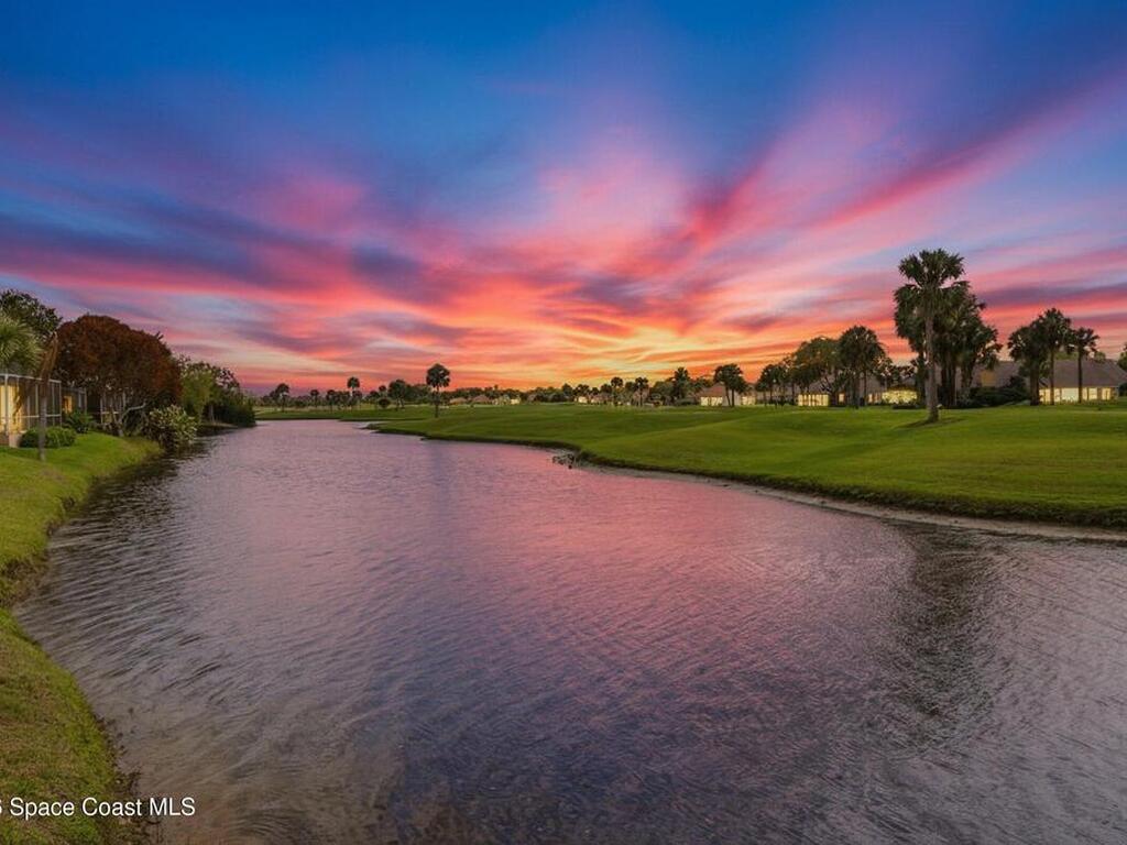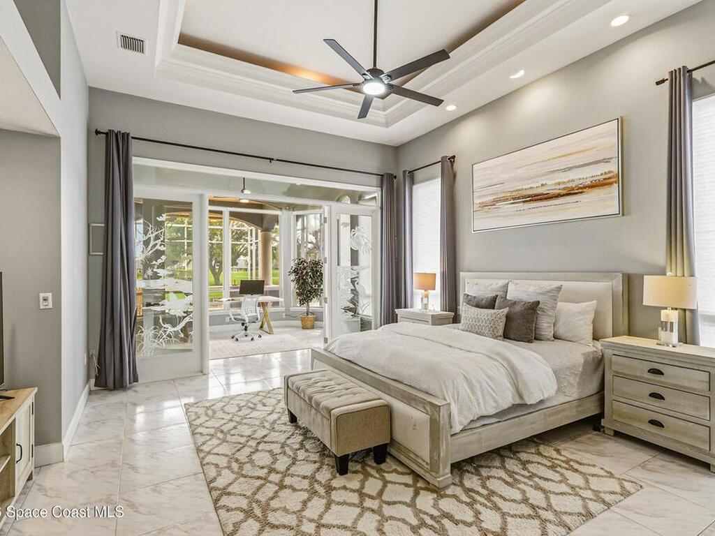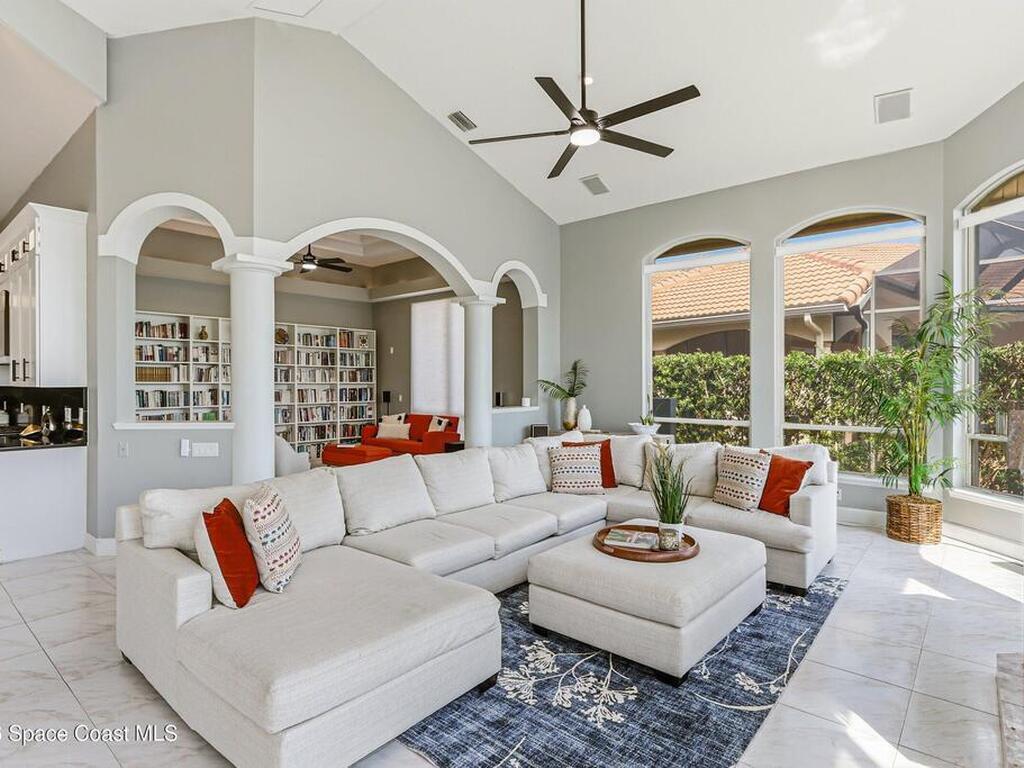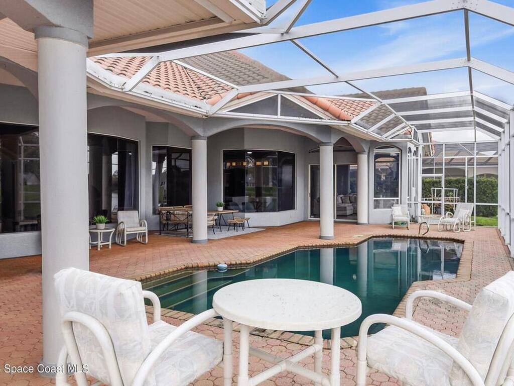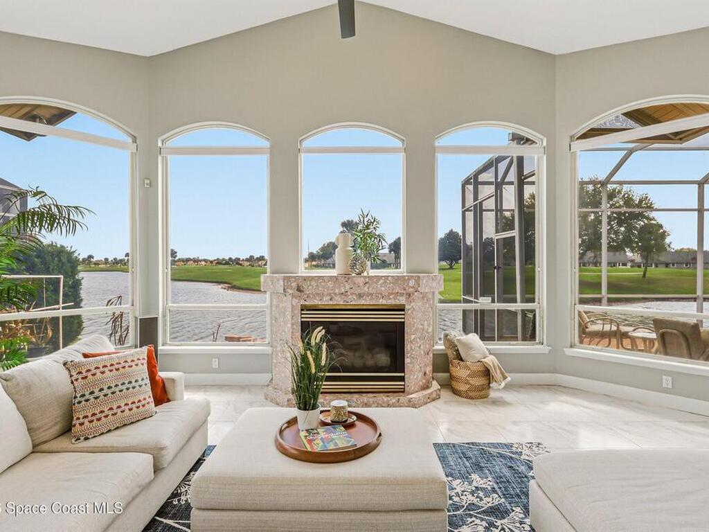 Discover an extraordinary lakefront estate in the Legends at Suntree. Offering 4, 449sq ft of refined living space with sweeping golf course and lake views, this impressive 5 bedroom 3.5 bath residence blends grand scale with elegant design. Beginning with a dramatic 16' foyer and soaring 12-14' ceilings throughout accented by tray ceilings in the primary suite, living, family and dining rooms this home is designed for both sophisticated entertaining and everyday comfort. The home features a private library, media room and open living flow that captures stunning water and fairway vistas. The chef kitchen is beautifully appointed with quartz countertops a striking waterfall island and GE Cafe appliances. The luxurious primary suite offers a slipper tub, oversized walk-in shower and expansive his and hers closets. Outdoors a resort style pool and screened lanai overlook the tranquil lake and golf course scenery, completing this exceptional three-car garage estate.