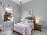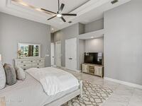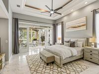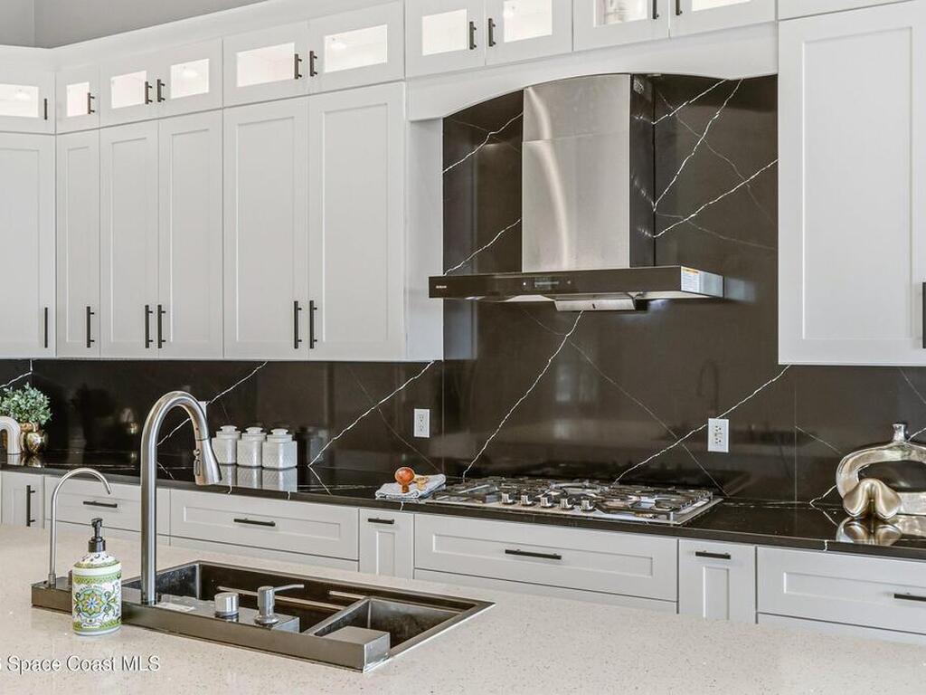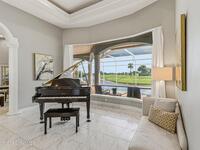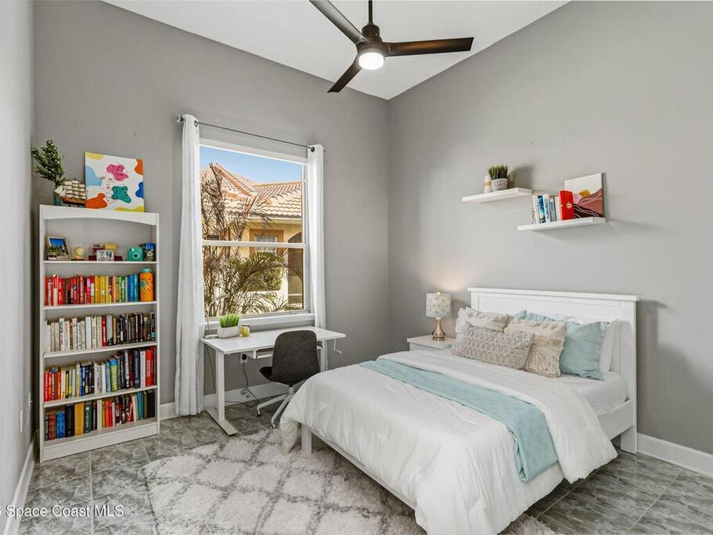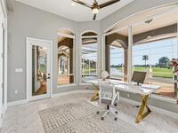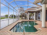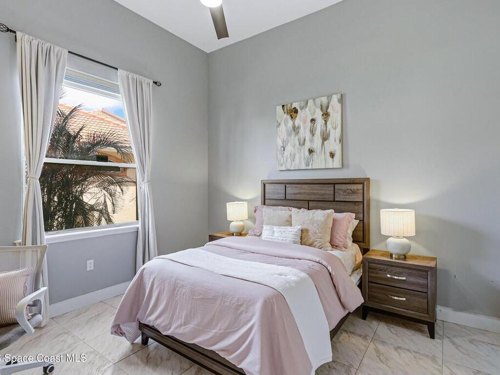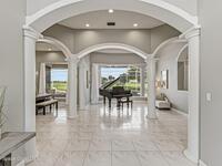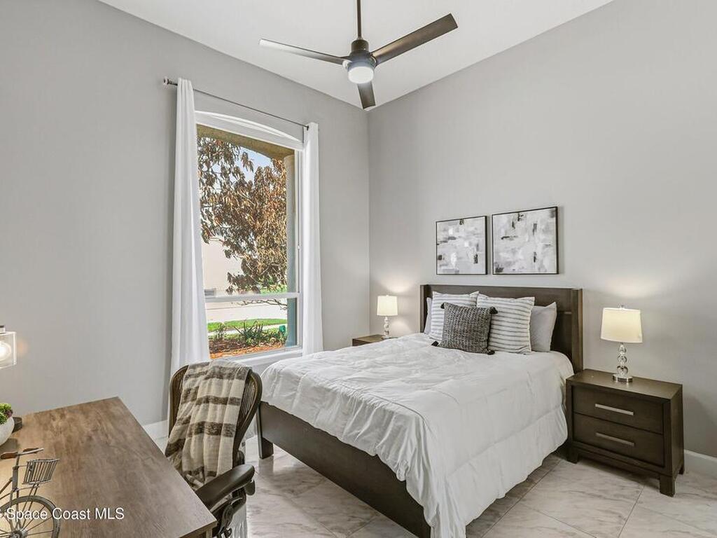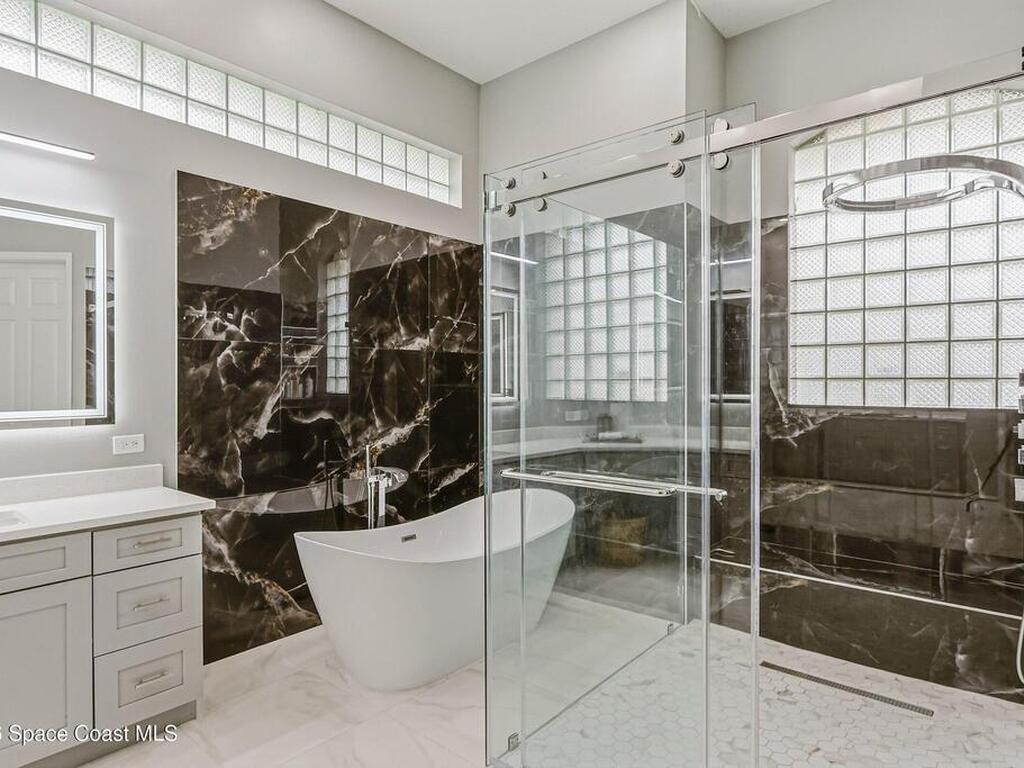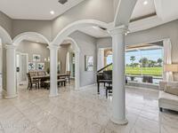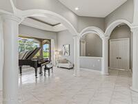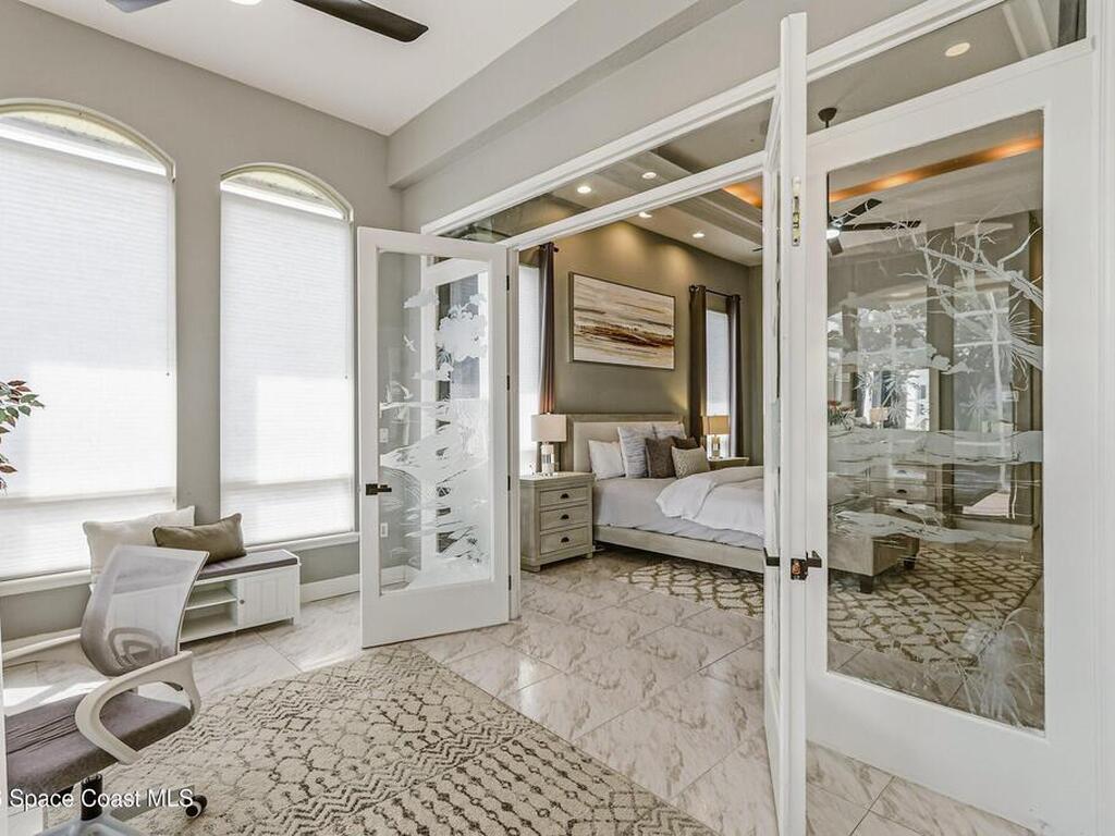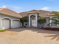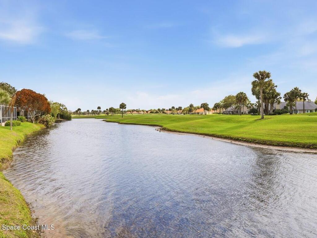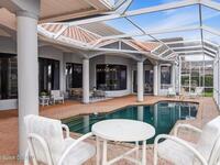 Discover an extraordinary lakefront estate in the Legends at Suntree. Offering 4, 449sq ft of refined living space with sweeping golf course and lake views, this impressive 5 bedroom 3.5 bath residence blends grand scale with elegant design. Beginning with a dramatic 16' foyer and soaring 12-14' ceilings throughout accented by tray ceilings in the primary suite, living, family and dining rooms this home is designed for both sophisticated entertaining and everyday comfort. The home features a private library, media room and open living flow that captures stunning water and fairway vistas. The chef kitchen is beautifully appointed with quartz countertops a striking waterfall island and GE Cafe appliances. The luxurious primary suite offers a slipper tub, oversized walk-in shower and expansive his and hers closets. Outdoors a resort style pool and screened lanai overlook the tranquil lake and golf course scenery, completing this exceptional three-car garage estate.