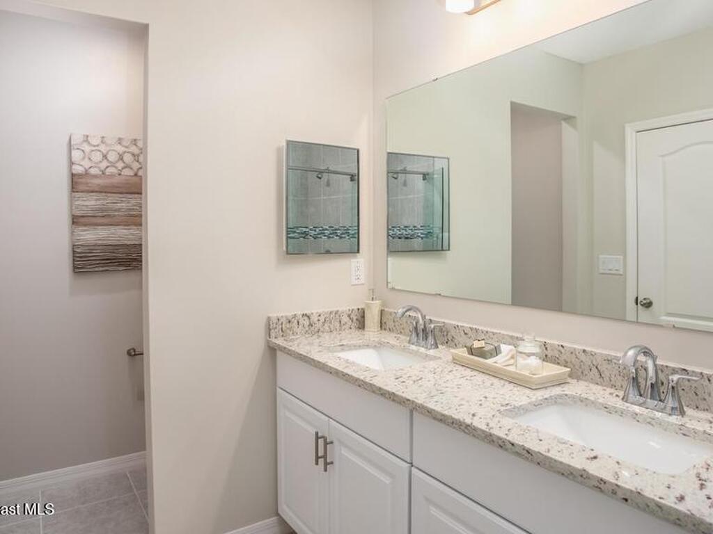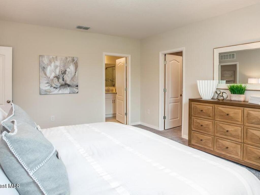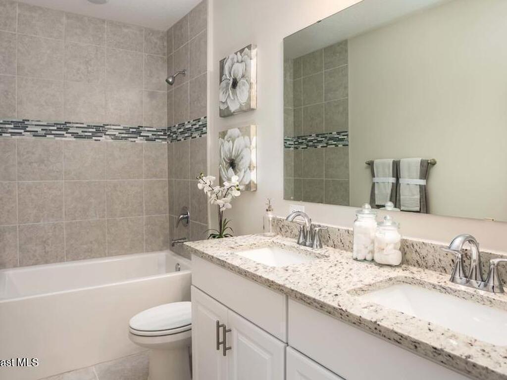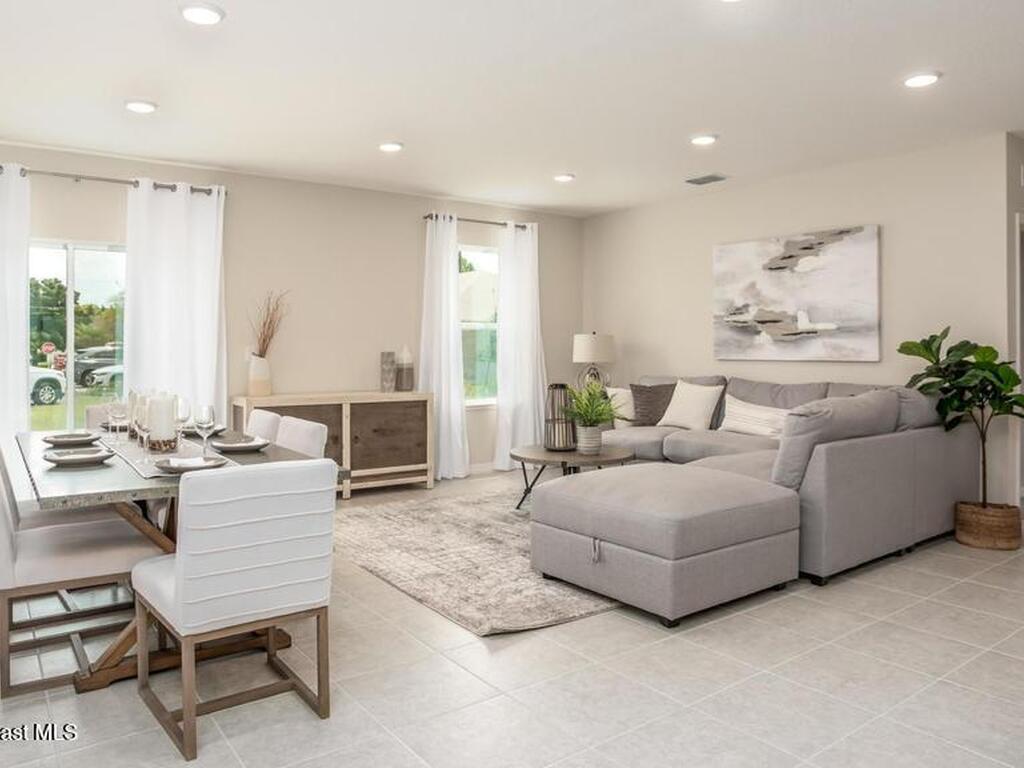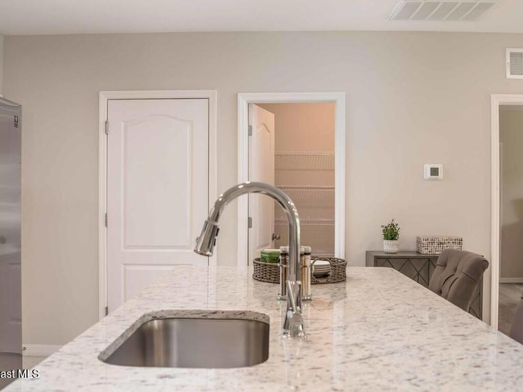 Move-in READY! Experience The Willow in Palm Bay, where smart design and modern style converge in a thoughtfully crafted split-bedroom layout. With over 2, 000 square feet of living space, this home provides a seamless balance of elegance and efficiency.The exterior makes a lasting impression with stone accents, architectural shingles, and professional landscaping. Inside, upgraded luxury vinyl flooring flows throughout the entire home, leading to an open-concept heart. The kitchen serves as a stunning centerpiece, featuring quartz countertops, soft-close Shaker cabinets, an upgraded ceramic tile backsplash, and a large walk-in pantry. The central island with bar-top seating transitions perfectly into the great room and out toward the extended patio for effortless indoor-outdoor living.Natural light is complemented by extra LED lighting in the main living area and the primary suite. Tucked away for privacy, the primary retreat includes a massive walk-in closet and a spa-inspired bath