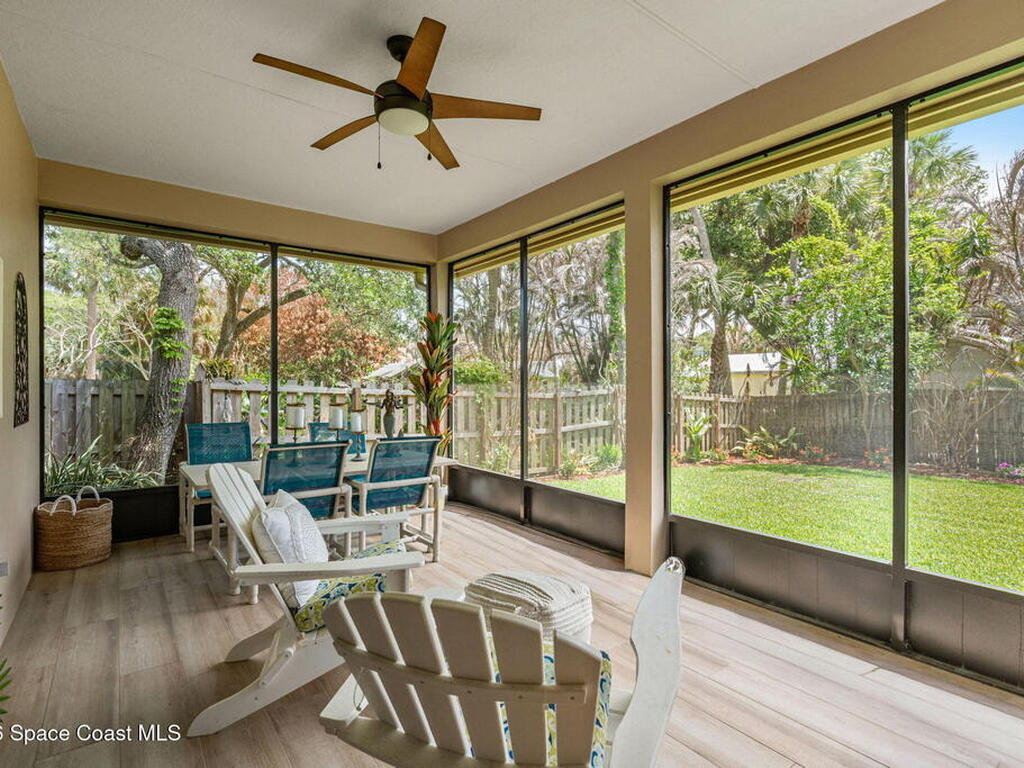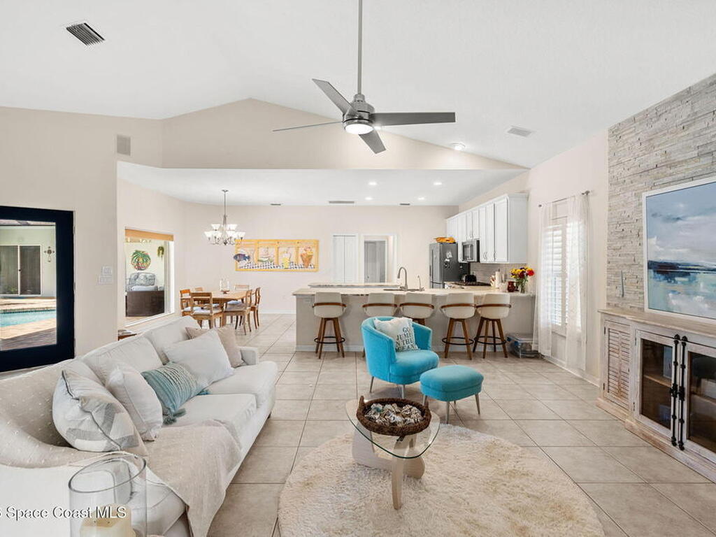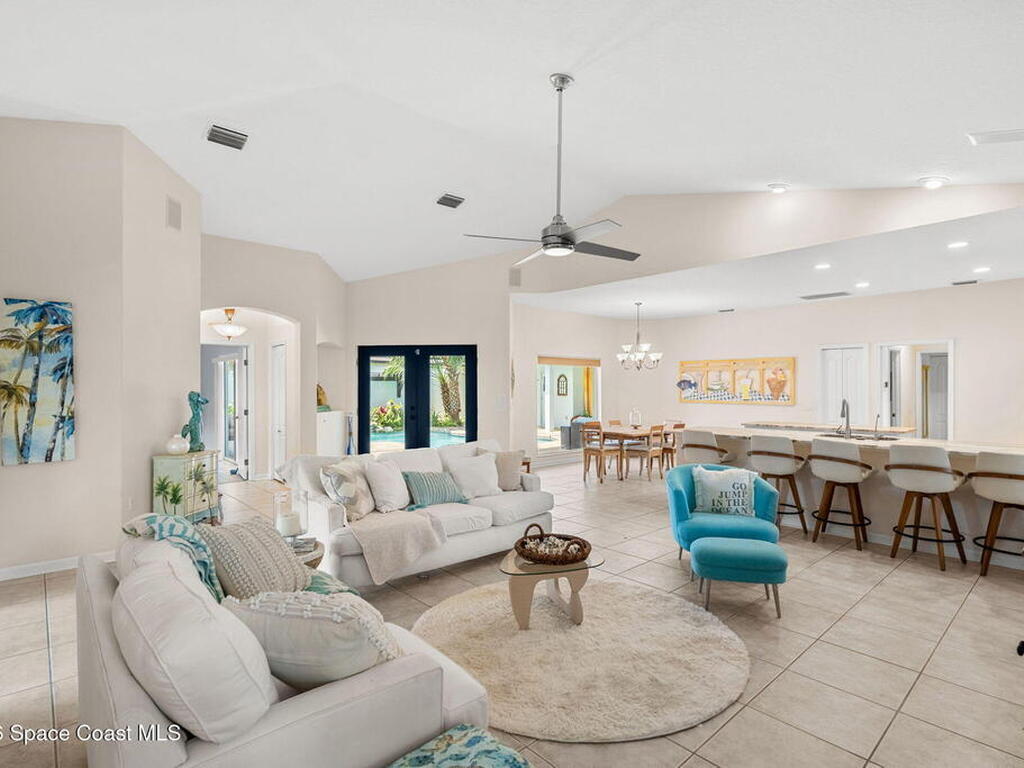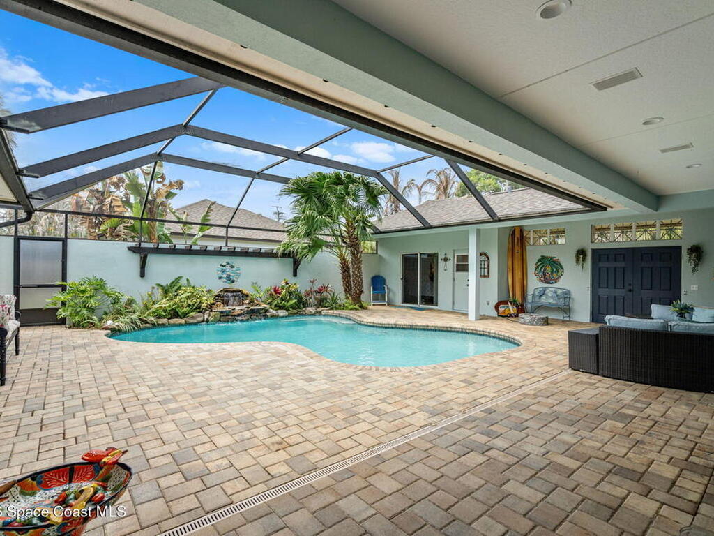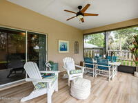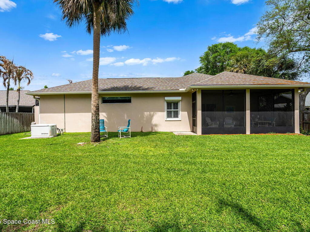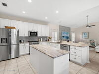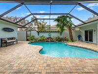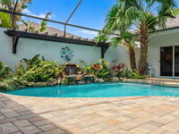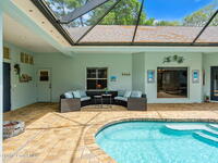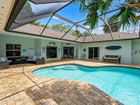 Private coastal oasis--this stunning courtyard pool home offers the ideal blend of comfort, style, and versatility. The main residence features 3 bedrooms and 2 baths with a bright, open floor plan, soaring vaulted ceilings, and seamless indoor-outdoor living. A separate guest suite with private entrance-- with its own bedroom/office and full bath--makes this home perfect for visitors, multi-generational living, or a private workspace. The spacious primary suite boasts a beautifully updated en-suite bath, creating a relaxing retreat. At the heart of the home, the renovated kitchen shines with a gas stove, custom cabinetry, quartz countertops, and a large island that flows into the dining area. Step outside to your enclosed saltwater pool paradise. The expansive covered lanai extends your living space year-round, perfect for entertaining or unwinding in the coastal breeze. Recent upgrades provide peace of mind, including a 2017 roof, 2018 HVAC, Generator, shutters, pool resurfacing.