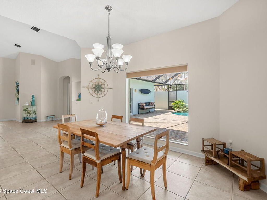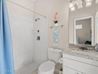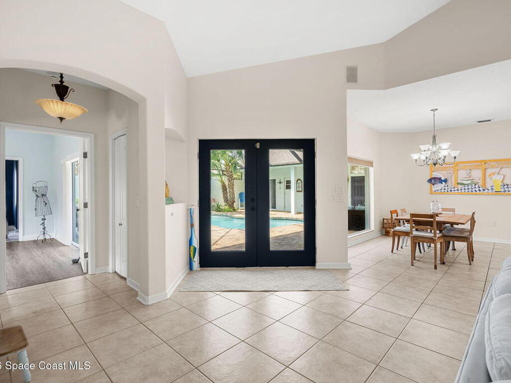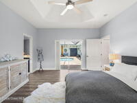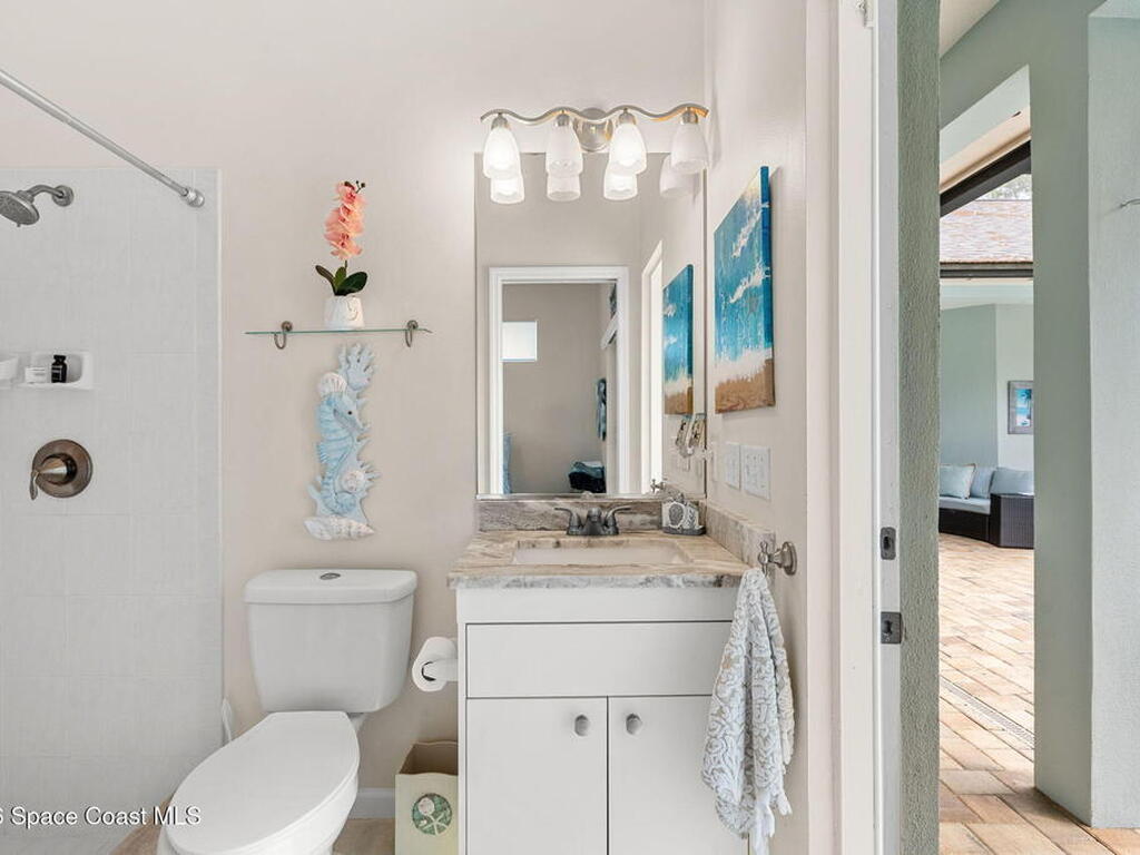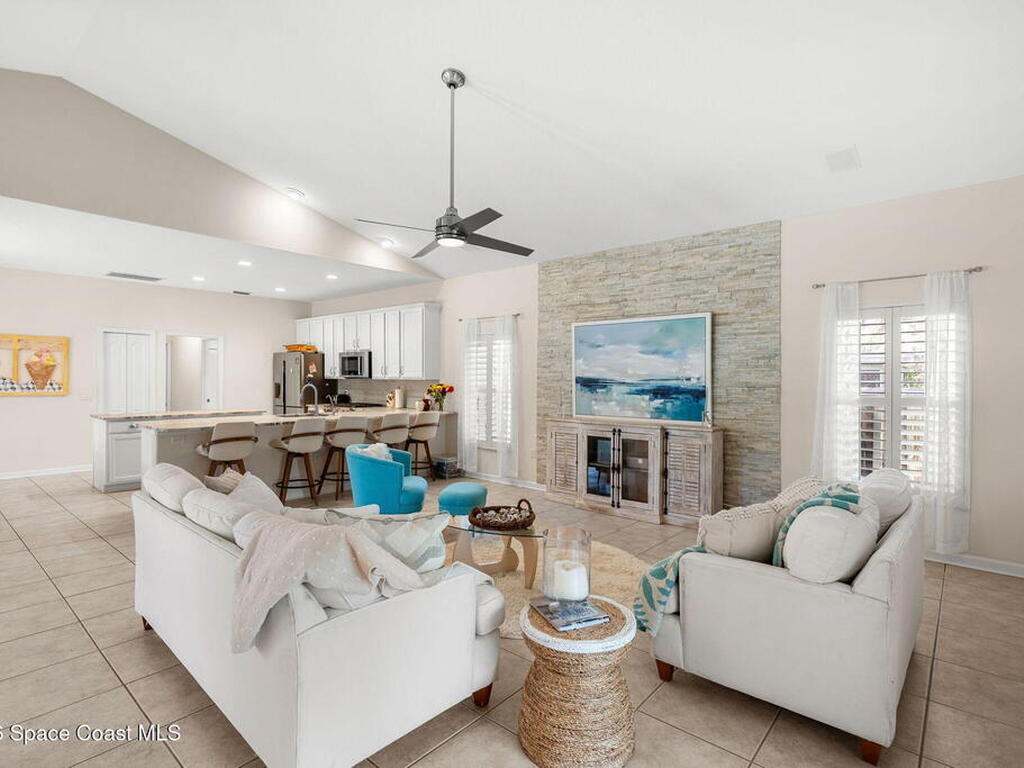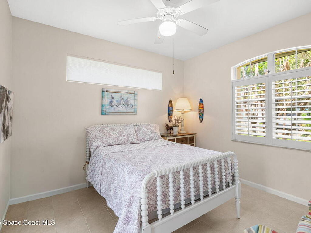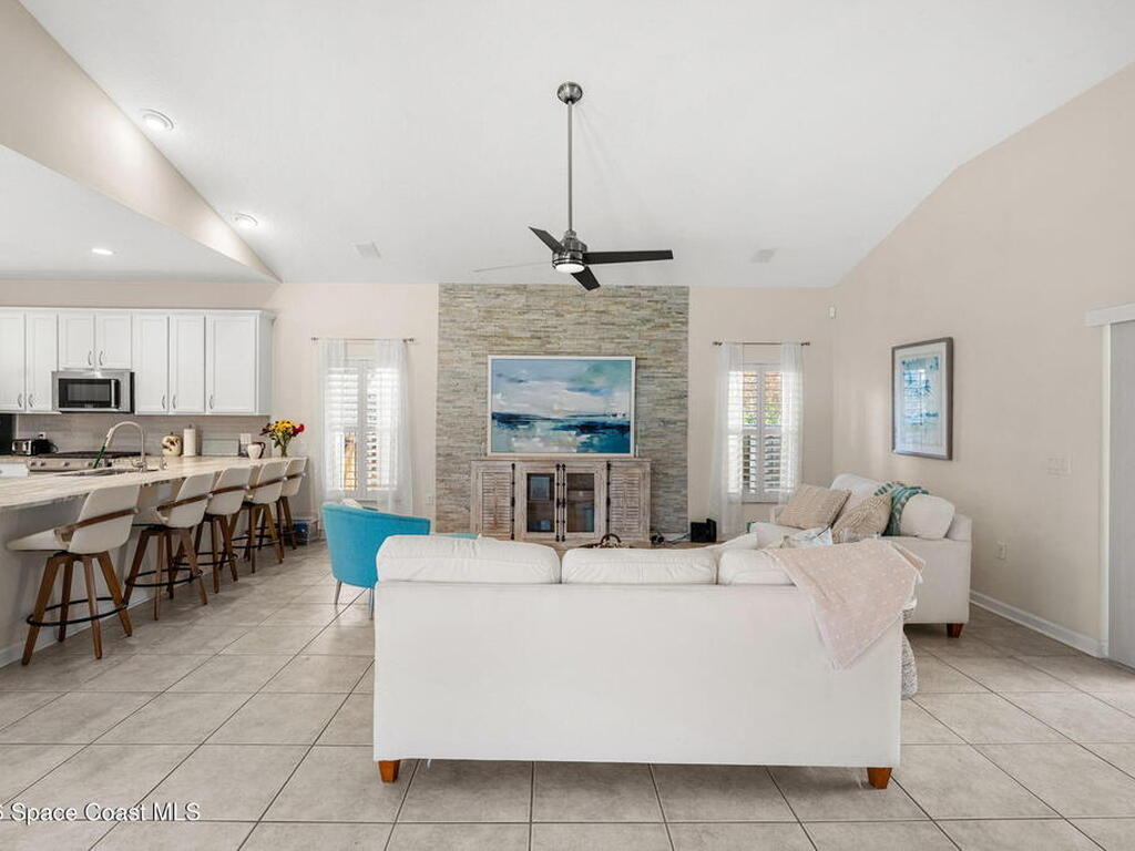 Private coastal oasis--this stunning courtyard pool home offers the ideal blend of comfort, style, and versatility. The main residence features 3 bedrooms and 2 baths with a bright, open floor plan, soaring vaulted ceilings, and seamless indoor-outdoor living. A separate guest suite with private entrance-- with its own bedroom/office and full bath--makes this home perfect for visitors, multi-generational living, or a private workspace. The spacious primary suite boasts a beautifully updated en-suite bath, creating a relaxing retreat. At the heart of the home, the renovated kitchen shines with a gas stove, custom cabinetry, quartz countertops, and a large island that flows into the dining area. Step outside to your enclosed saltwater pool paradise. The expansive covered lanai extends your living space year-round, perfect for entertaining or unwinding in the coastal breeze. Recent upgrades provide peace of mind, including a 2017 roof, 2018 HVAC, Generator, shutters, pool resurfacing.