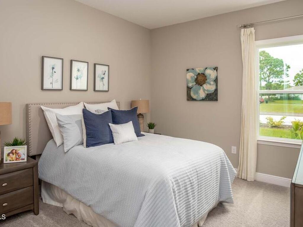 Under-Construction. Nestled in a desirable Palm Bay location on an expansive homesite, The Harmony showcases refined craftsmanship, timeless curb appeal, and a smart, spacious layout designed for modern living. The striking stone-accent exterior, architectural shingles, and front covered porch set the stage for a home built with both style and lasting durability.Step inside to discover 9'4'' ceilings, tray ceilings with crown molding in the great room and primary bedroom, deluxe interior trim, and upgraded door hardware throughout. The open-concept great room flows seamlessly into a flexible space and dining area, creating an inviting atmosphere for entertaining or relaxing. Soft taupe carpet in the bedrooms complements 6x36 ceramic plank tile throughout the main living areas, while upgraded custom interior paint adds warmth and sophistication.The kitchen is a chef's dream with Bianco Antico granite countertops, shaker cabinets, and a large island with additional seating.