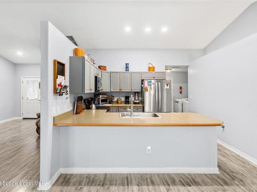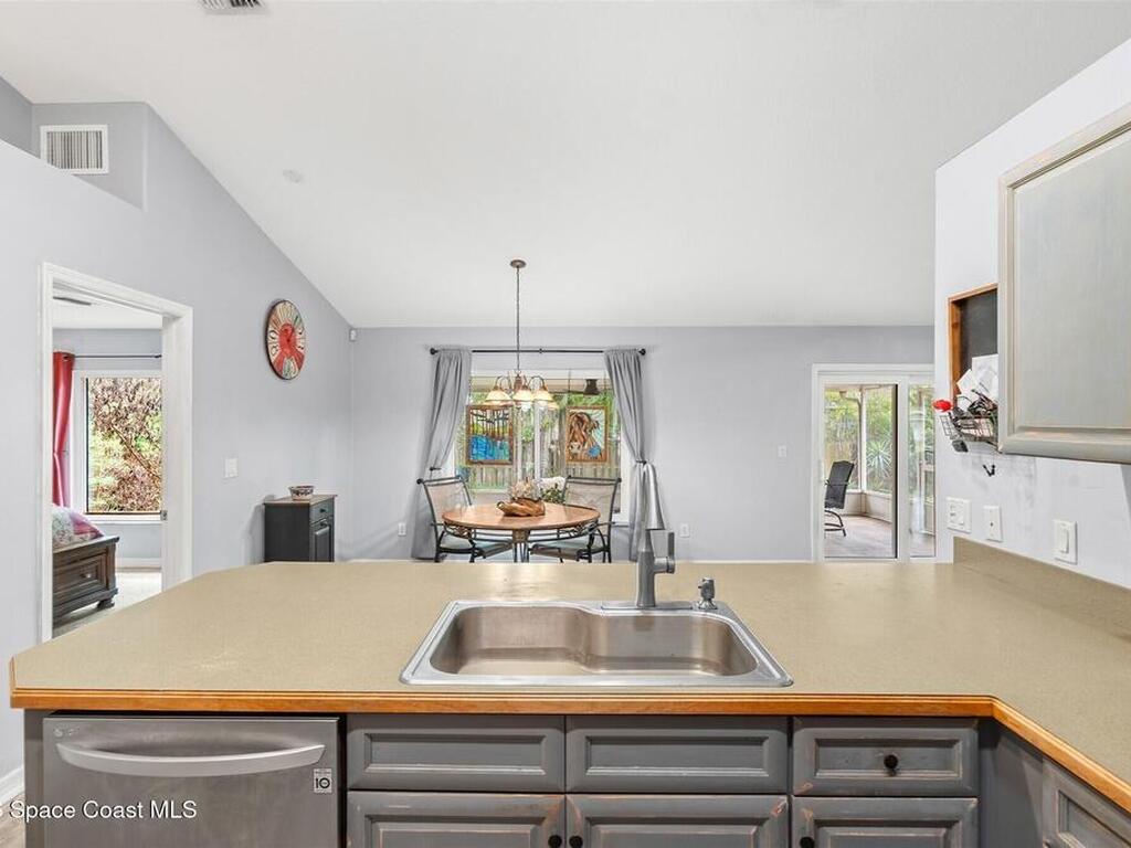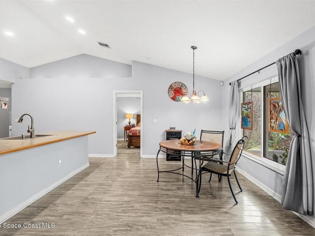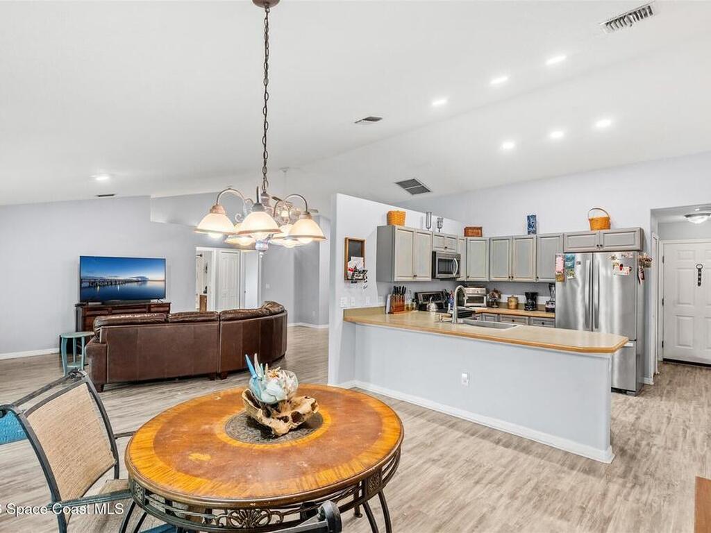 Welcome to this beautifully maintained home in desirable Port St. John! Featuring a spacious open floor plan, this property offers both comfort and functionality, perfect for everyday living and entertaining. The interior boasts stylish Pergo flooring throughout the main living areas and bedrooms, with durable tile in the bathrooms for easy maintenance. Major updates provide peace of mind, including a 2018 roof, 2025 air conditioning system, a 2023 water heater, and impact windows throughout the entire home for added security and energy efficiency. Step outside to enjoy the large, covered patio overlooking a fully fenced backyard with plenty of space for pets or play. Irrigation is controlled by a well system to keep those water bills low. An extended driveway continues into the side yard, offering ample room to park boats, trailers, or recreational vehicles. This home combines modern updates, thoughtful features, and outdoor versatility in a convenient location.